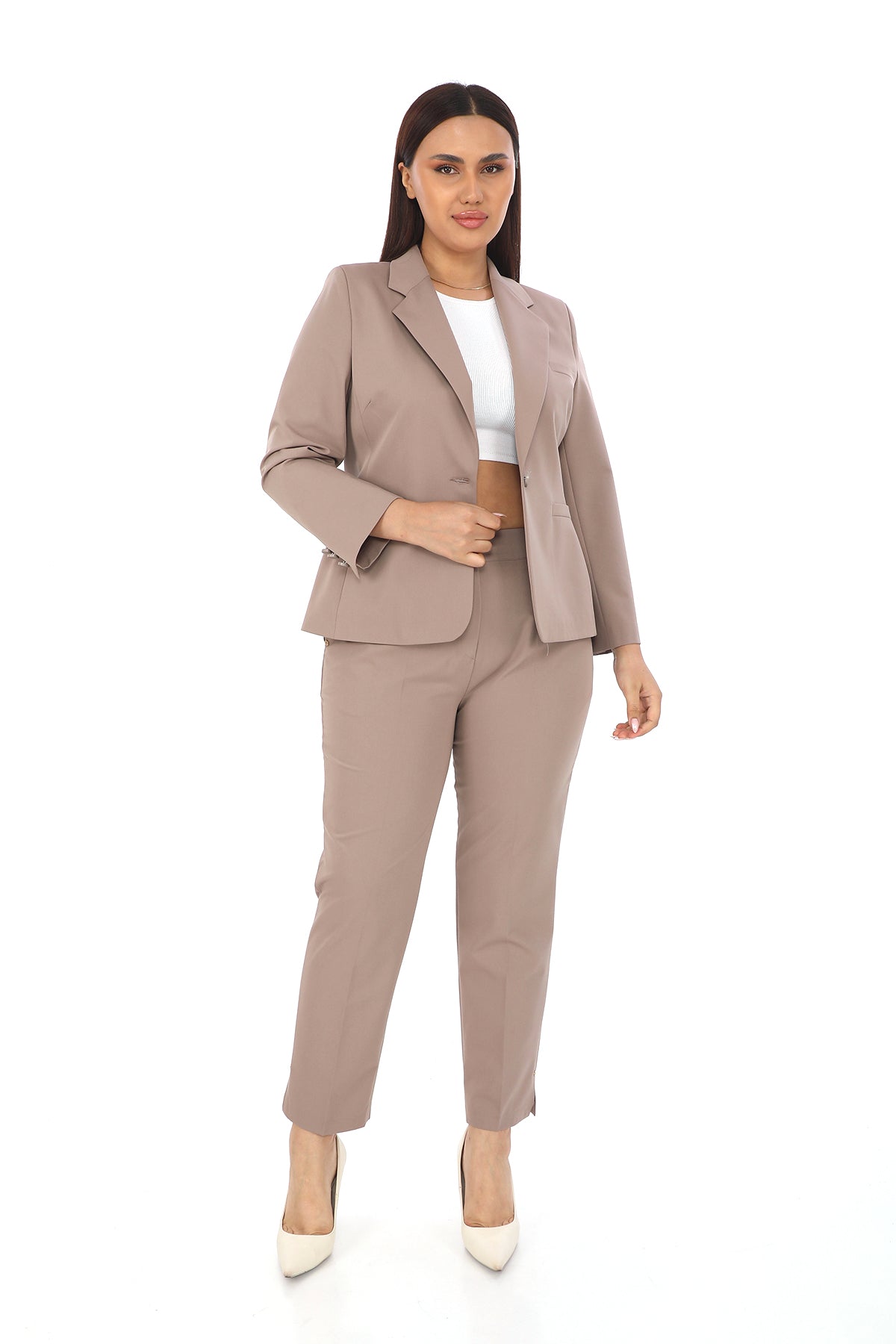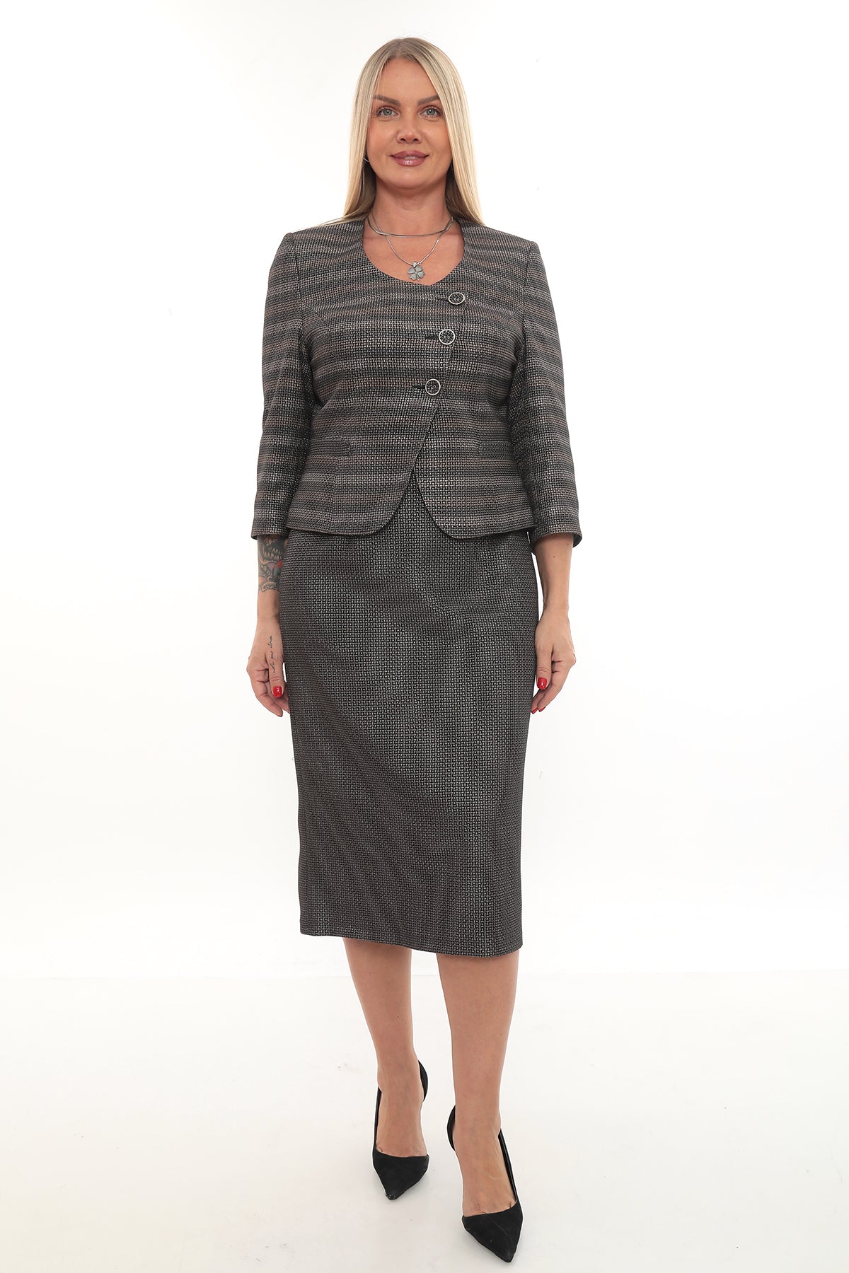 Uzun Kollu Ceket ve Etek Takımı – Tek Düğme Detaylı