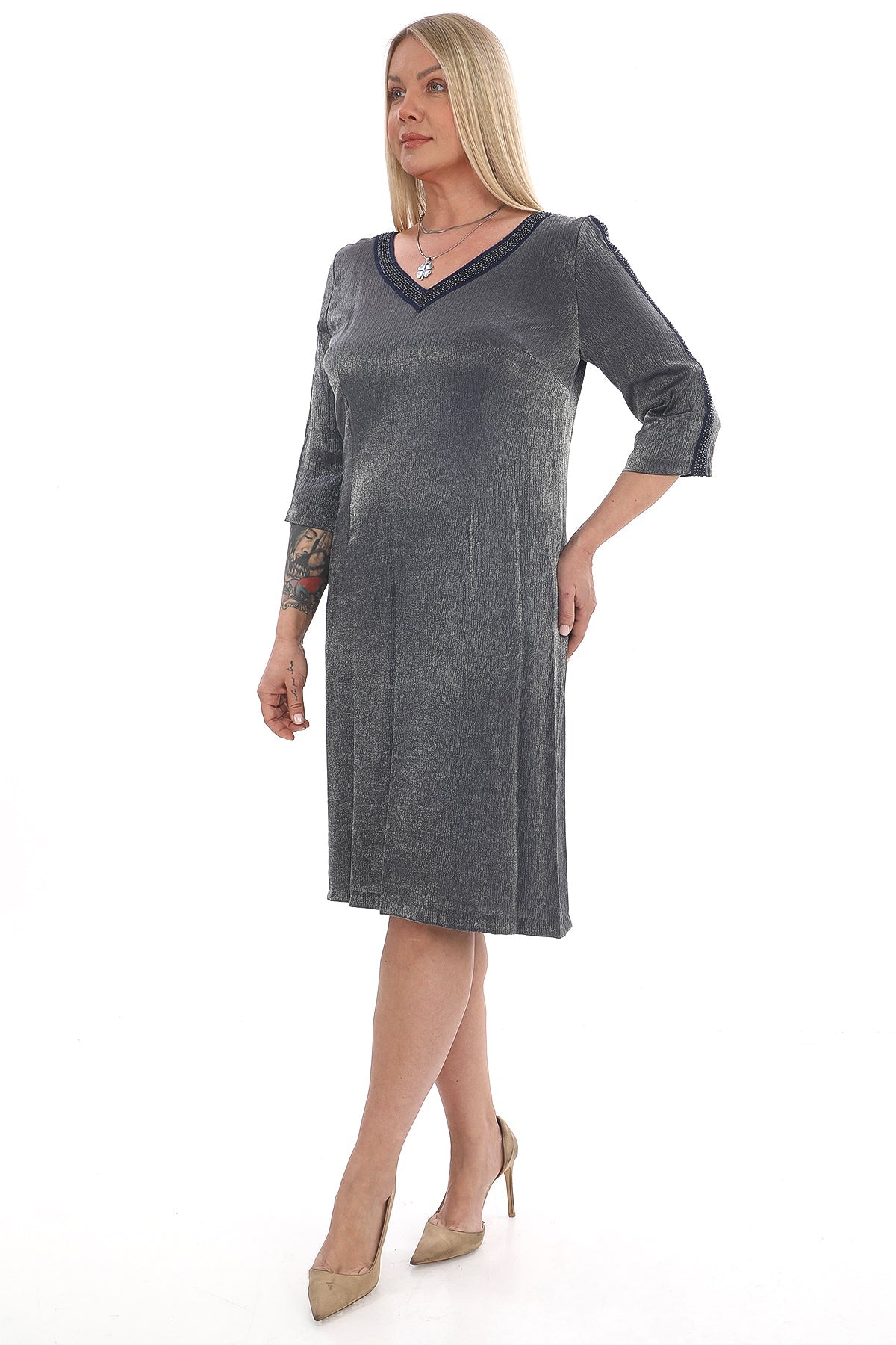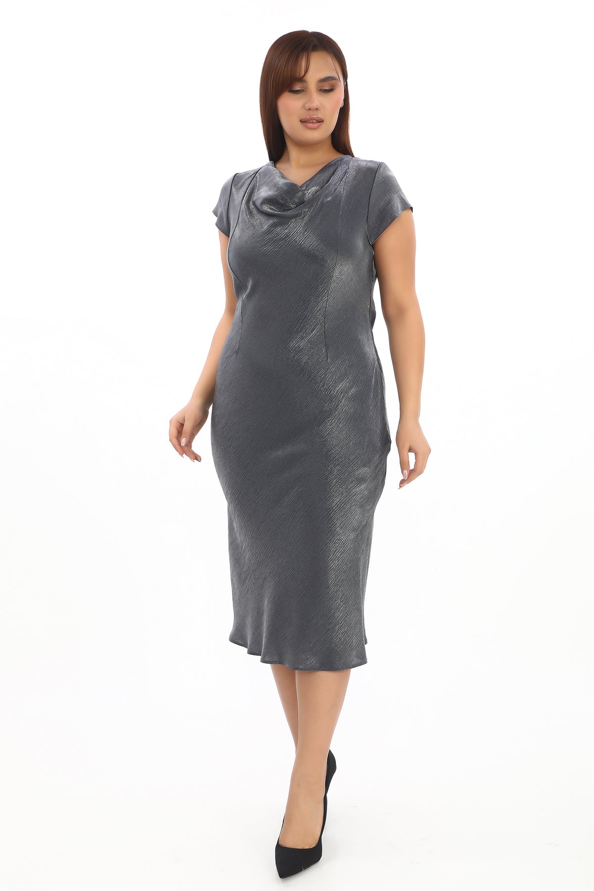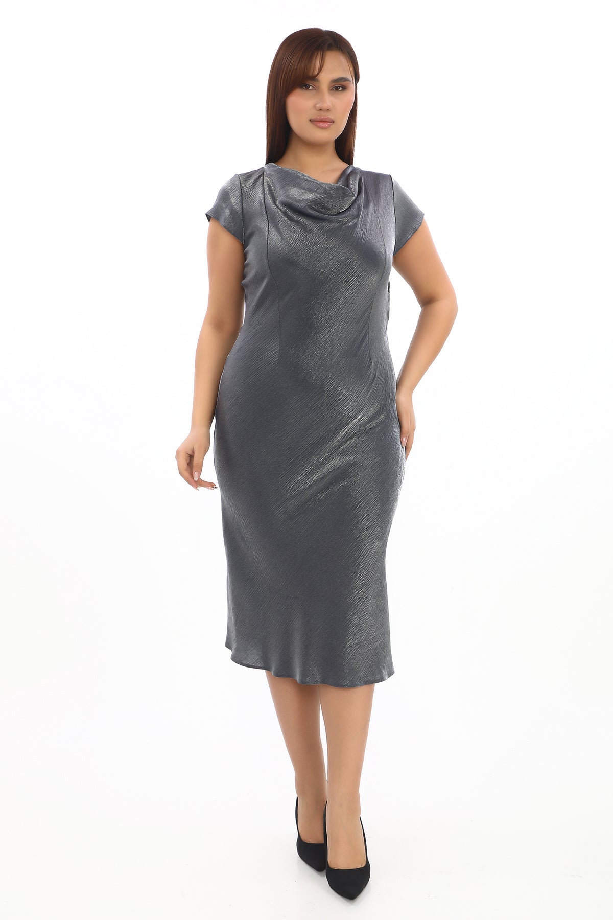 Işıltılı Drapeli Kısa Kollu Diz Altı Elbise