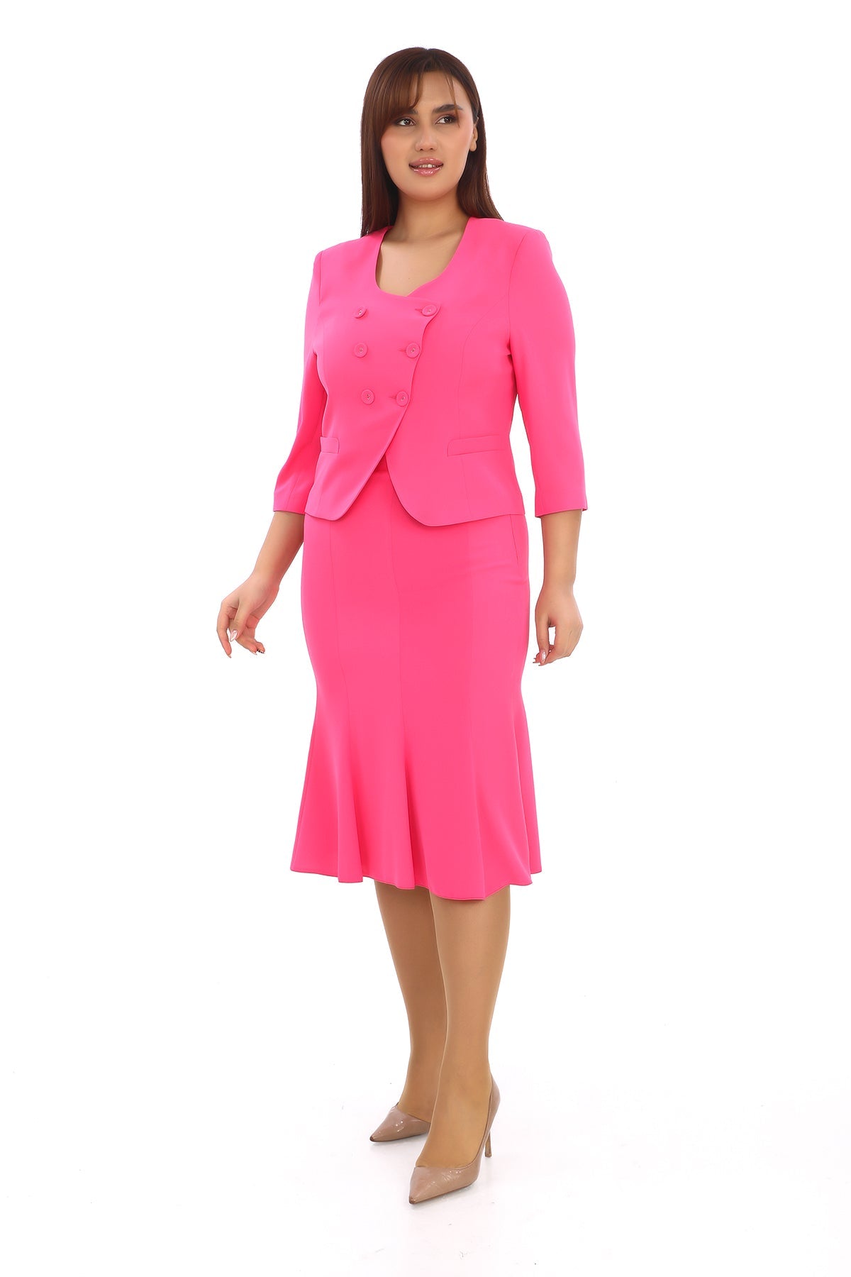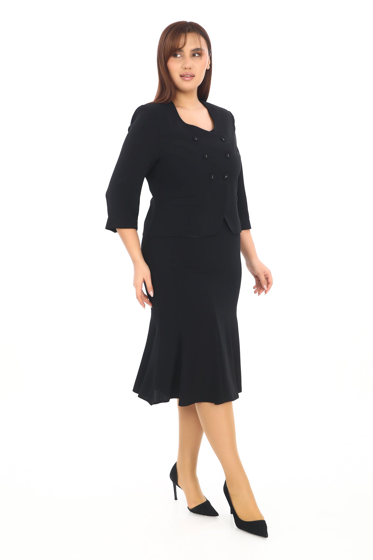 Düğmeli U Yaka Ceket ve Pileli Etek İkili Kadın Takım