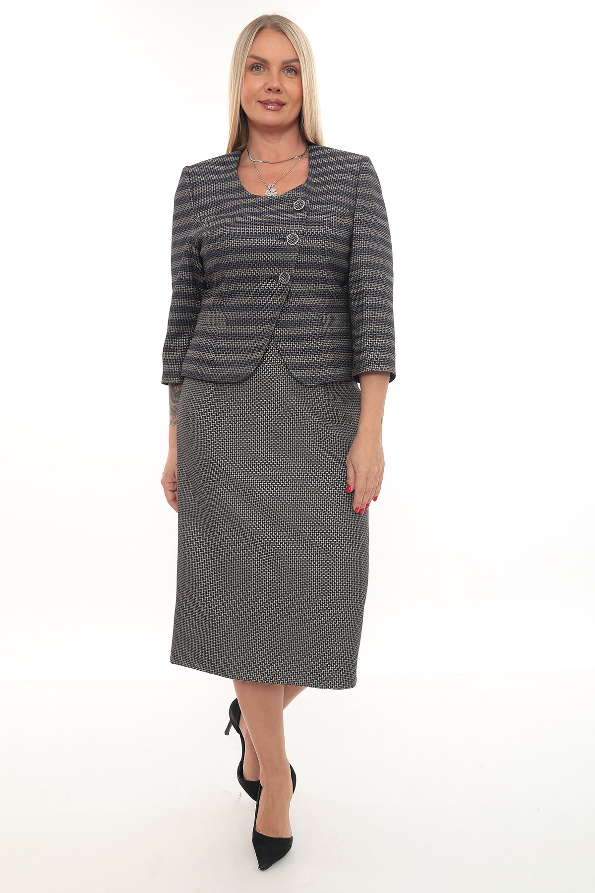 Uzun Kollu Ceket ve Etek Takımı – Tek Düğme Detaylı