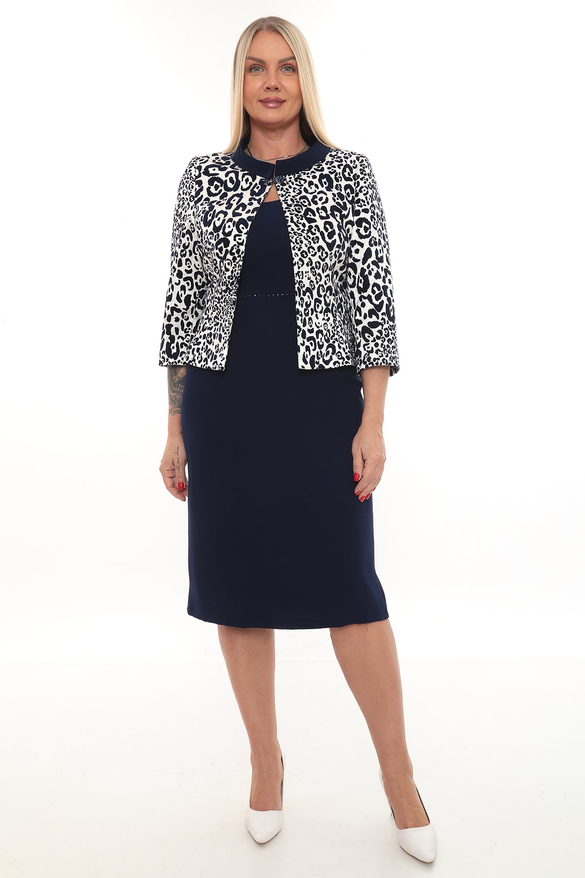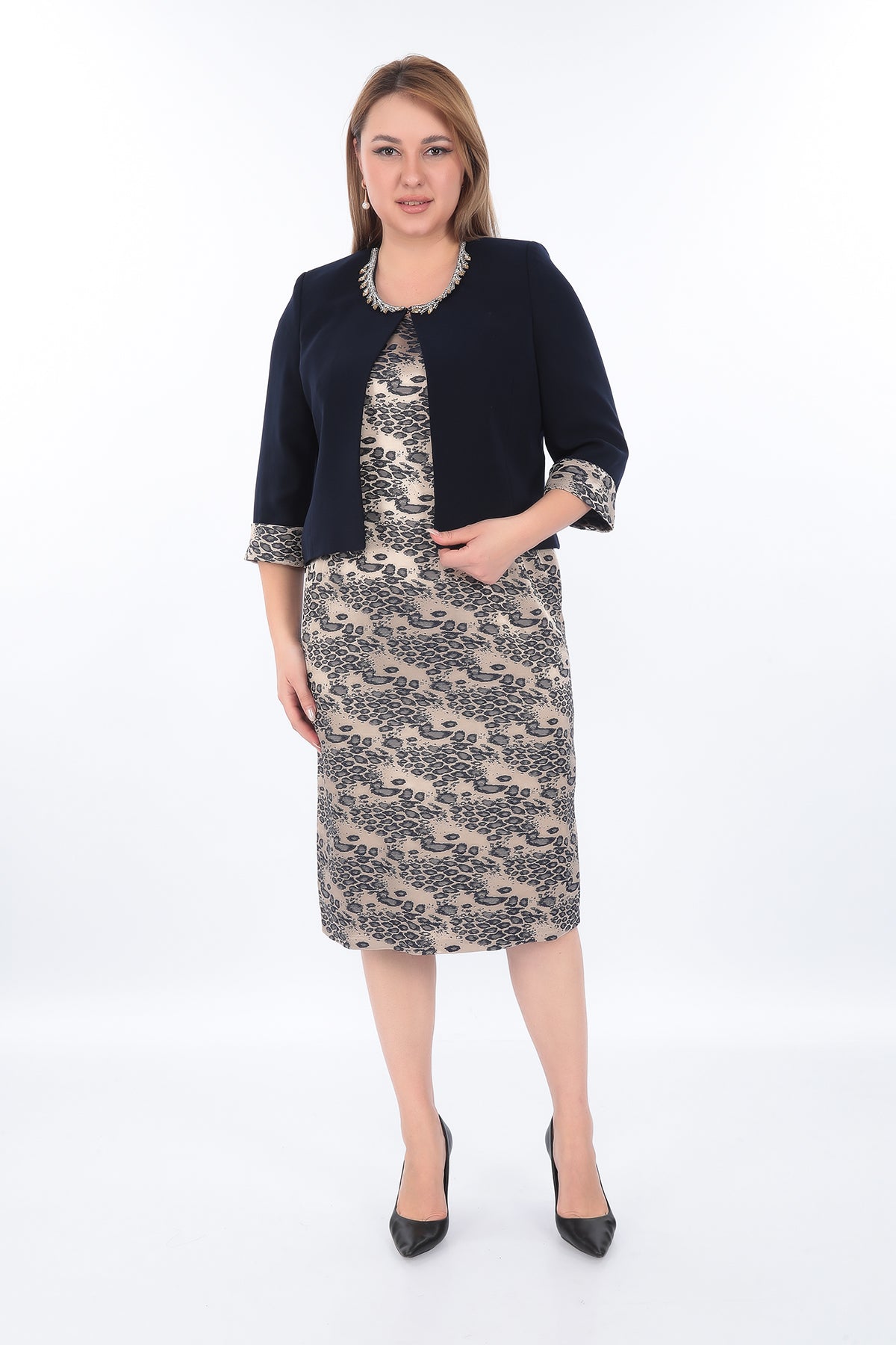 Lacivert Elbise ve Leopar Desenli Ceket Takım
