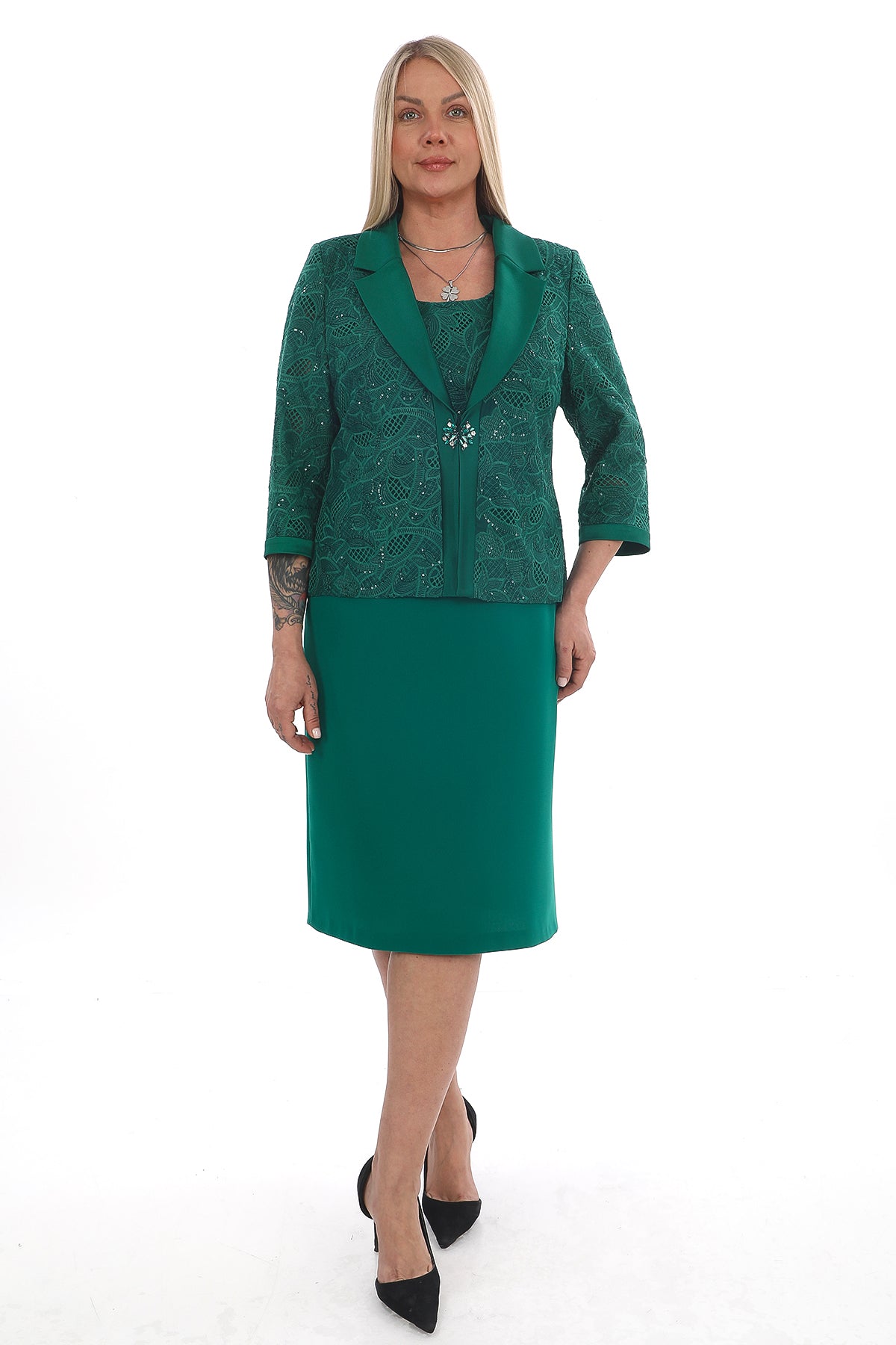 Broş Detaylı Elbise ve Ceket Takım