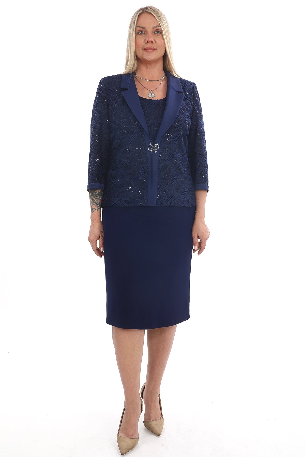 Lacivert Dantel Detaylı Ceketli Elbise Takımı – Büyük Beden Abiye