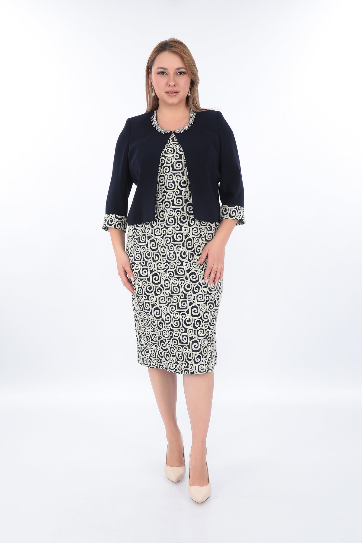 Ürün Açıklaması Şıklığı ve rahatlığı bir arada sunan lacivert ceketli elbise takım, özel günlerde zarif bir görünüm sağlar. Düz lacivert kısa ceket, krem üzerine geometrik spiral...