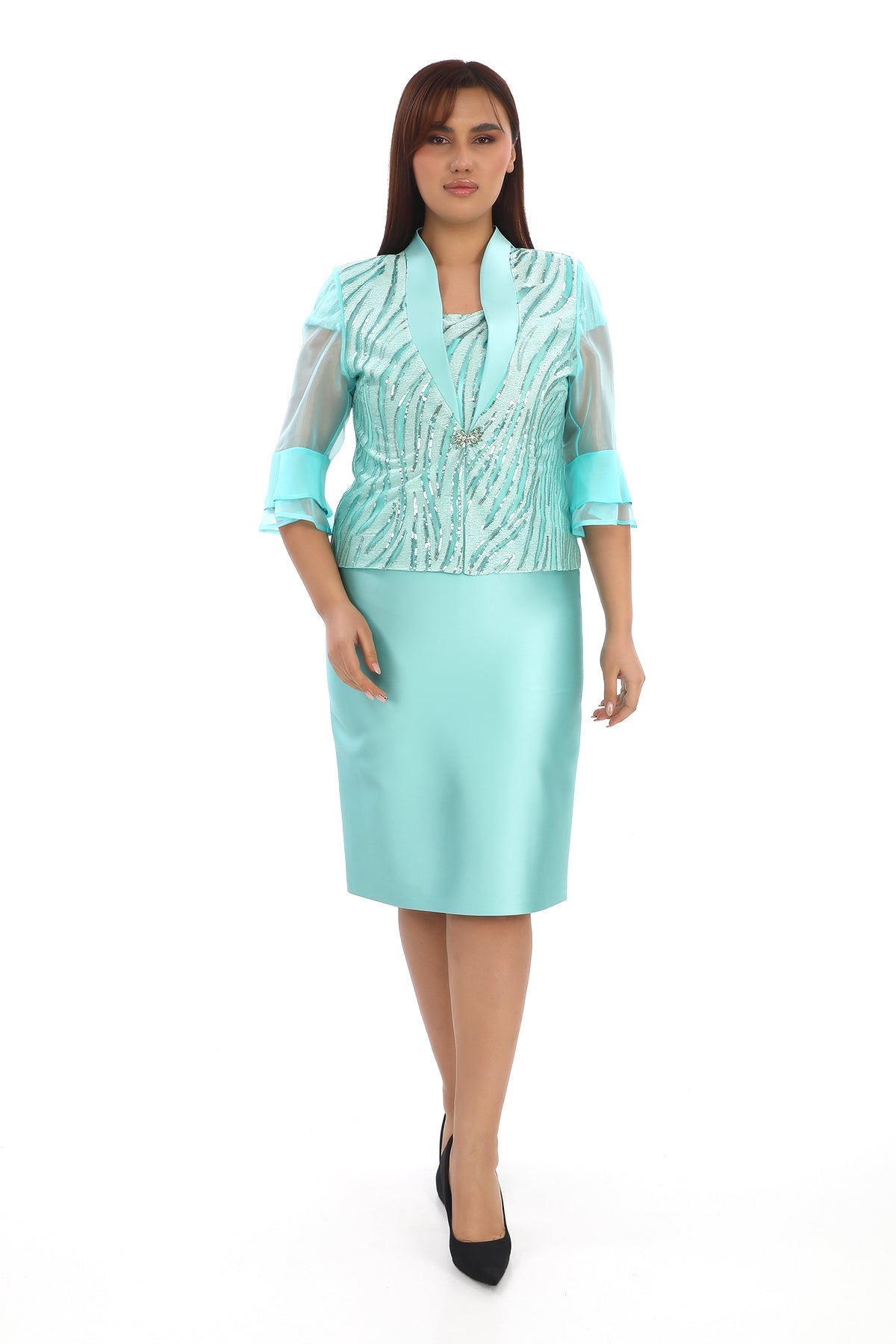 Renk Seçeneği: MintBeden Seçenekleri: 42 – 48 Ürün Özellikleri: Diz altı uzunluğunda sade elbise Üzerinde simli desen bulunan şık ceket Şifon transparan kollar ve fırfır detaylı...