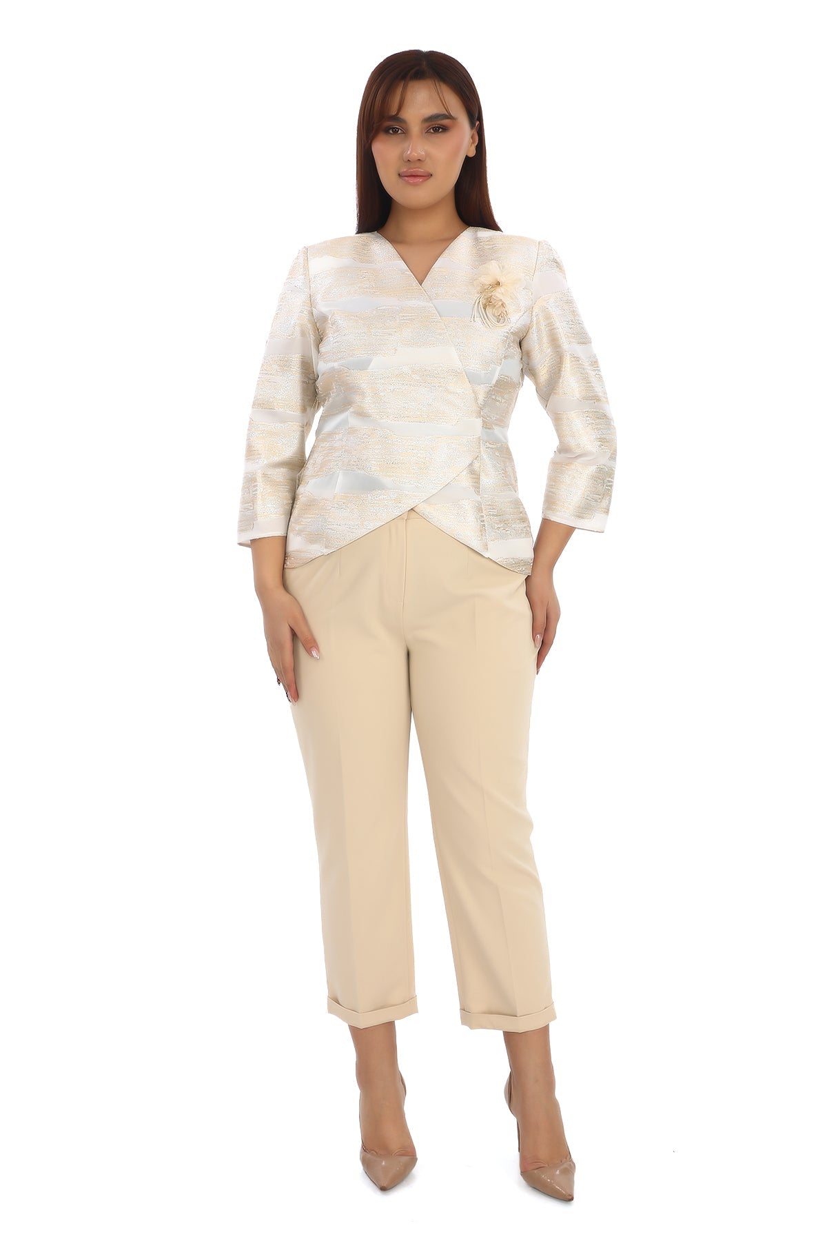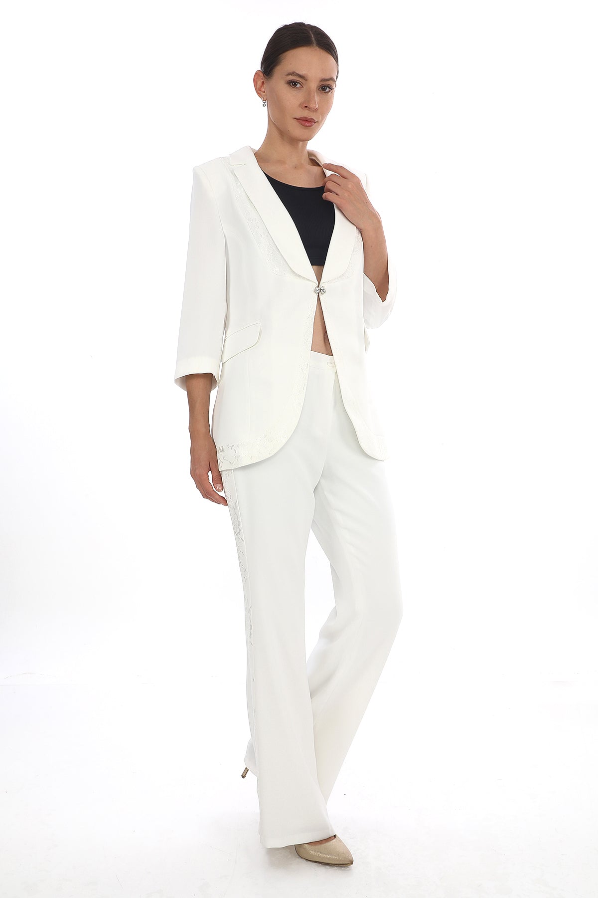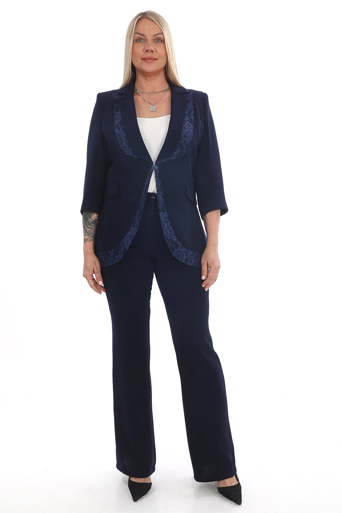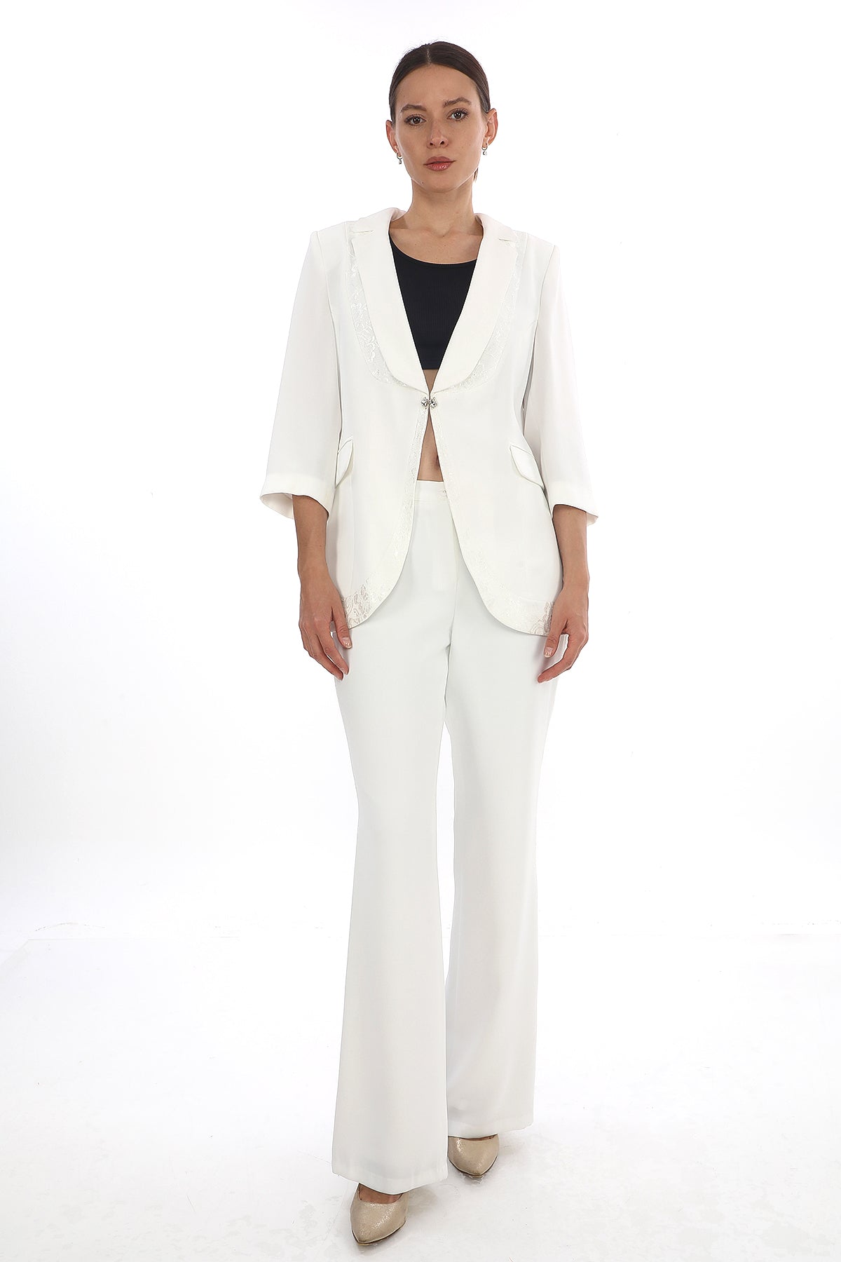 Dantel Jakar Kumaş Saten Yaka Ceket ve Pantolon İkili Kadın Takım
