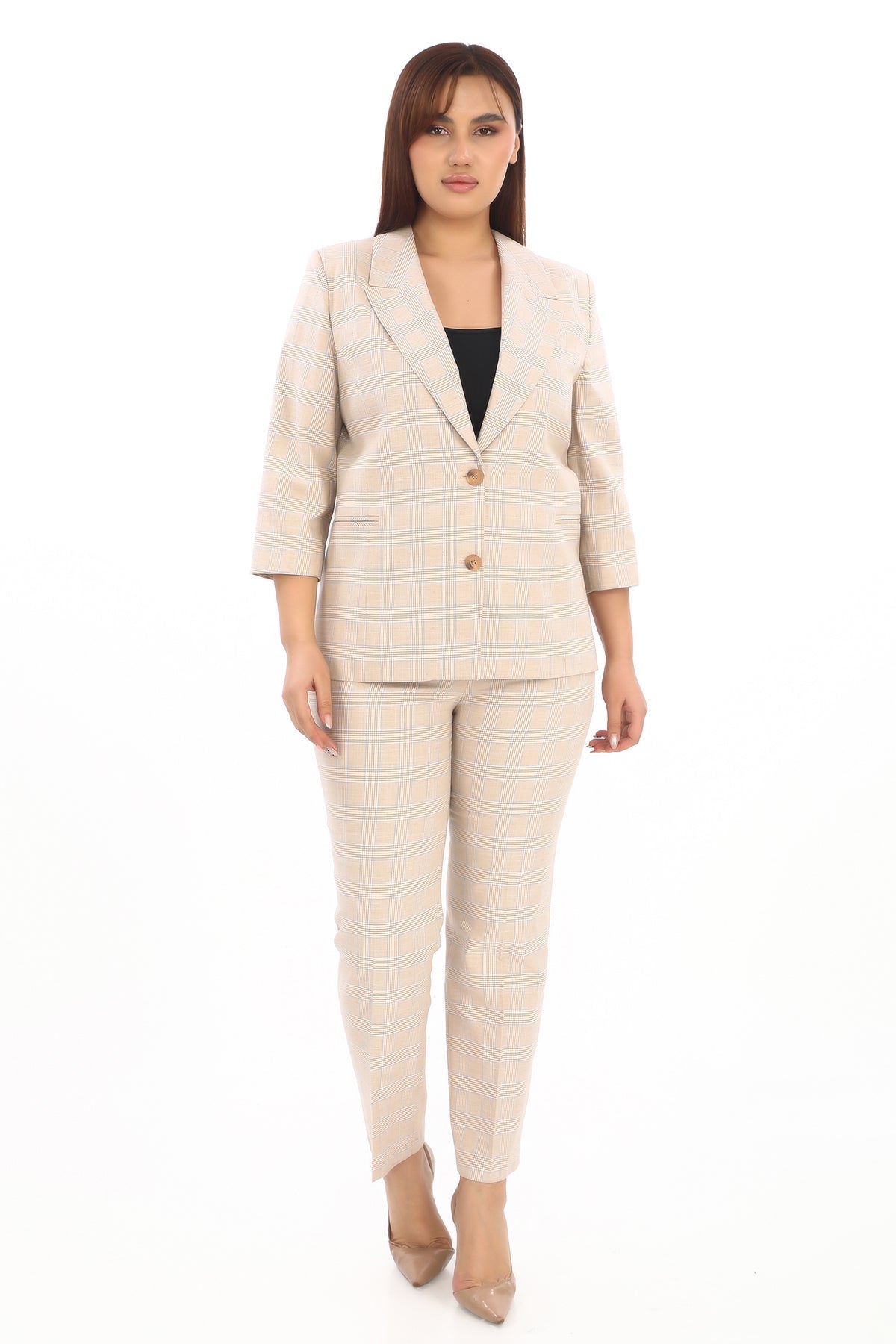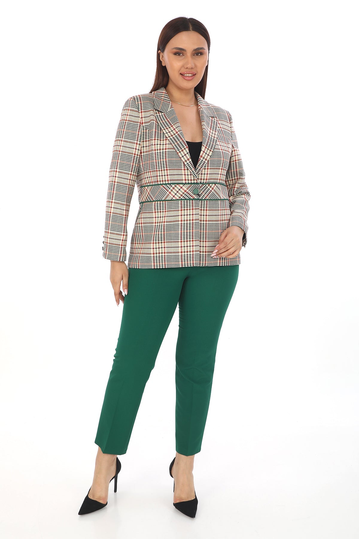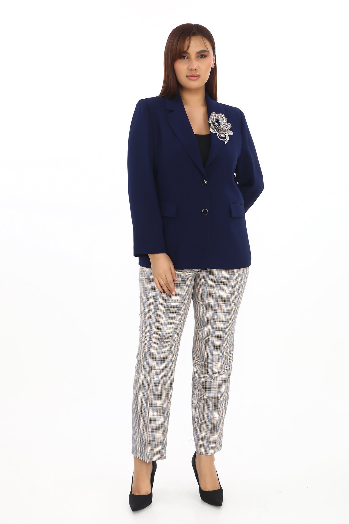 İki Düğmeli Çiçek Yakalı Ceket ve Ekose Pantolon İkili Kadın Takım