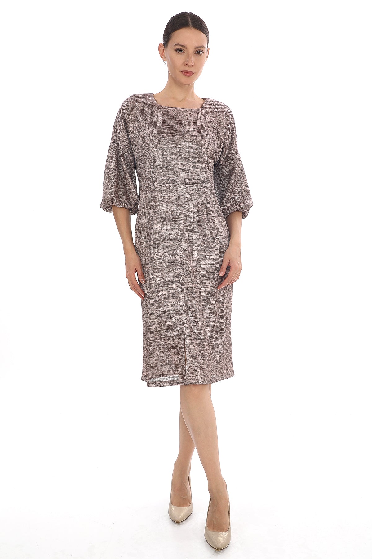 Şık Diz Boyu Balon Kol Elbise