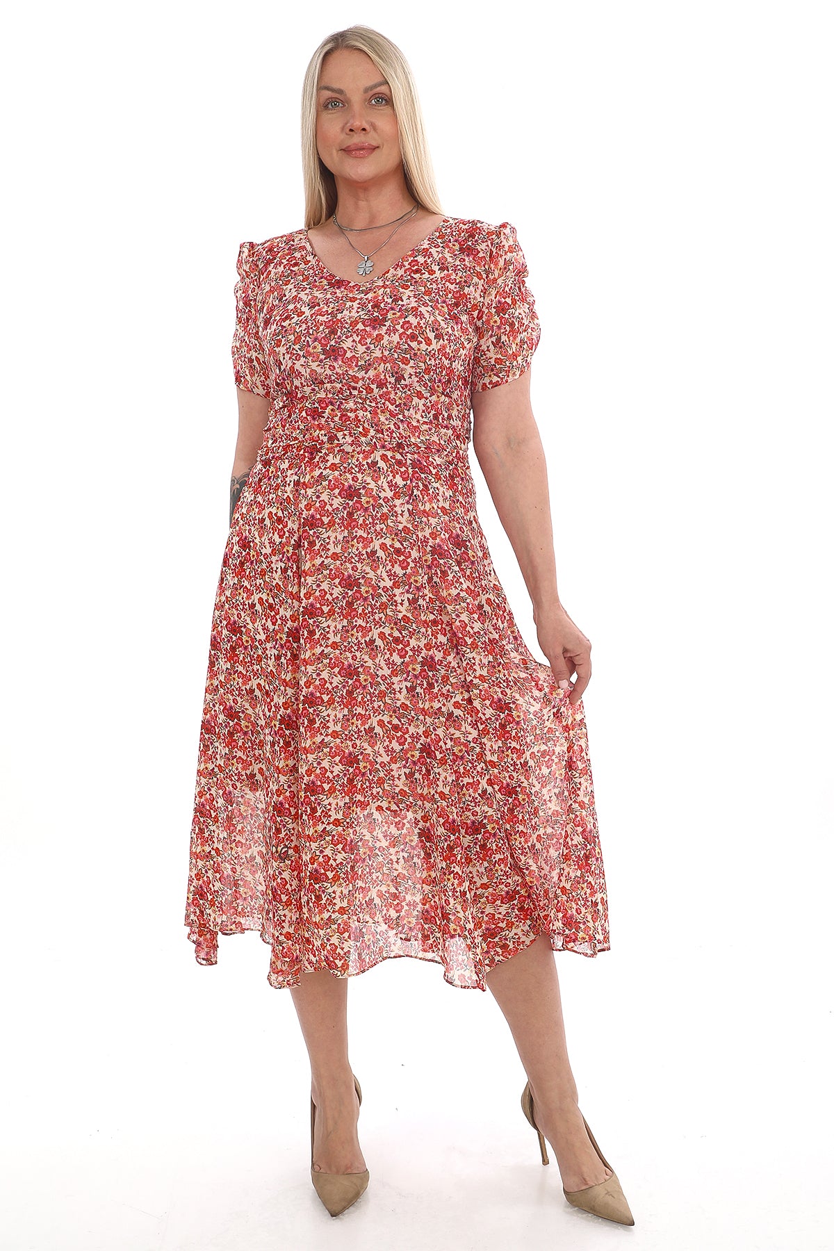 Ürün Özellikleri: Model: Çiçek desenli midi boy elbise Renk: Kırmızı – Beyaz – Pembe tonlarında floral desen Kumaş: İnce, hafif ve nefes alan şifon Kol: Kısa...