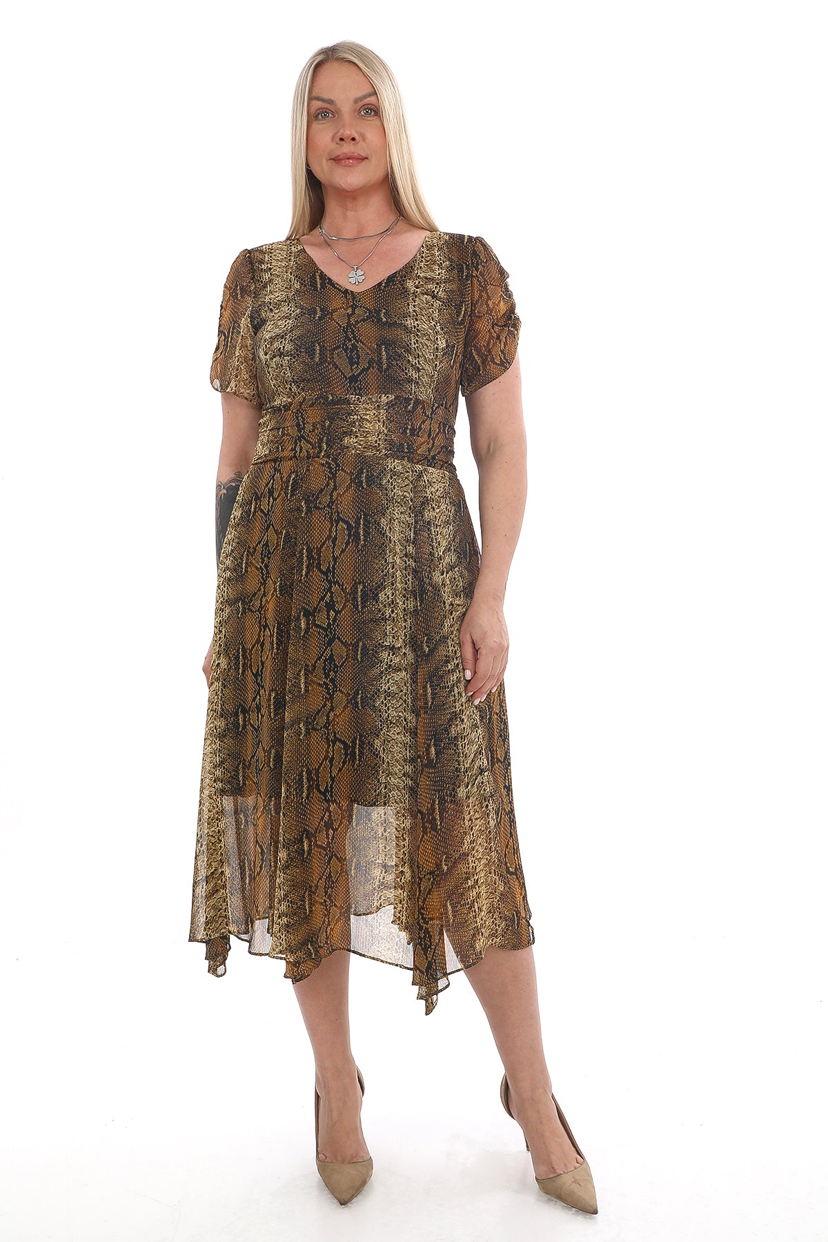 Ürün Açıklaması: Modern ve feminen tasarımıyla dikkat çeken bu şifon elbise, ön kısmındaki leopar deseni ve yanlardaki transparan detaylarıyla şıklığı ön plana çıkarır. Rahat kalıbı sayesinde...