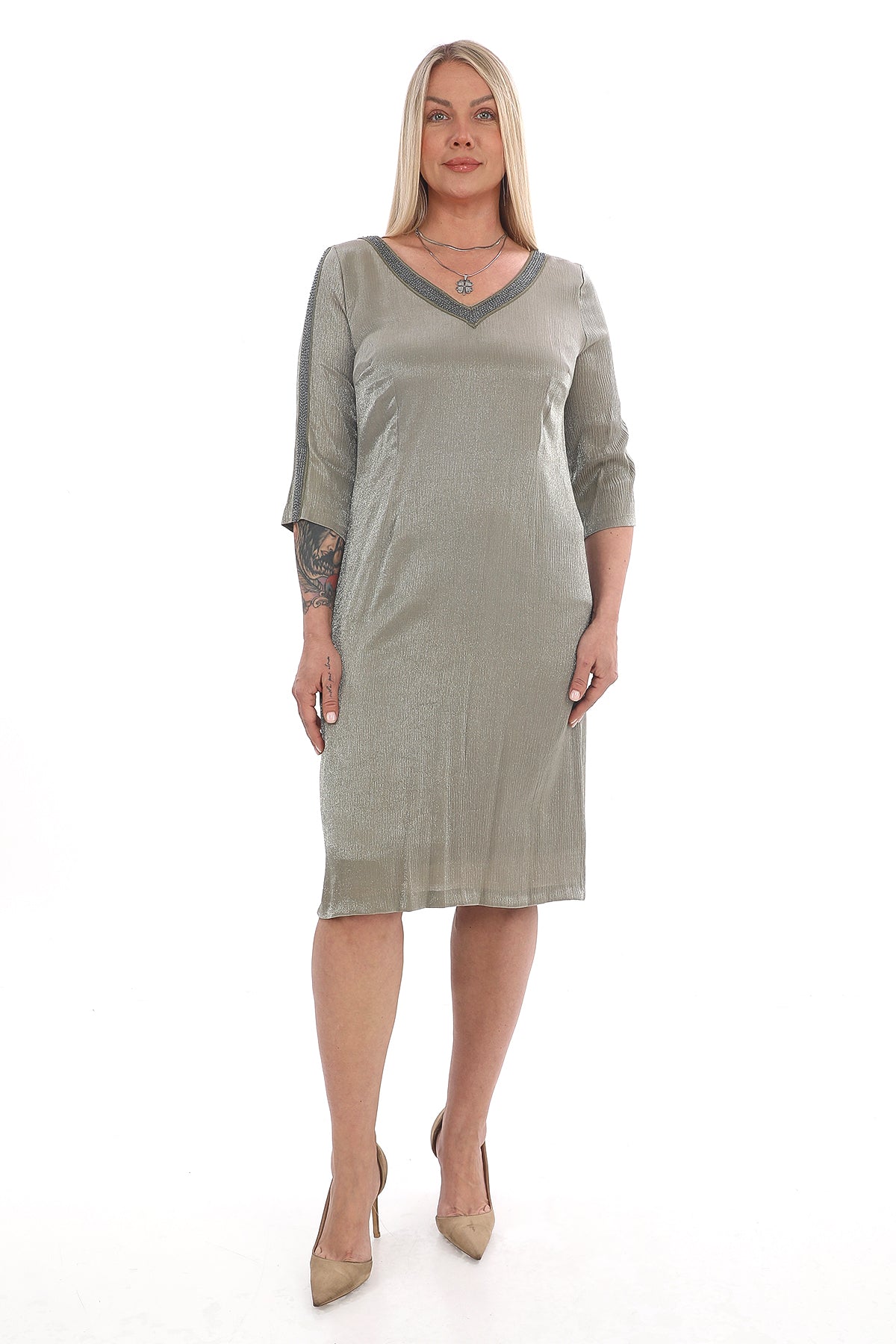 Kemerli Metalik Haki Elbise