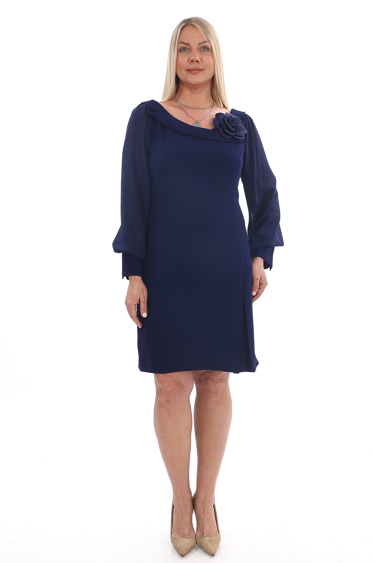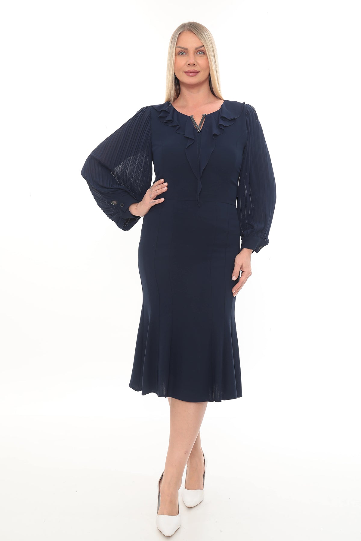 Ürün Açıklaması: Yeni sezonun zarafetini yansıtan bu lacivert elbise, fuşya elbise, siyah elbise ve mavi elbise seçenekleriyle gardıropların favorisi olmaya aday! Şifon kollu, volan yaka detaylı...