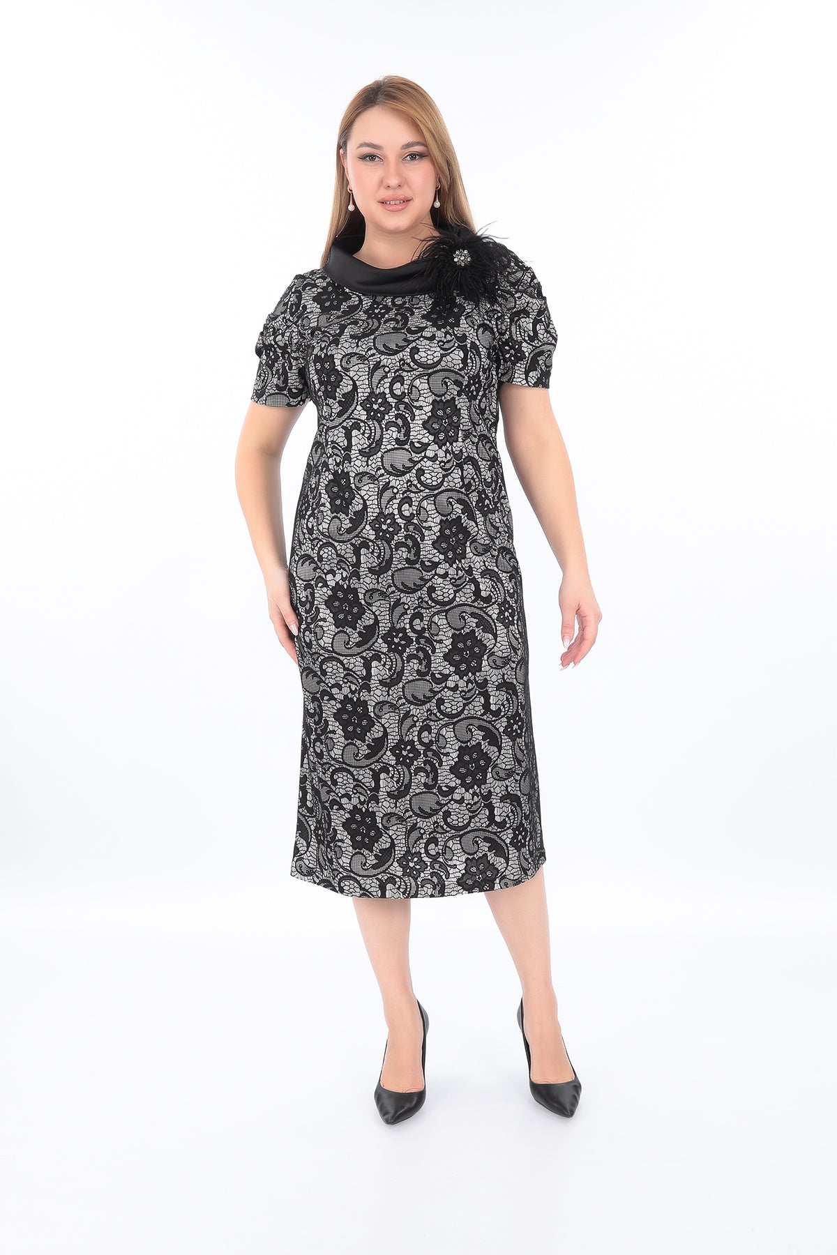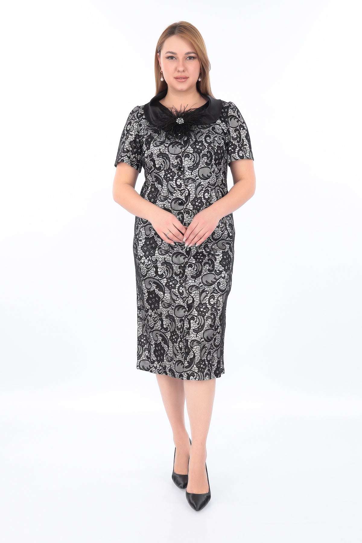 Ürün Açıklaması: Zarafeti ve asaleti bir araya getiren siyah ve Krem Siyah desenli elbise, özel davetlerden ofis kombinlerine kadar birçok ortamda şıklığı garantiler.Gösterişli saten yakası, ortasında...