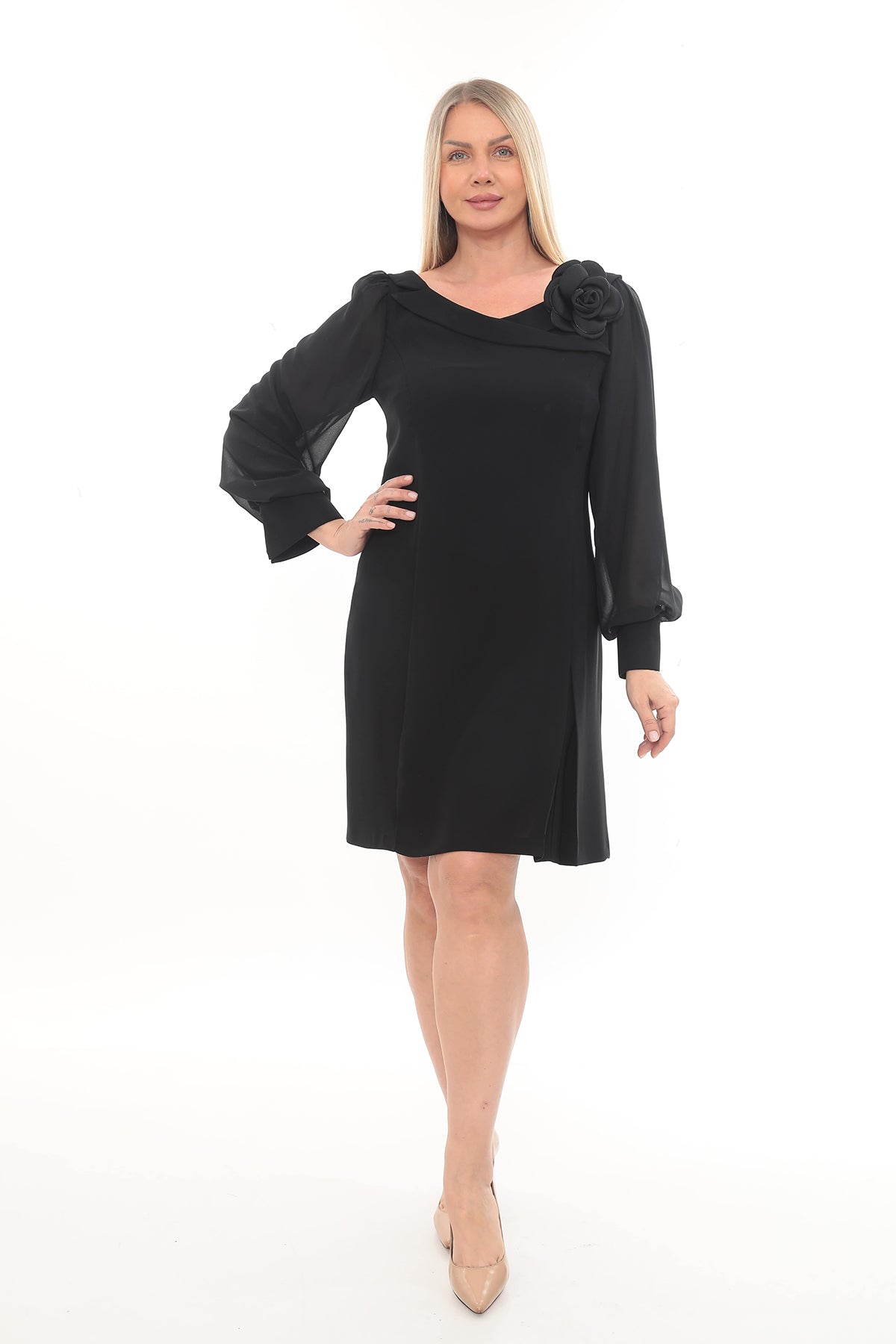 Şifon Kol Detaylı Çiçek Aksesuarlı Elbise