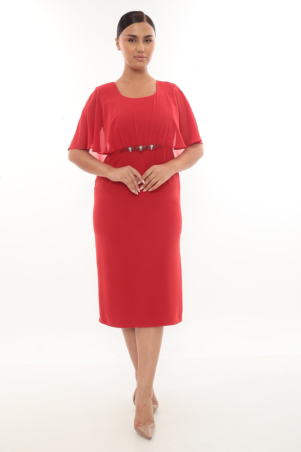 Ürün Açıklaması: Zarif taş detayı ve şifon kollarıyla dikkat çeken elbise, nişan, söz ve özel davetler için şık bir seçimdir. Ürün Özellikleri: Diz altı boy Bel...