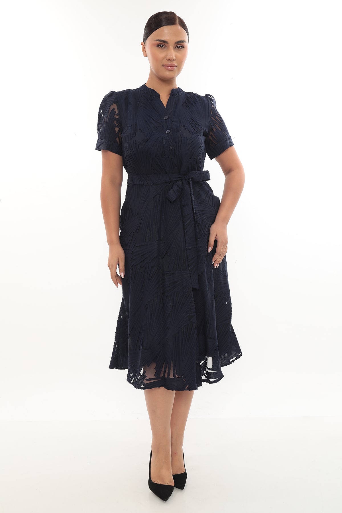 Ürün Açıklaması: Zarif, sade ama fark yaratan bir elbise arıyorsanız bu model tam size göre! Kısa kollu, lacivert midi elbise; göğüs kısmındaki taş detaylı minik pencere...