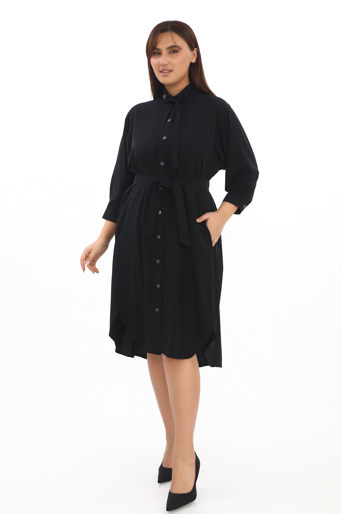 Siyah Kemerli Şık Midi Elbise – 42-48 Beden
