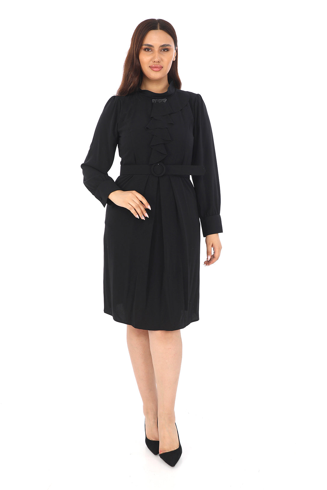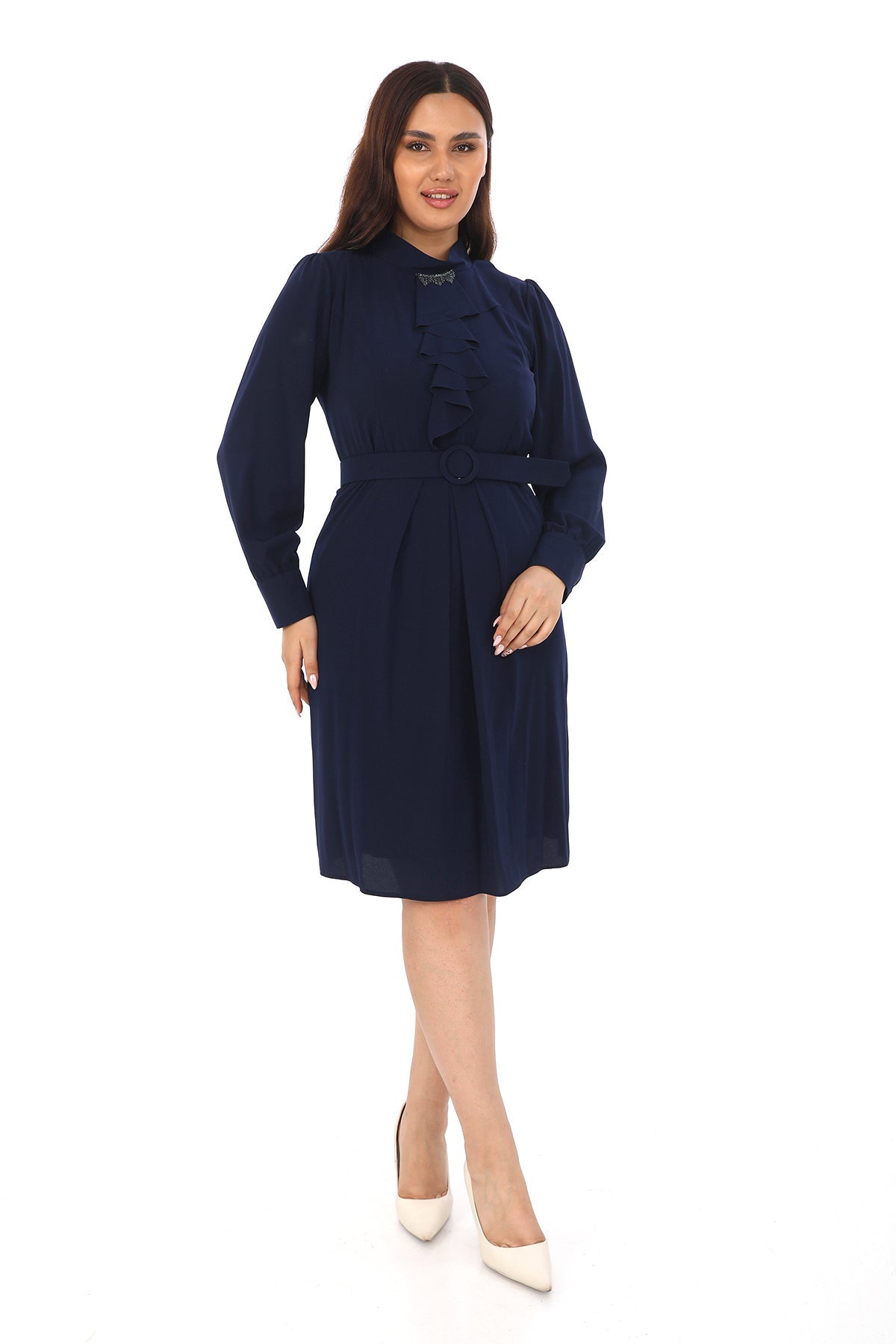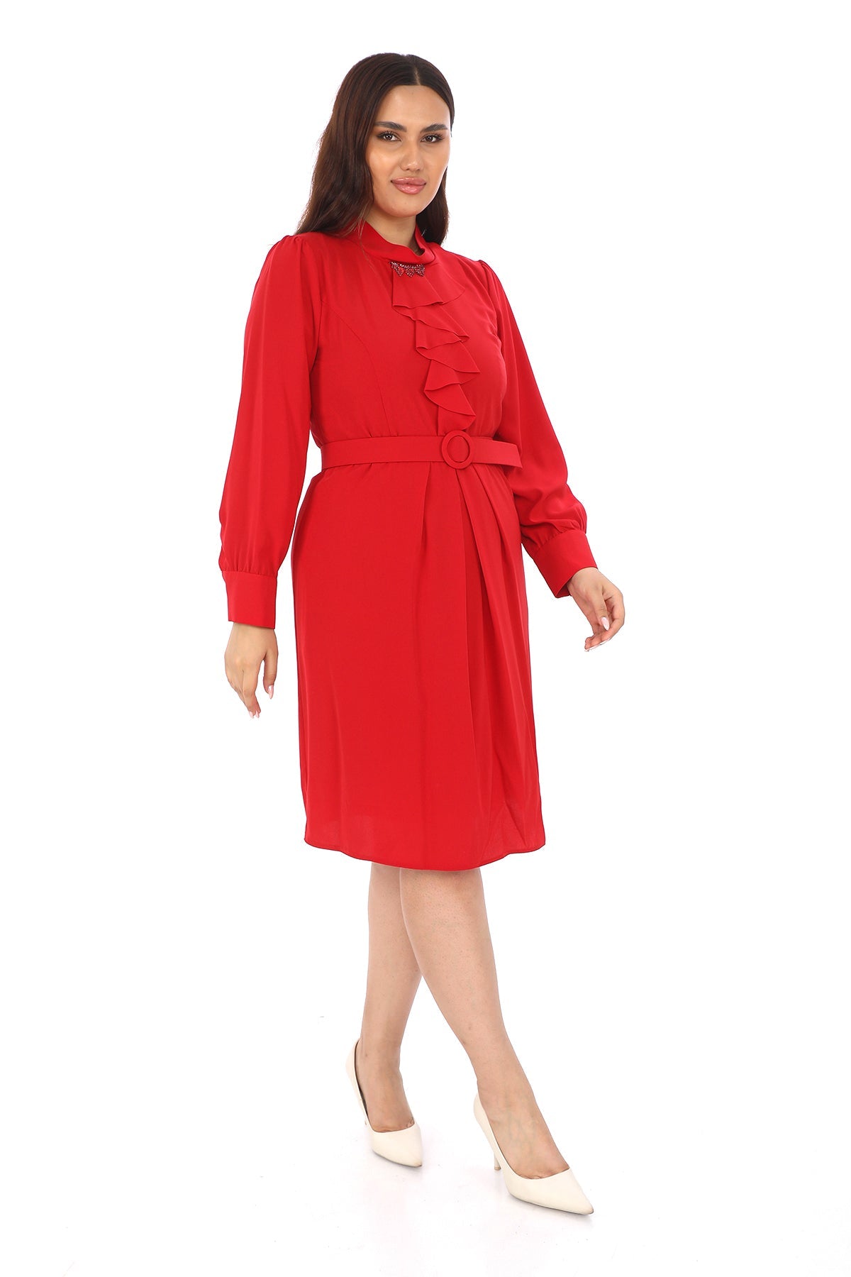 Fırfır Detaylı Kemerli Diz Altı Elbise