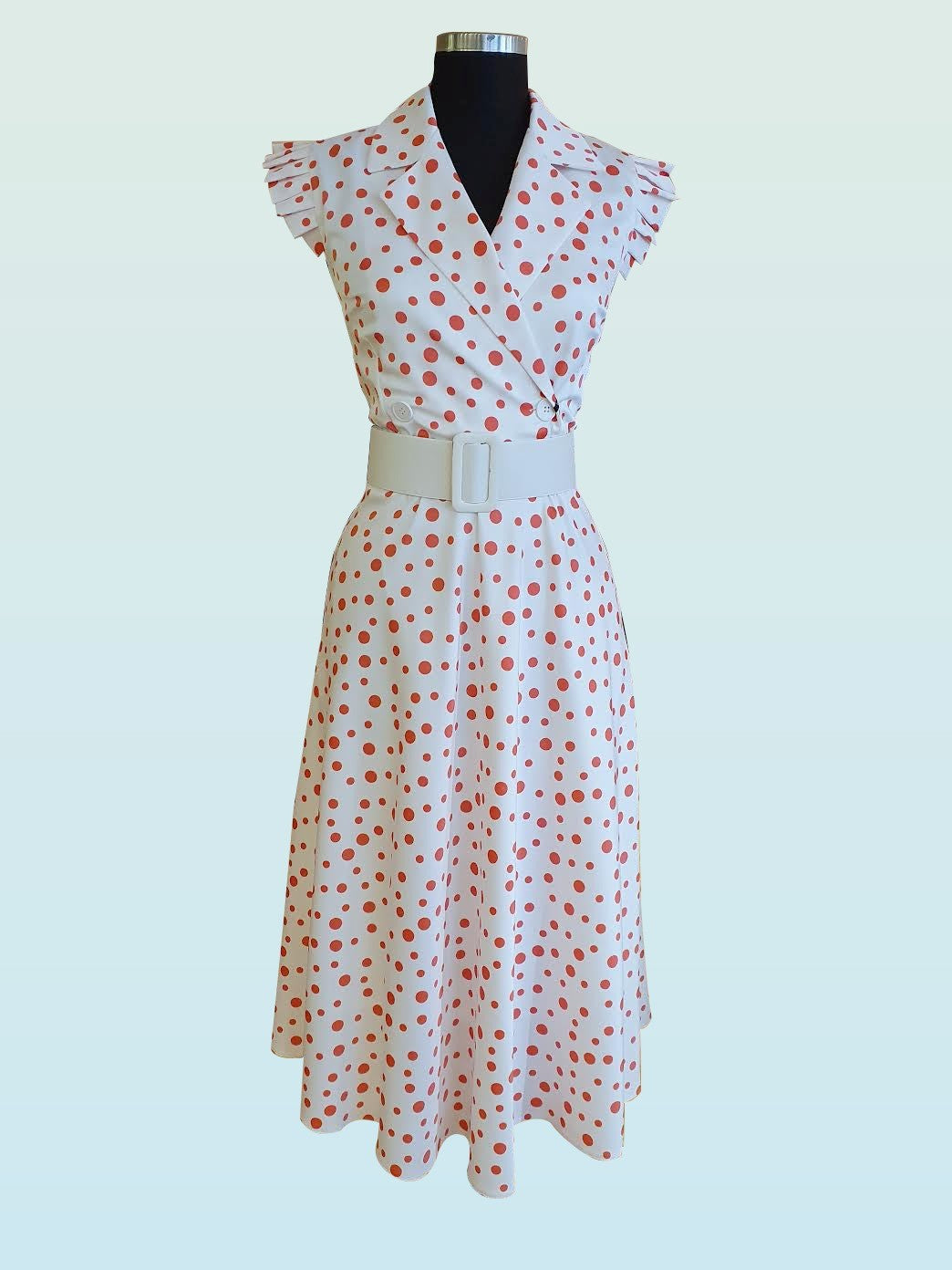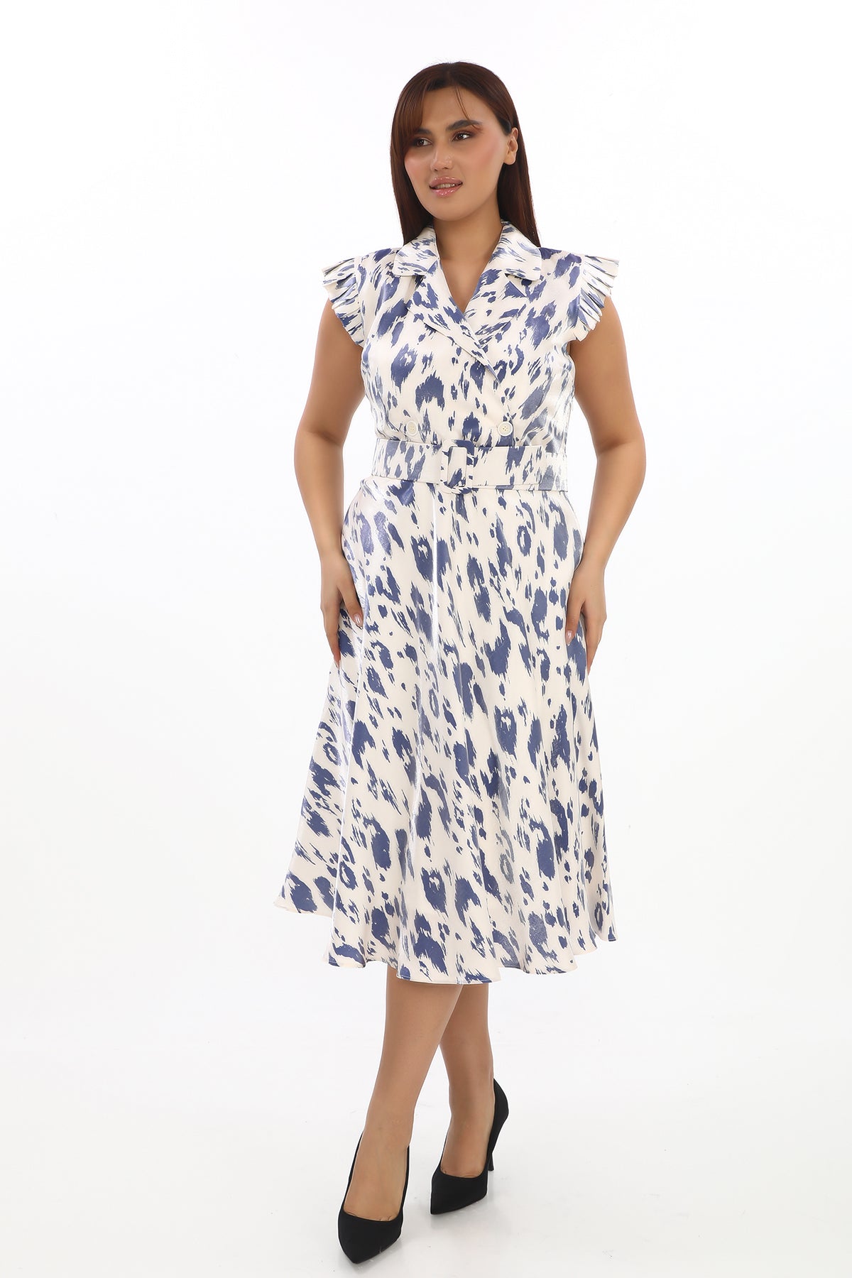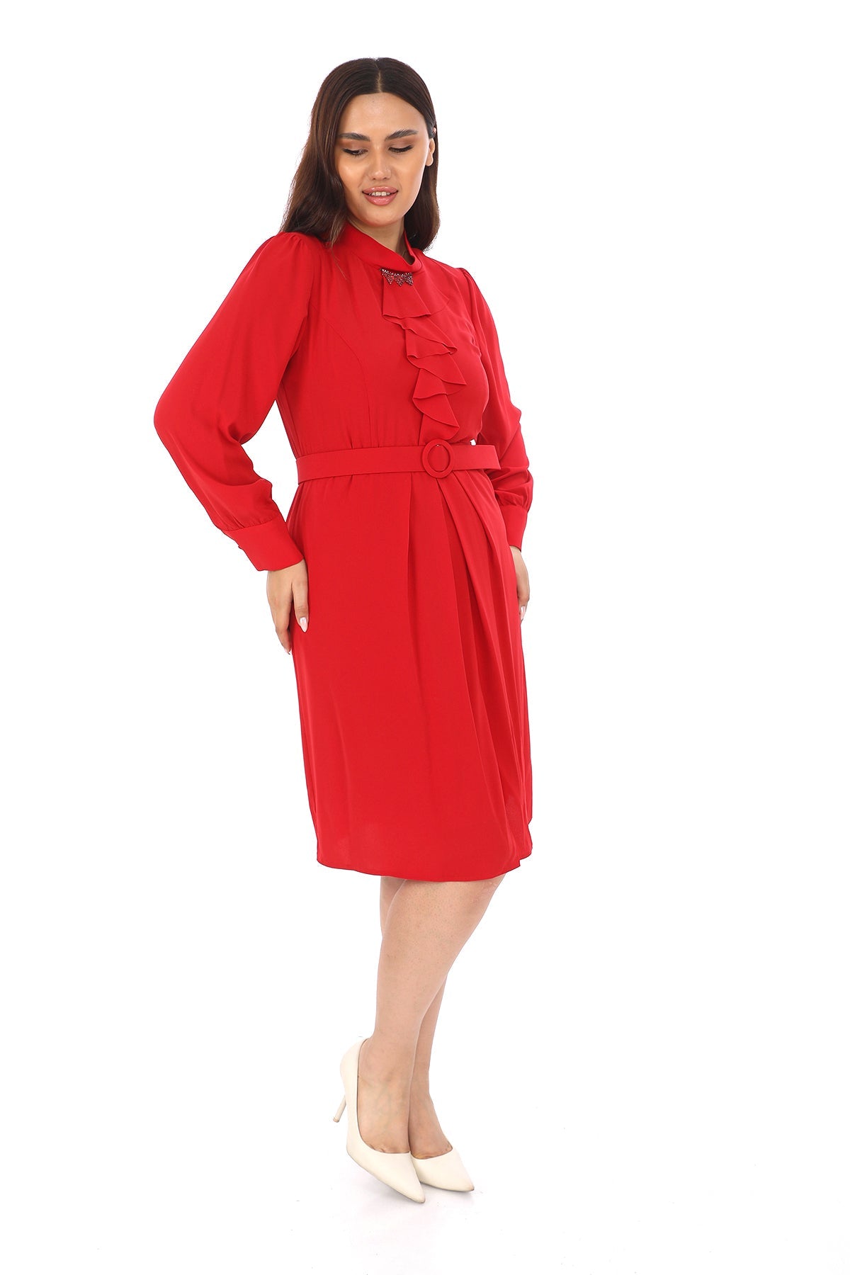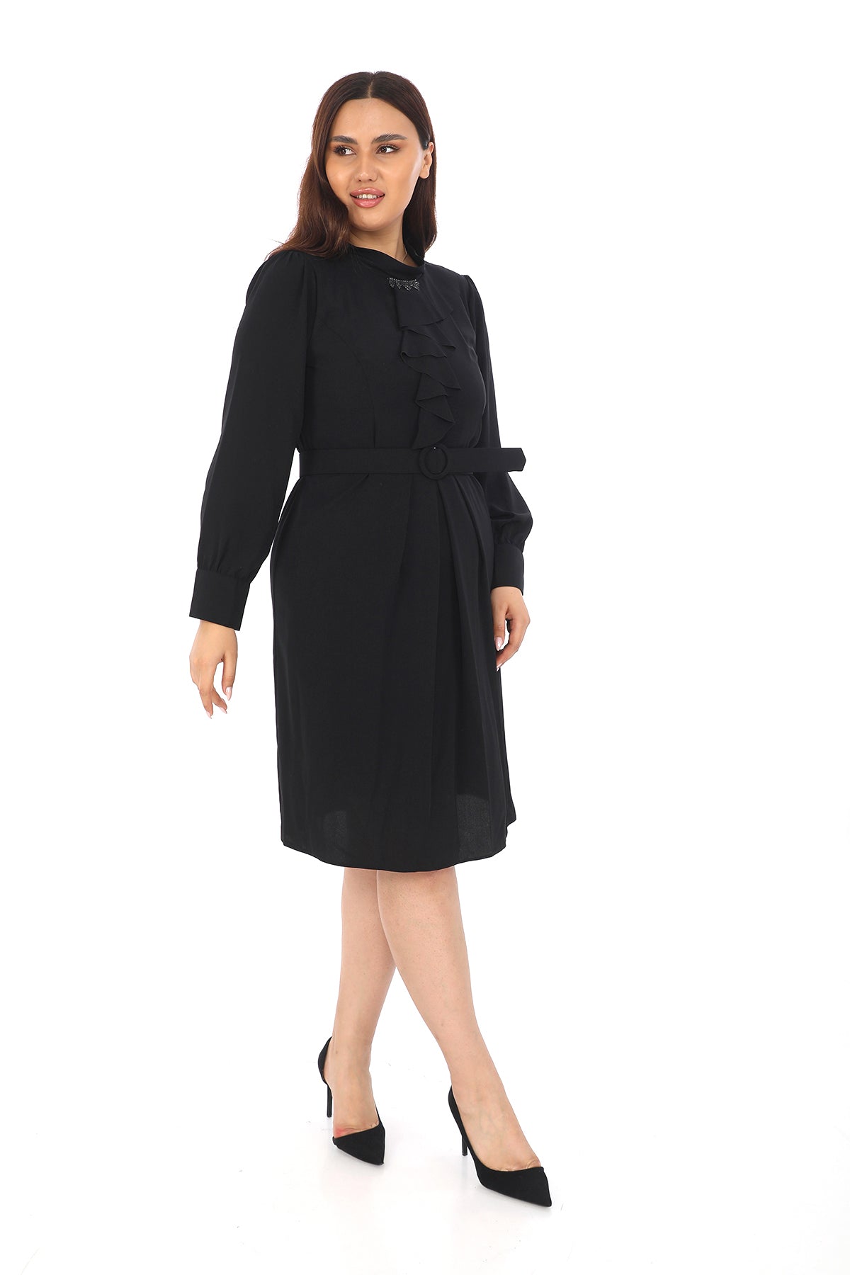 Fırfır Detaylı Kemerli Diz Altı Elbise