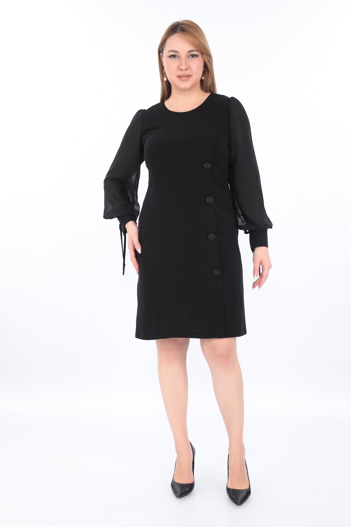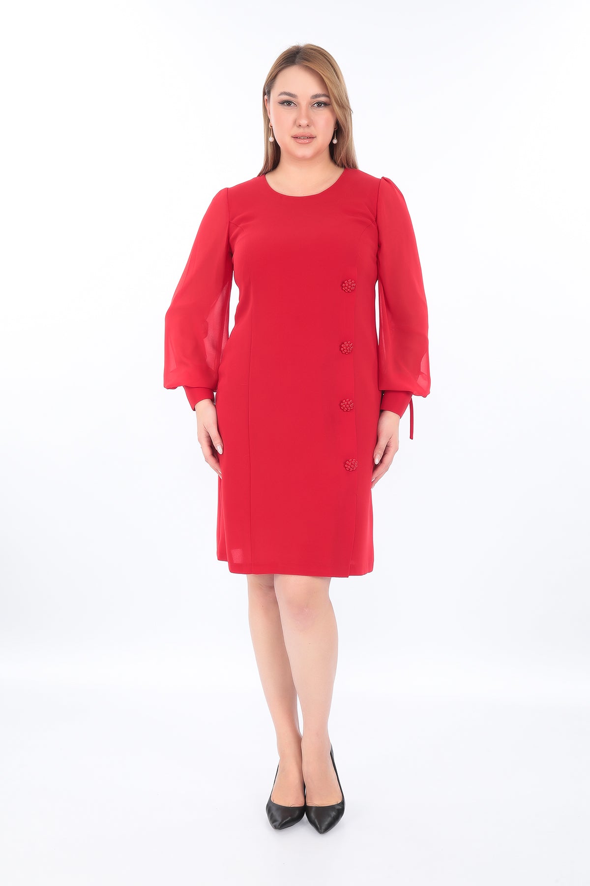 Ürün Açıklaması: Zarif detayları ve modern kesimiyle dikkat çeken bu şifon kollu elbise, şıklık ve rahatlığı bir arada sunar. Gövde kısmındaki dekoratif düğmeler ve transparan kollardaki...