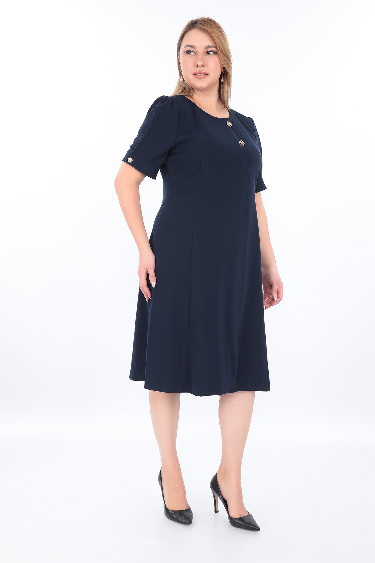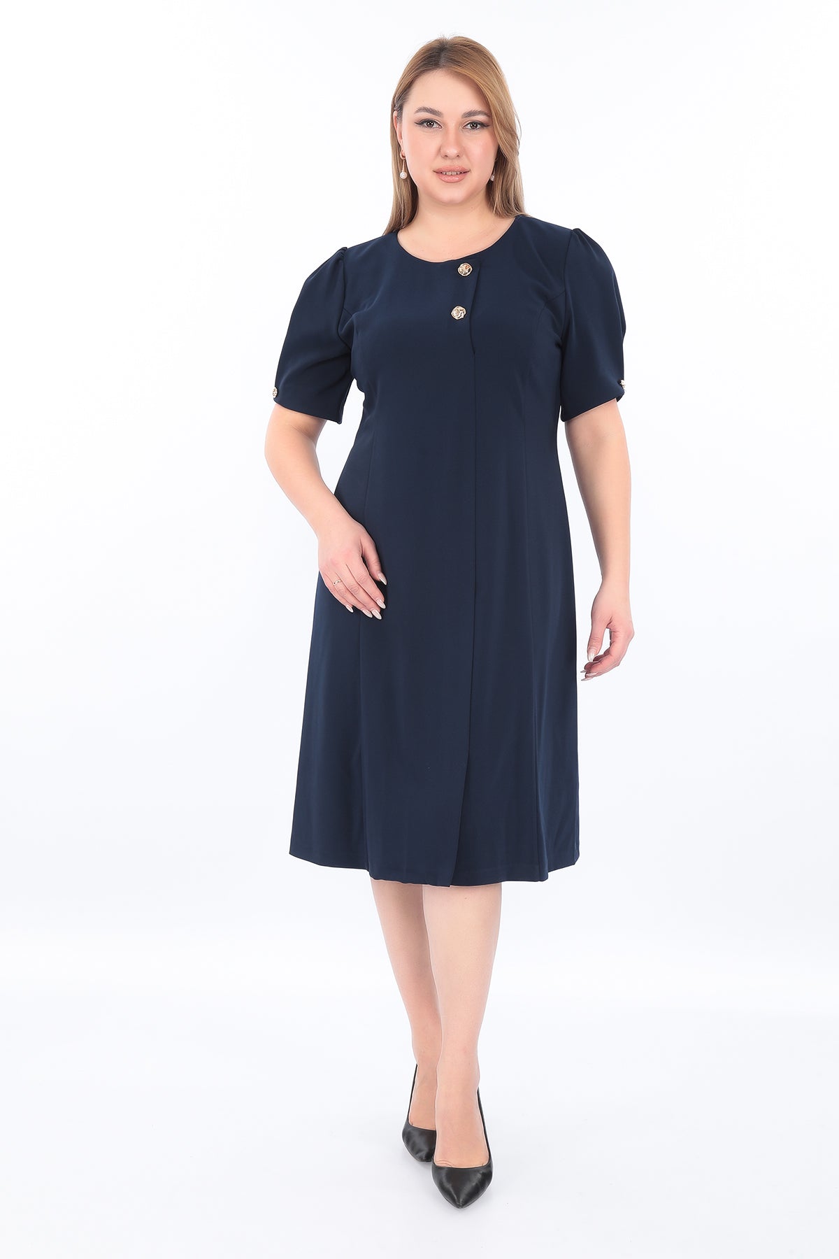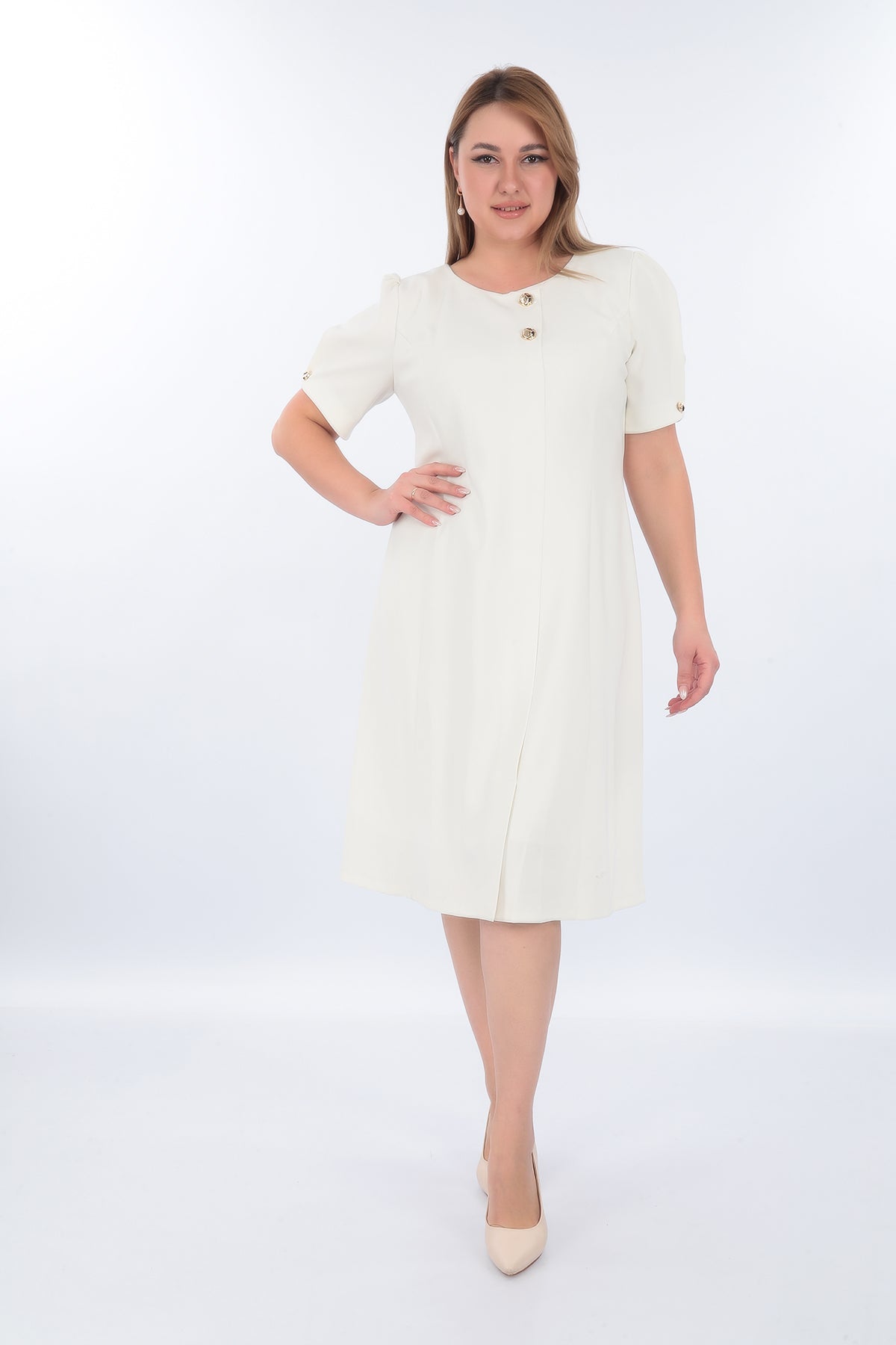 Yuvarlak Yaka Kısa Kollu Metal Düğme Detaylı Yırtmaçlı Elbise