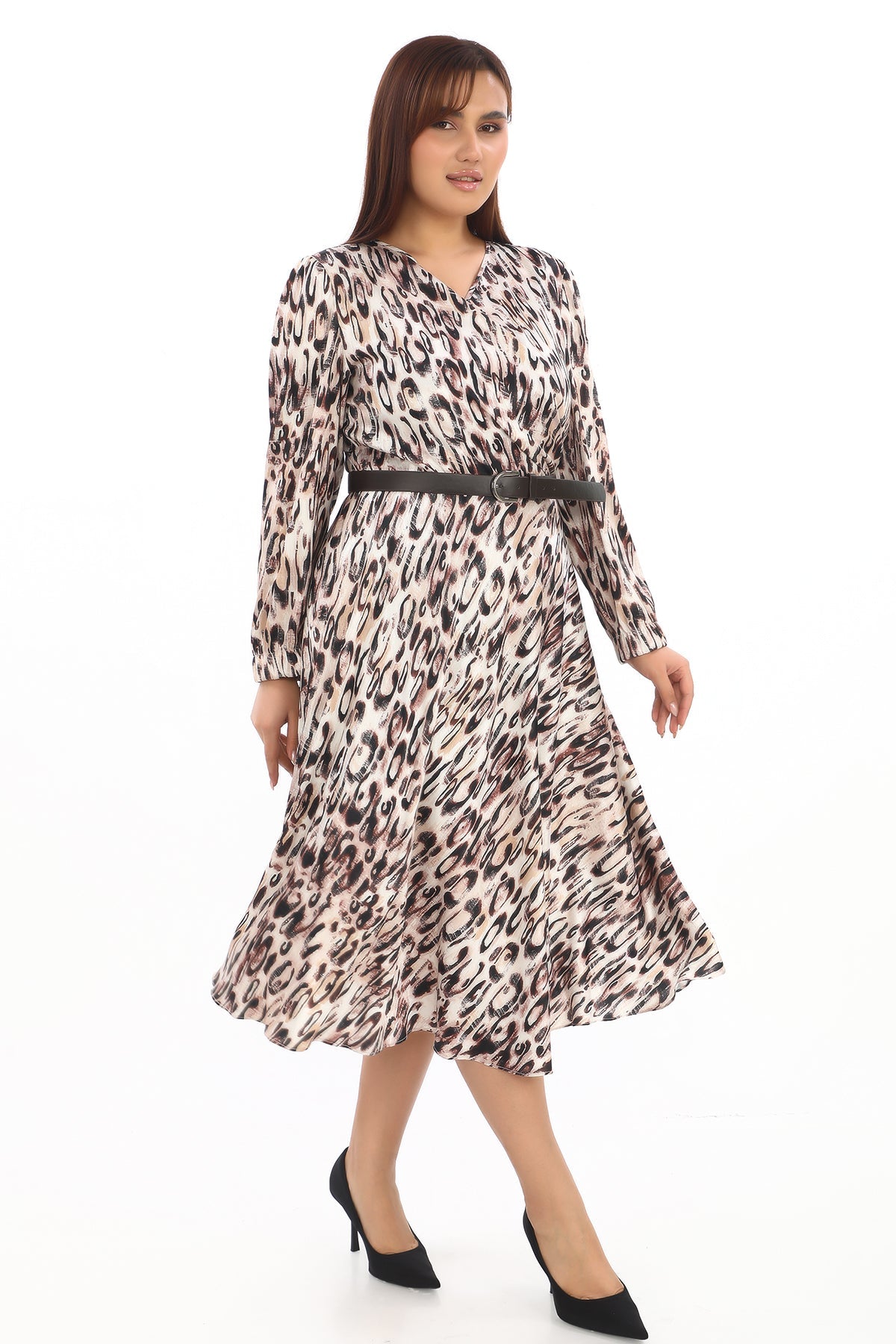 Leopar Desenli Kuşaklı V Yaka Midi Elbise