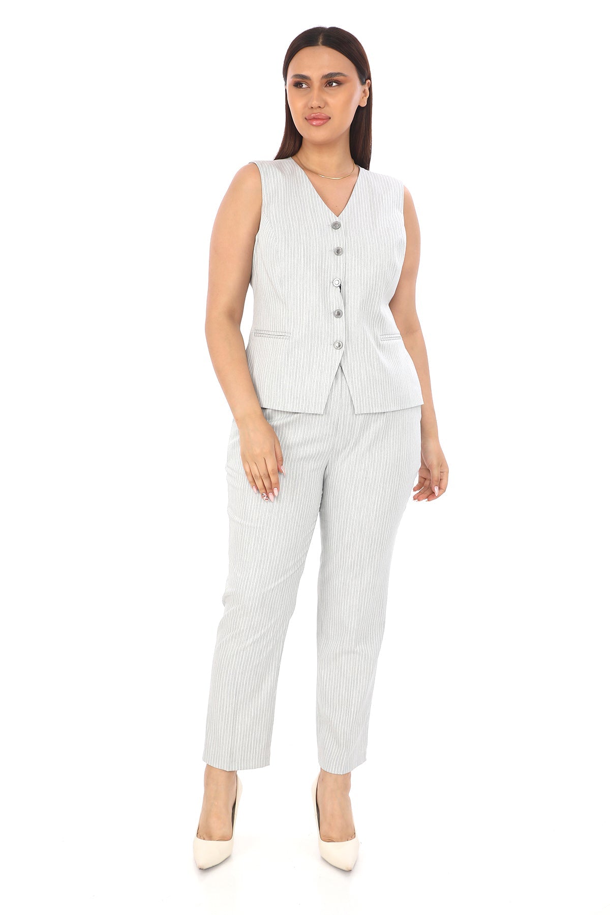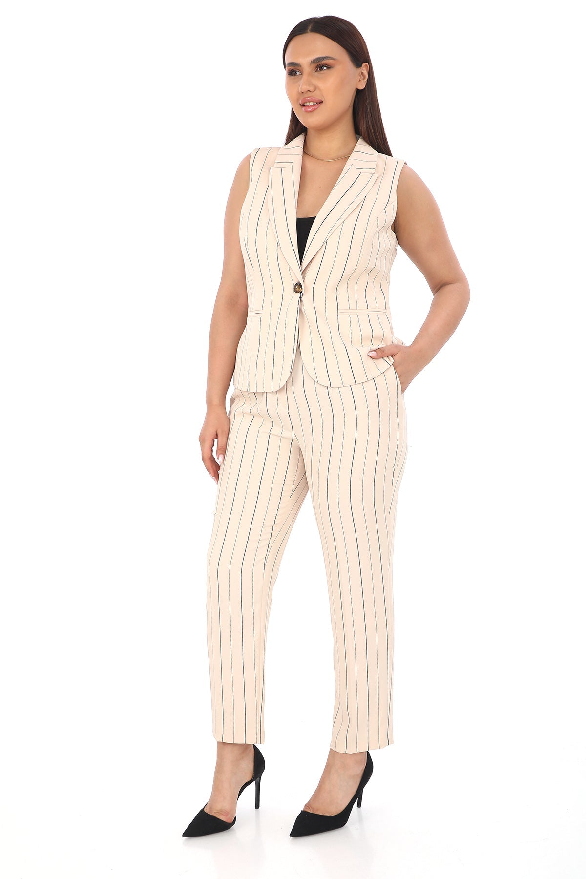 Ürün Açıklaması: Modern çizgileriyle dikkat çeken çizgili krem kadın yelek pantolon takım, hem ofis şıklığında hem de günlük kombinlerde zarif bir görünüm sunar. Şık kesimi ve...