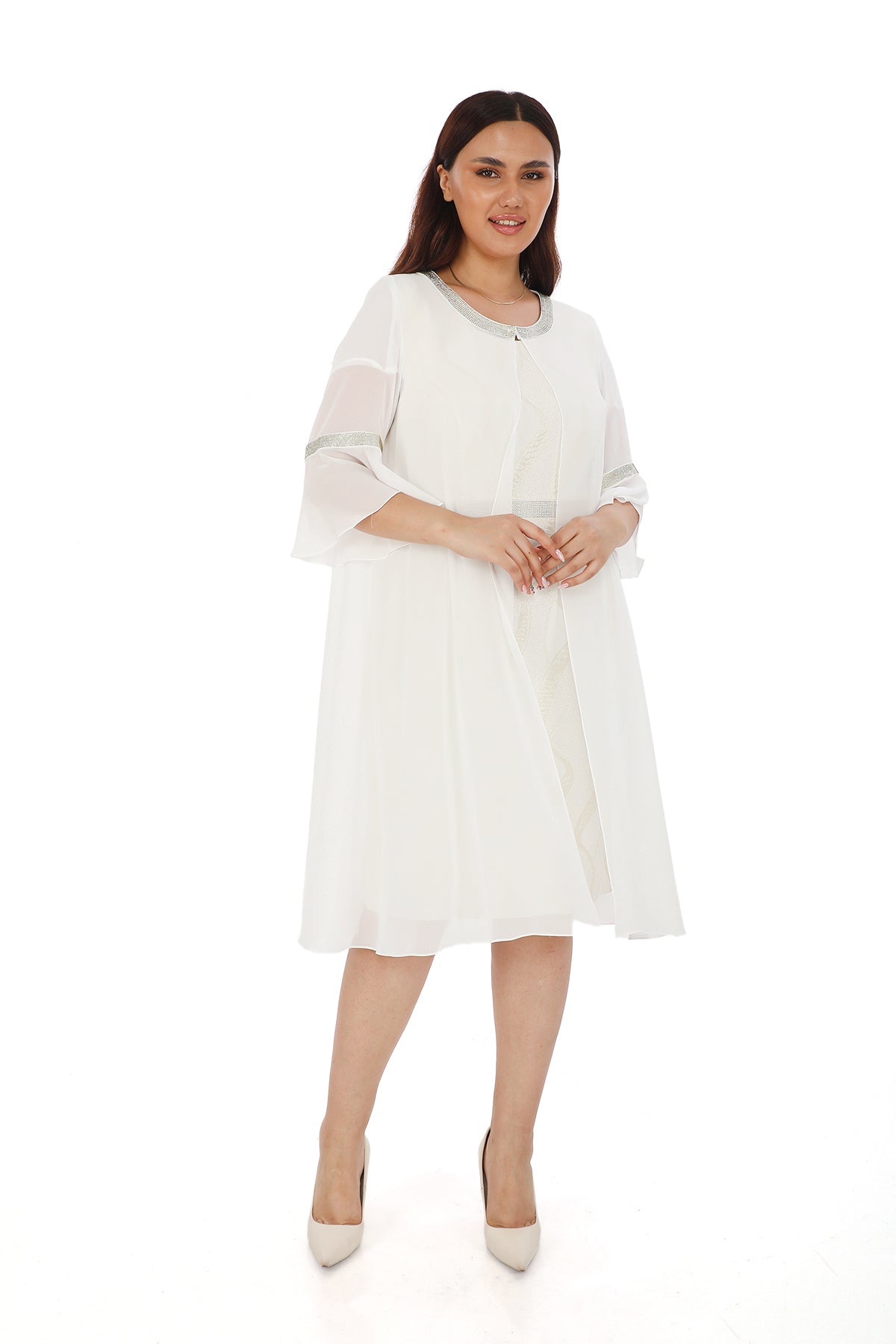 Taş Detaylı Yaka Uzun Ceket ve Şifon Kollu Elbise