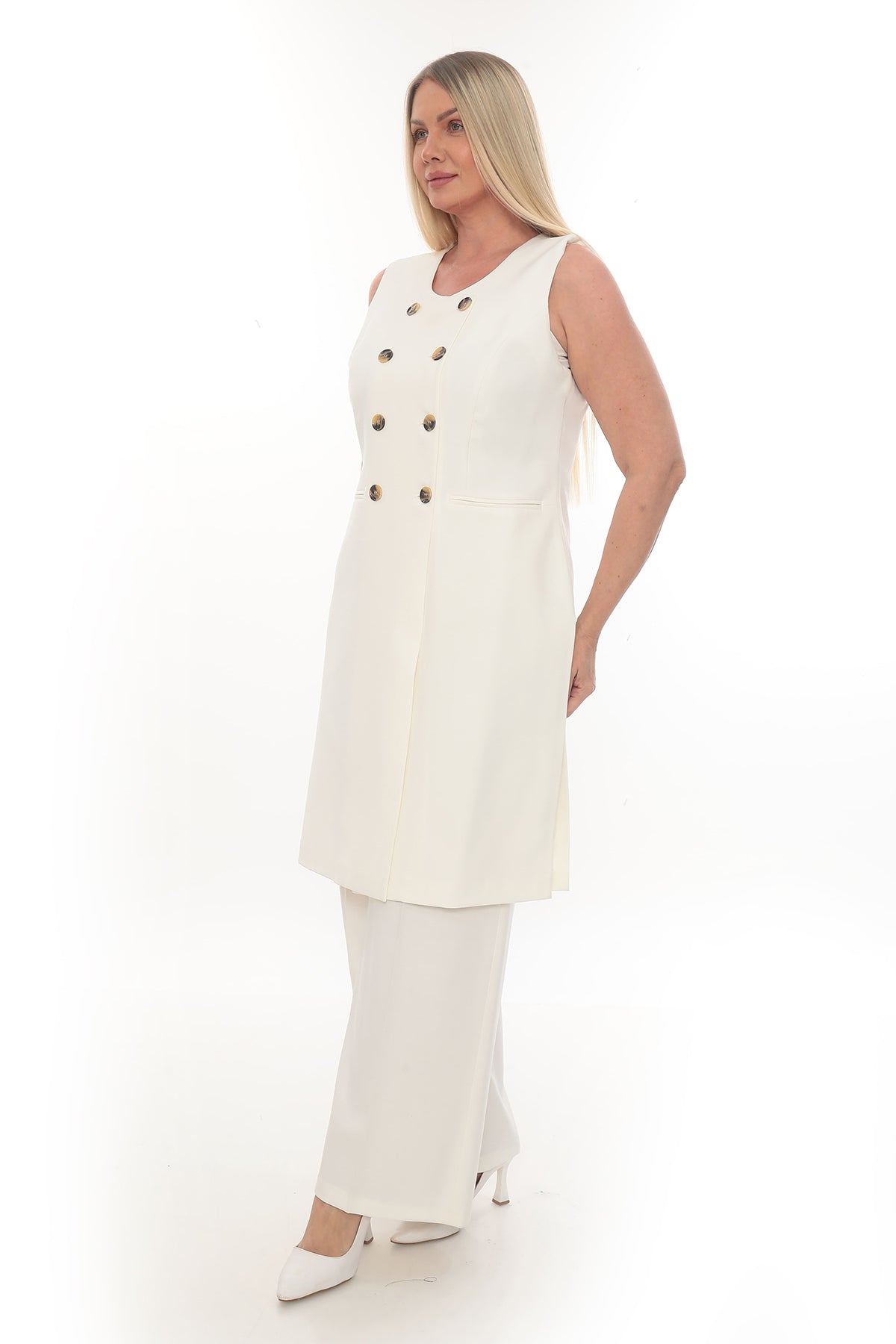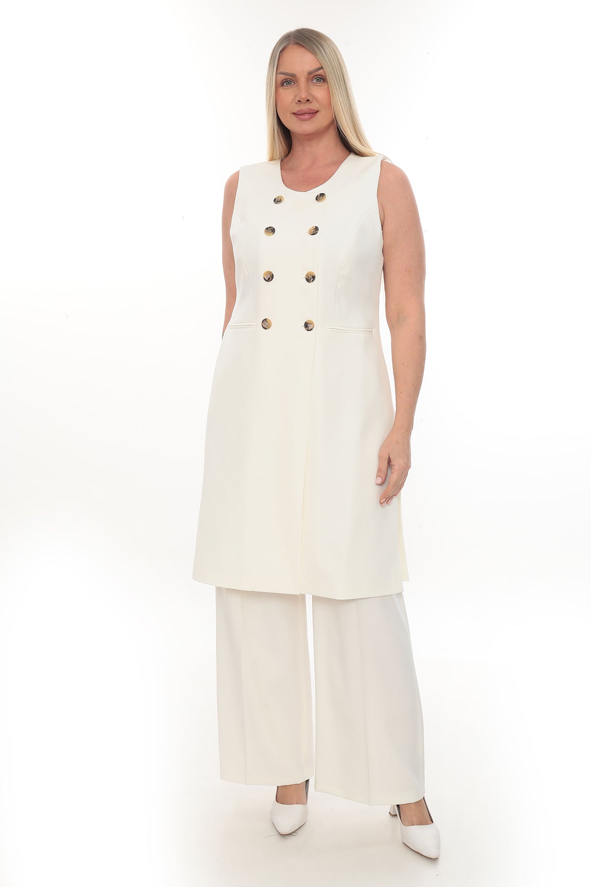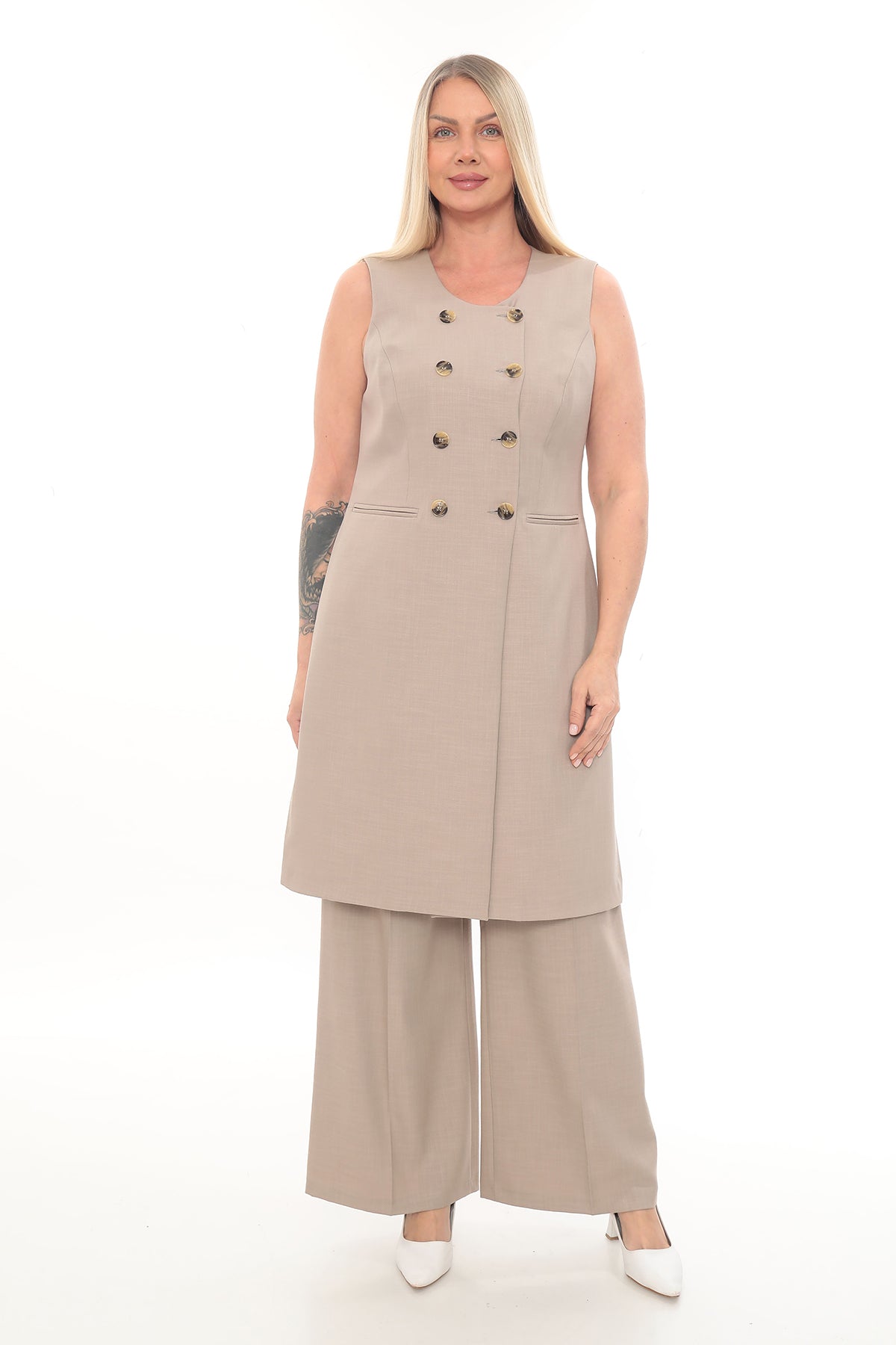 Zarafeti ve rahatlığı bir araya getiren bu bej ve krem renkli uzun yelekli kadın takım, modern ve şık bir görünüm sunar. Kolsuz, kruvaze düğme detaylı yeleği ve geniş paça pantolonu ile hem ofis şıklığına hem de günlük kombinlere uygundur. Nefes alan kumaş dokusu sayesinde dört mevsim rahatlıkla kullanılabilir. Özellikle sade ama etkileyici görünüm arayan kadınlar için ideal bir tercihtir.