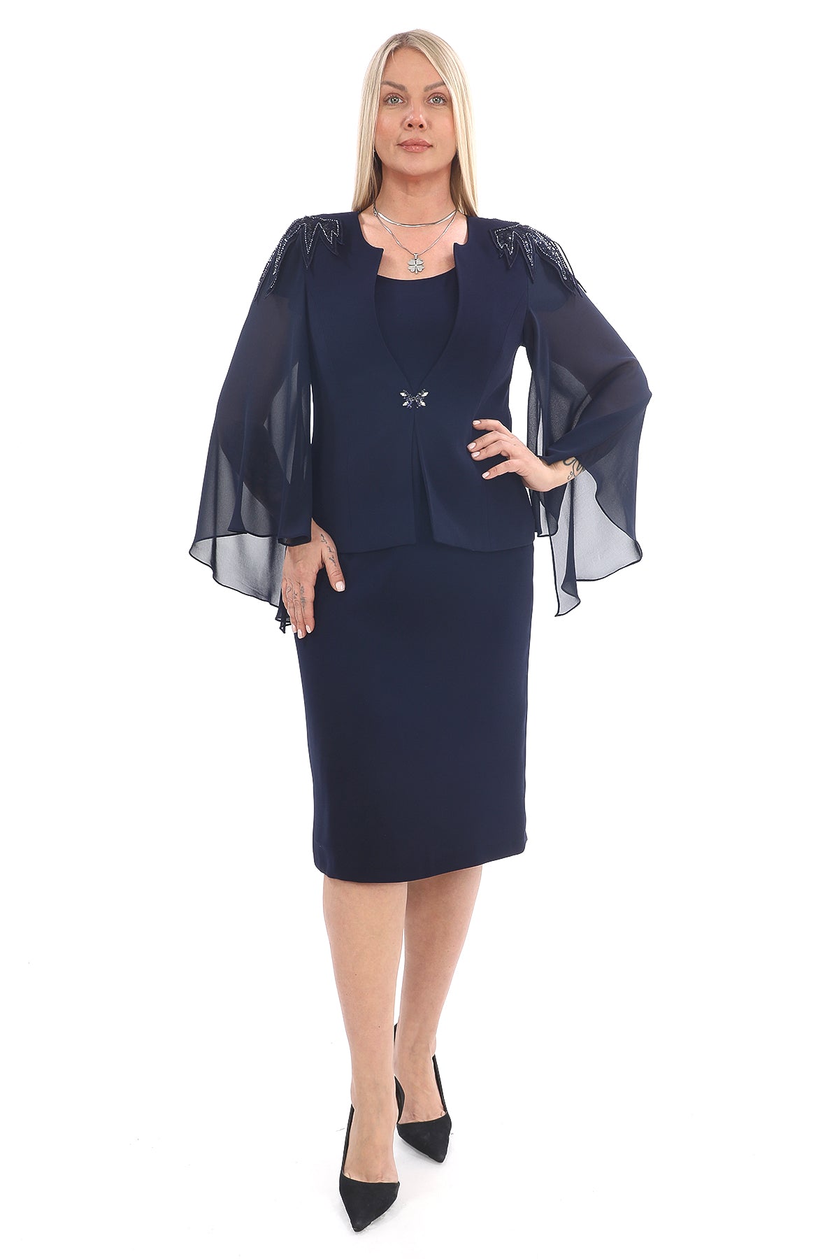 Satin Collar Chiffon Tunic and Glitter Fabric Dress Double Tunic Dress Women's Set