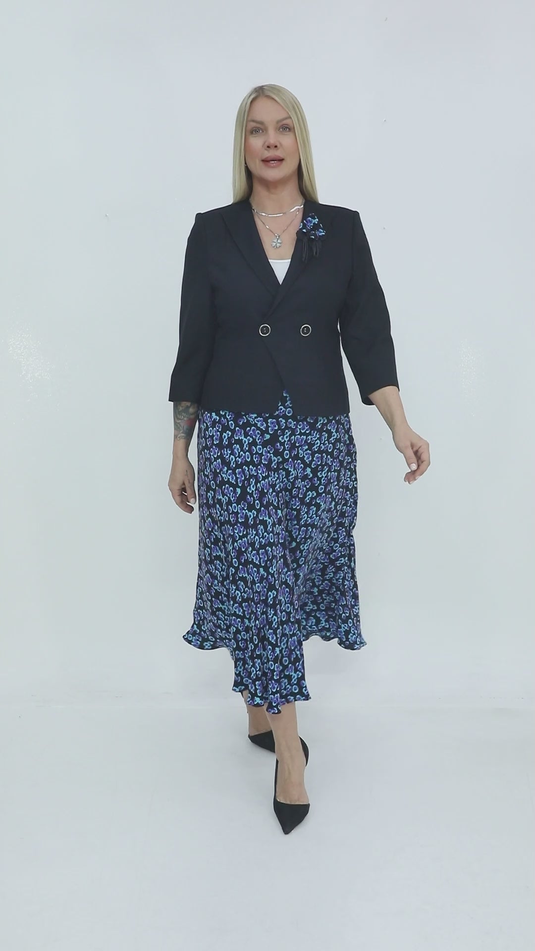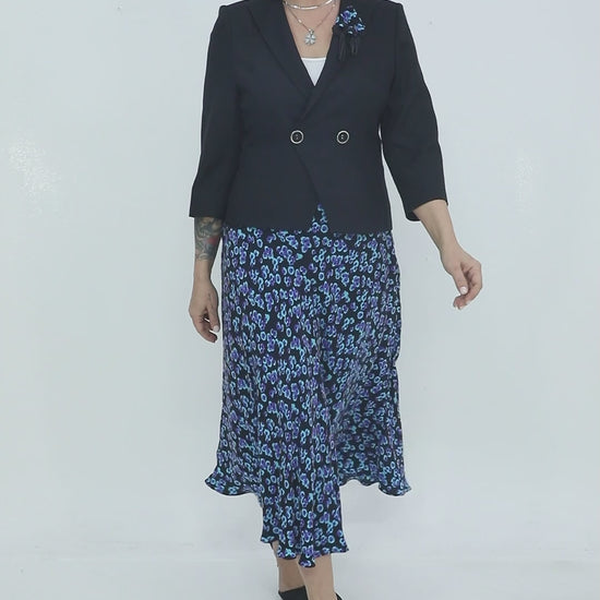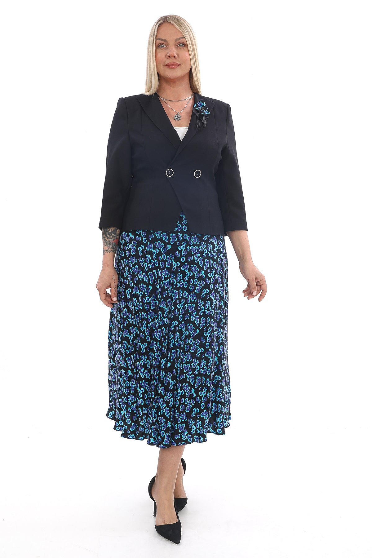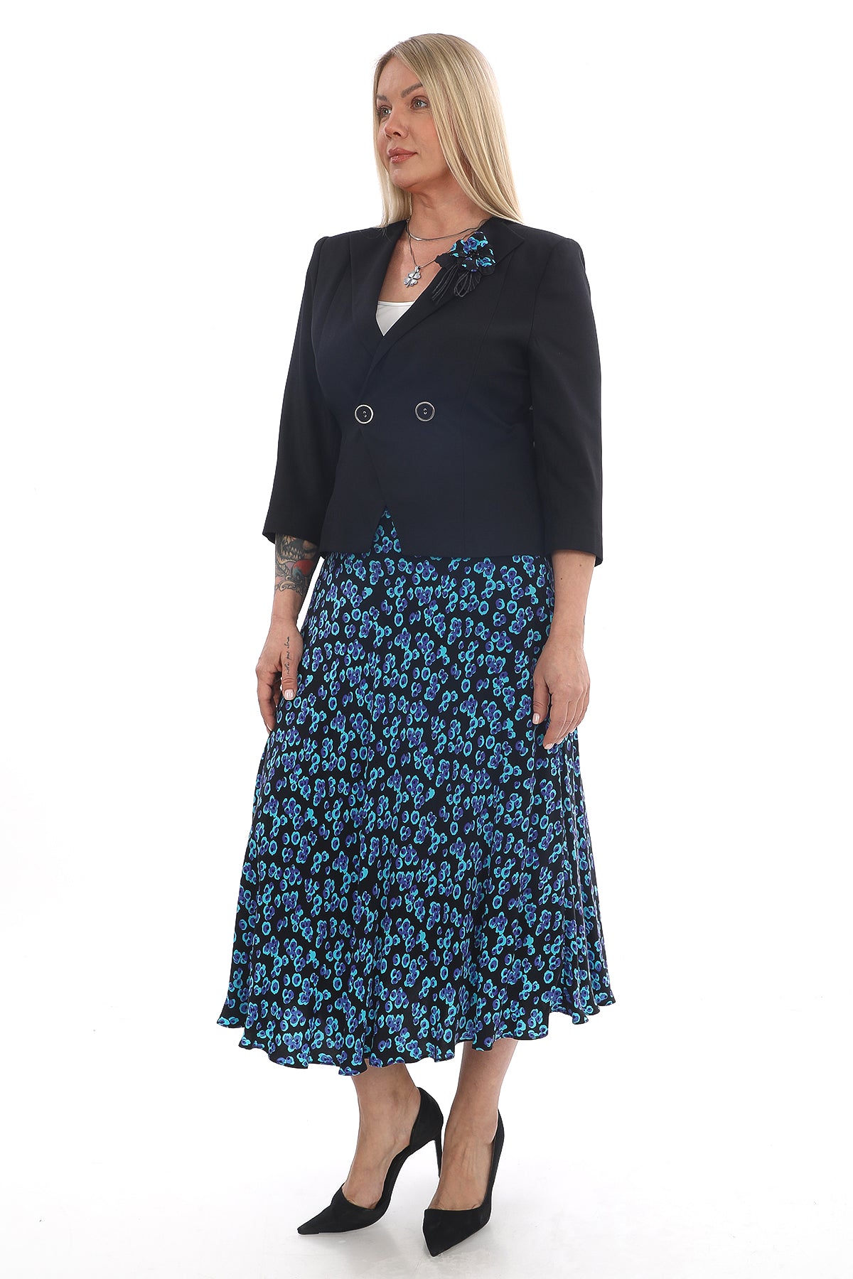 Şıklığı ve rahatlığı bir arada sunan bu takım, desenli şifon eteği ve zarif ceket tasarımıyla hem günlük hem de özel günlerde stil sahibi bir görünüm kazandırır. Siyah üzerine mavi desenli etek, hareketli ve modern bir hava yaratırken, sade ceket modeli kombine resmi bir şıklık katar.