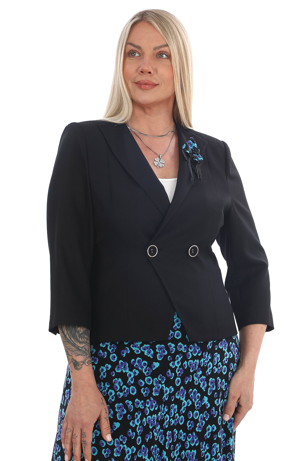 Ceket: Kruvaze kesim, metal düğme detaylı, ¾ kol