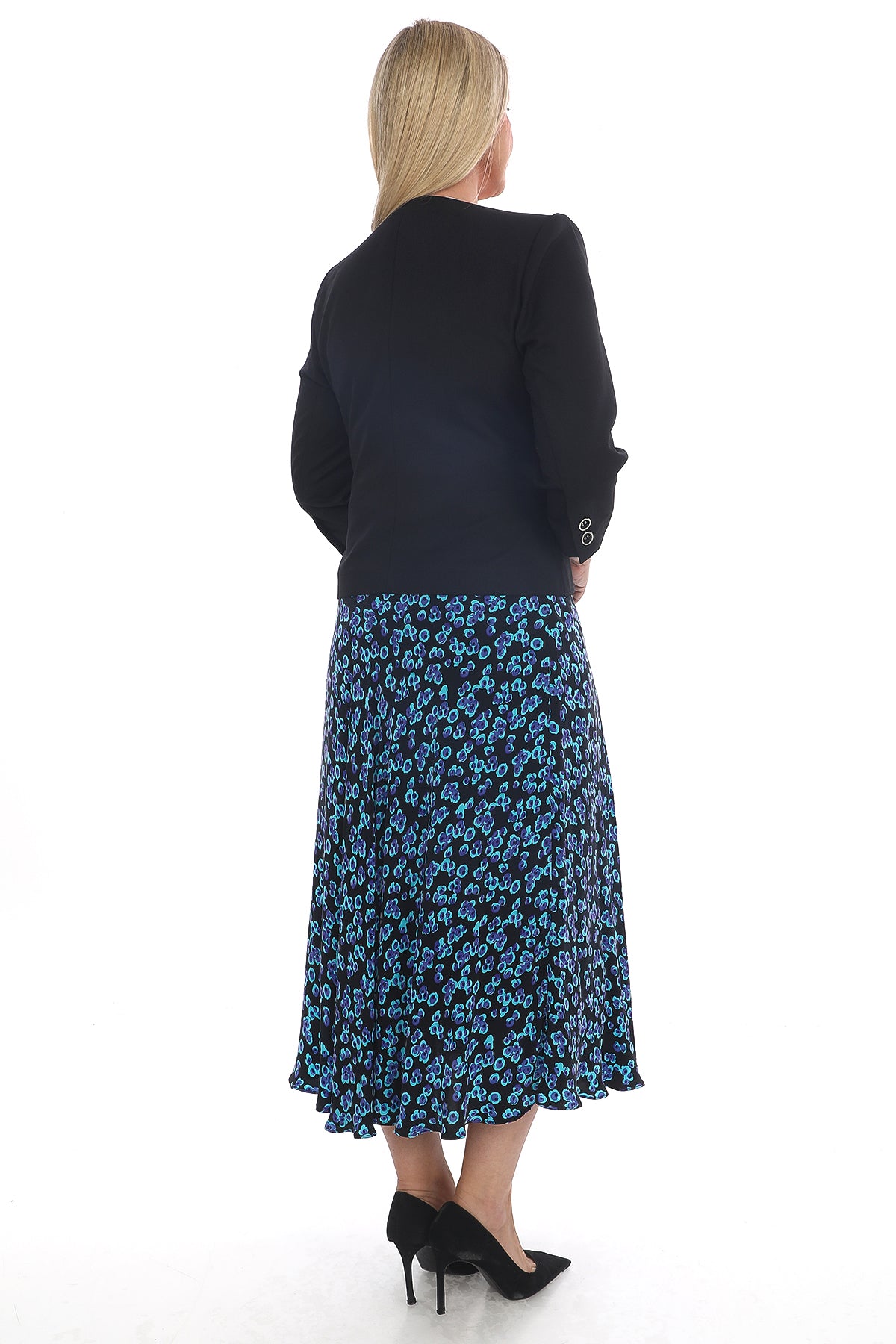 Renk: Siyah üzerine mavi desen detaylı etek, siyah ceket