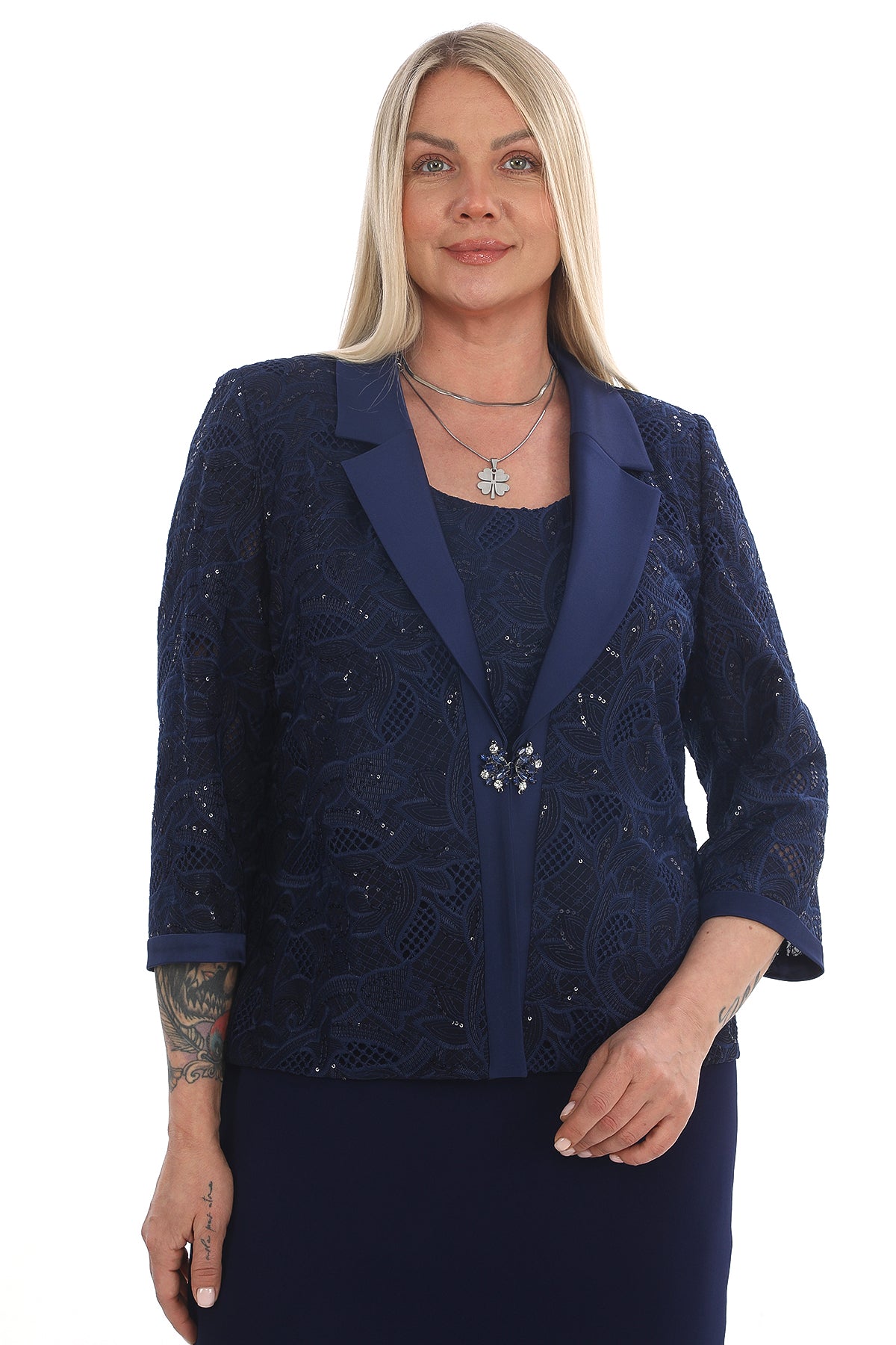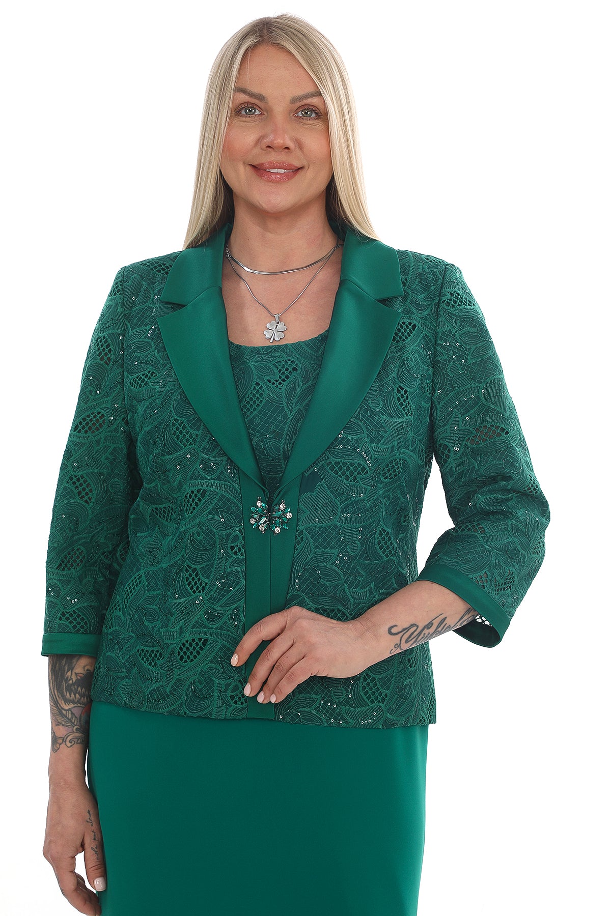 Ceket: Dantel detaylı, ¾ kol, saten yaka, inci taşlı broş kapama