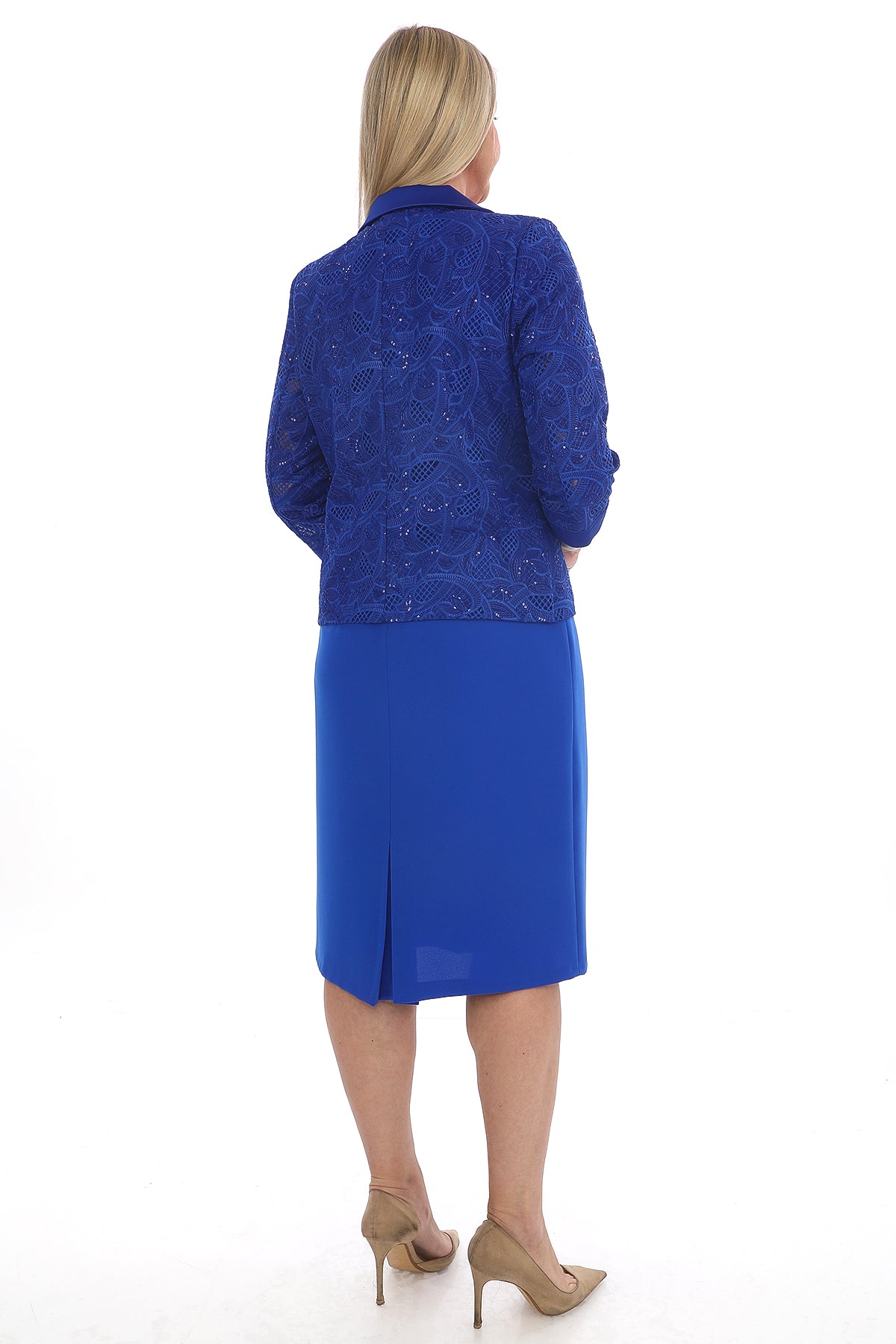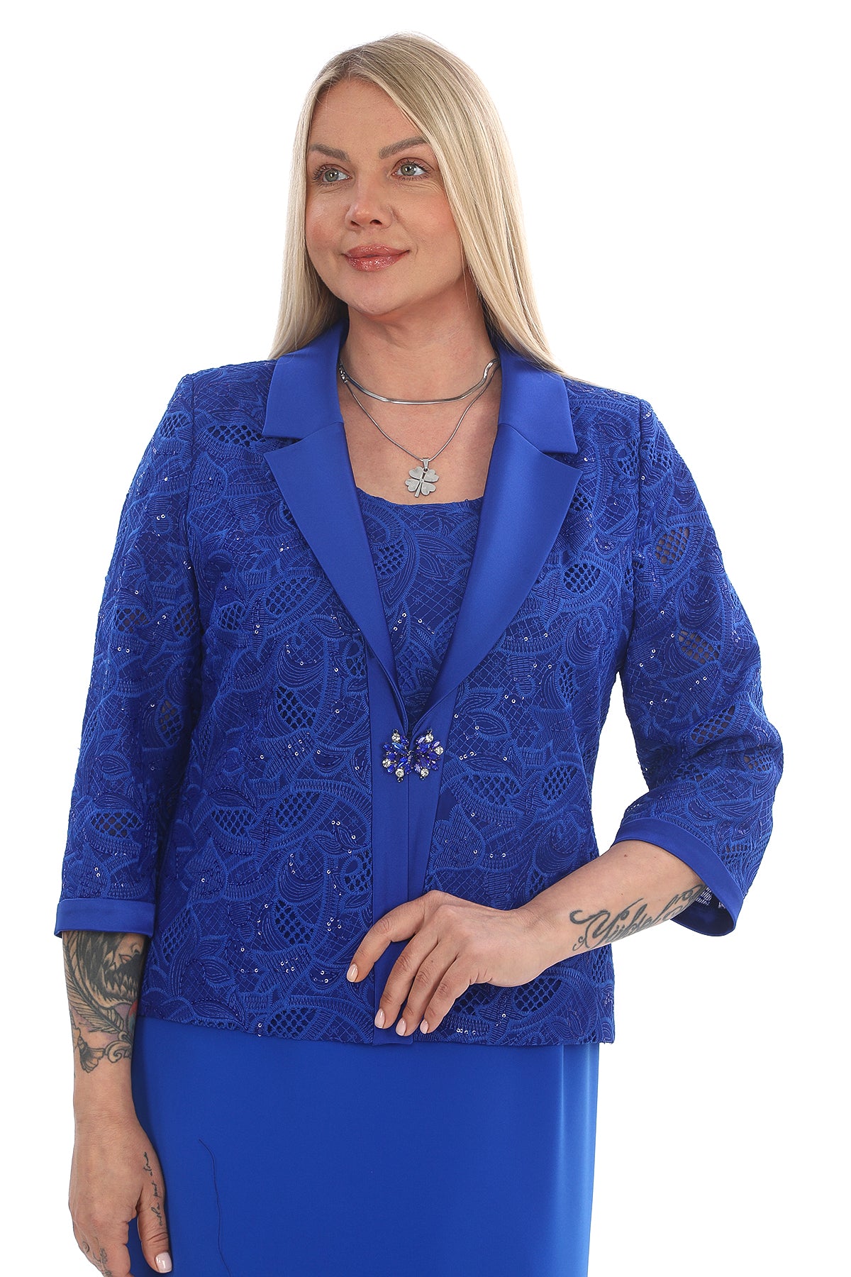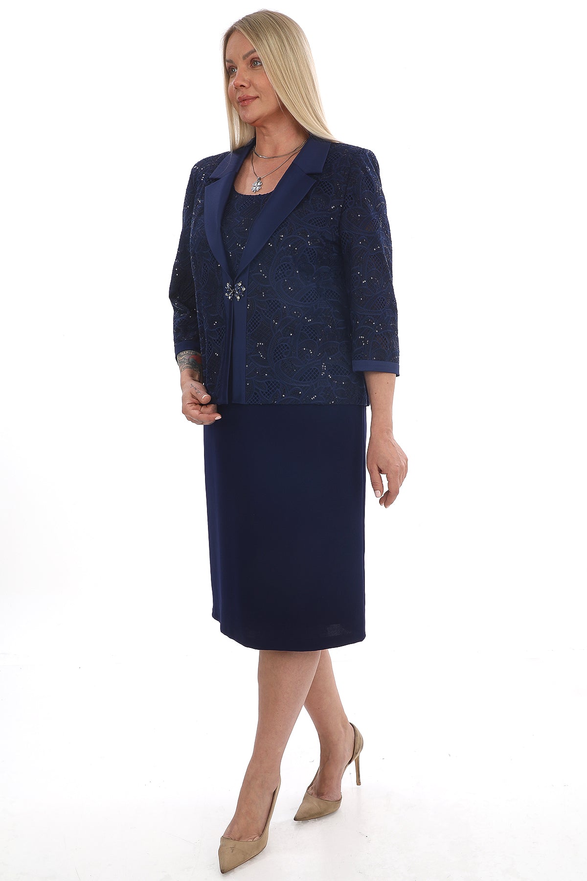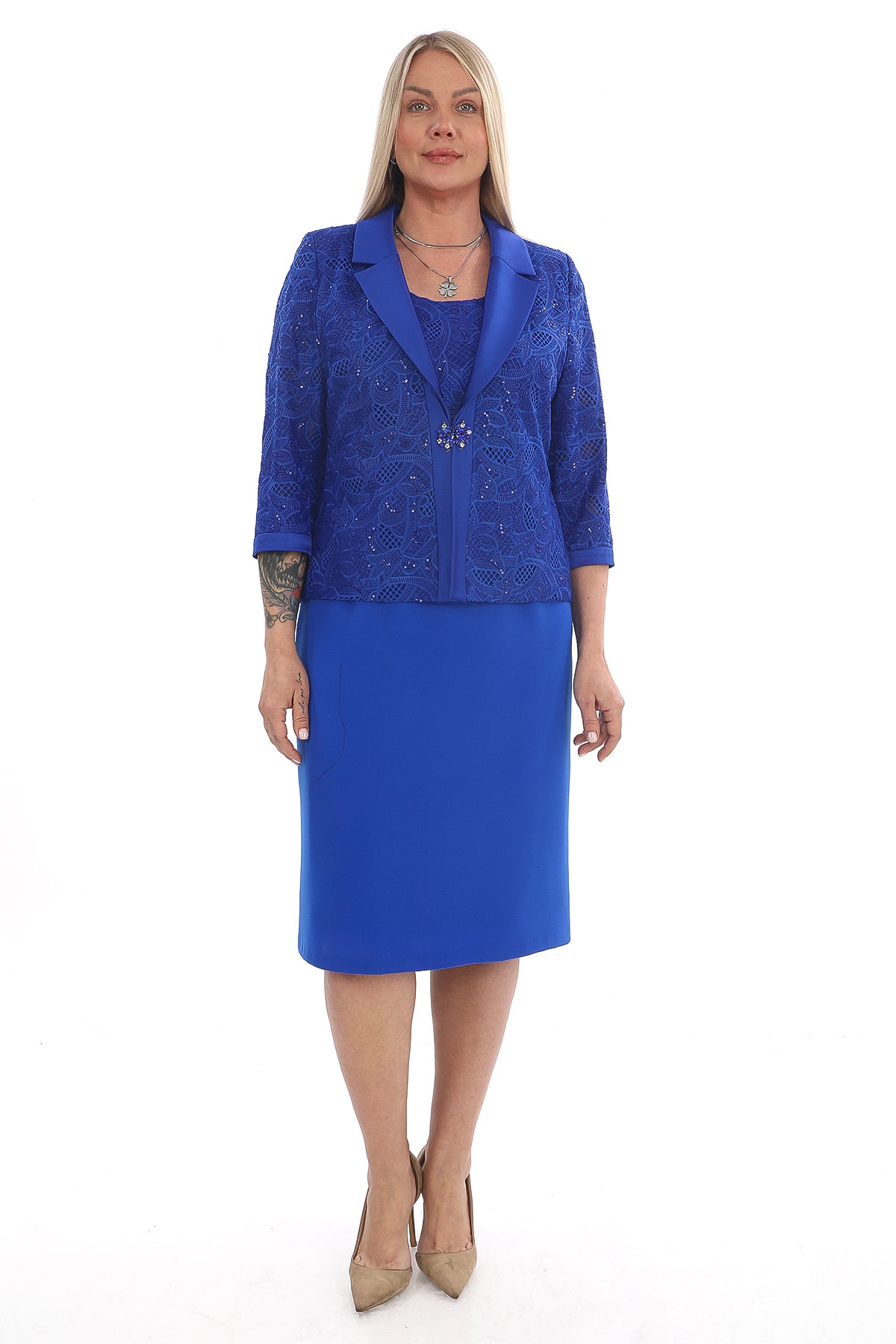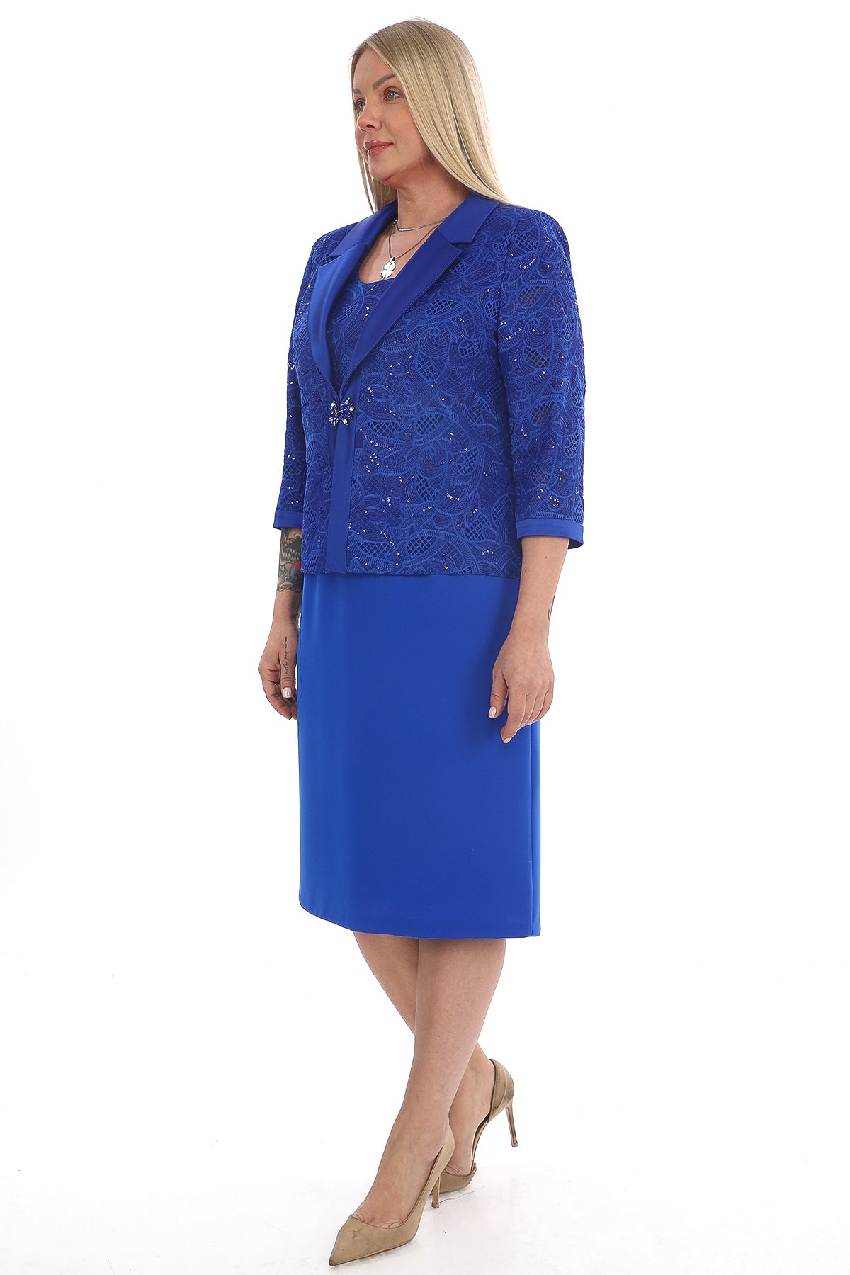 Canlı saks mavisi rengiyle dikkat çeken bu şık takım, zarif elbise ve dantel detaylı ceket kombininden oluşuyor. Elbisenin düz ve sade kesimi, ceket üzerindeki zarif dantel işlemeler ve inci taşlı broş detayıyla mükemmel bir uyum yakalıyor. Resmi davetlerden özel kutlamalara kadar birçok ortamda güvenle tercih edilebilecek modern ve zarif bir modeldir.