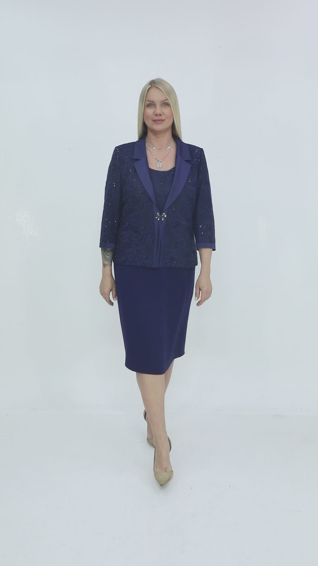 Kumaş: Elbise için düz ve akıcı kumaş, ceket için dantel & saten kombinasyonu