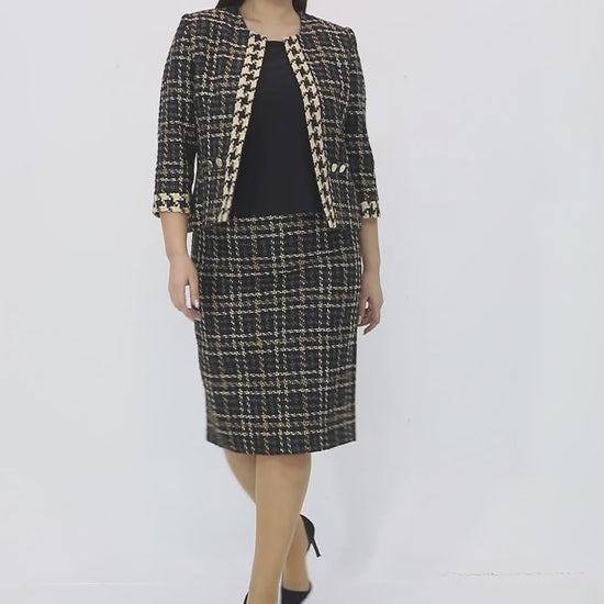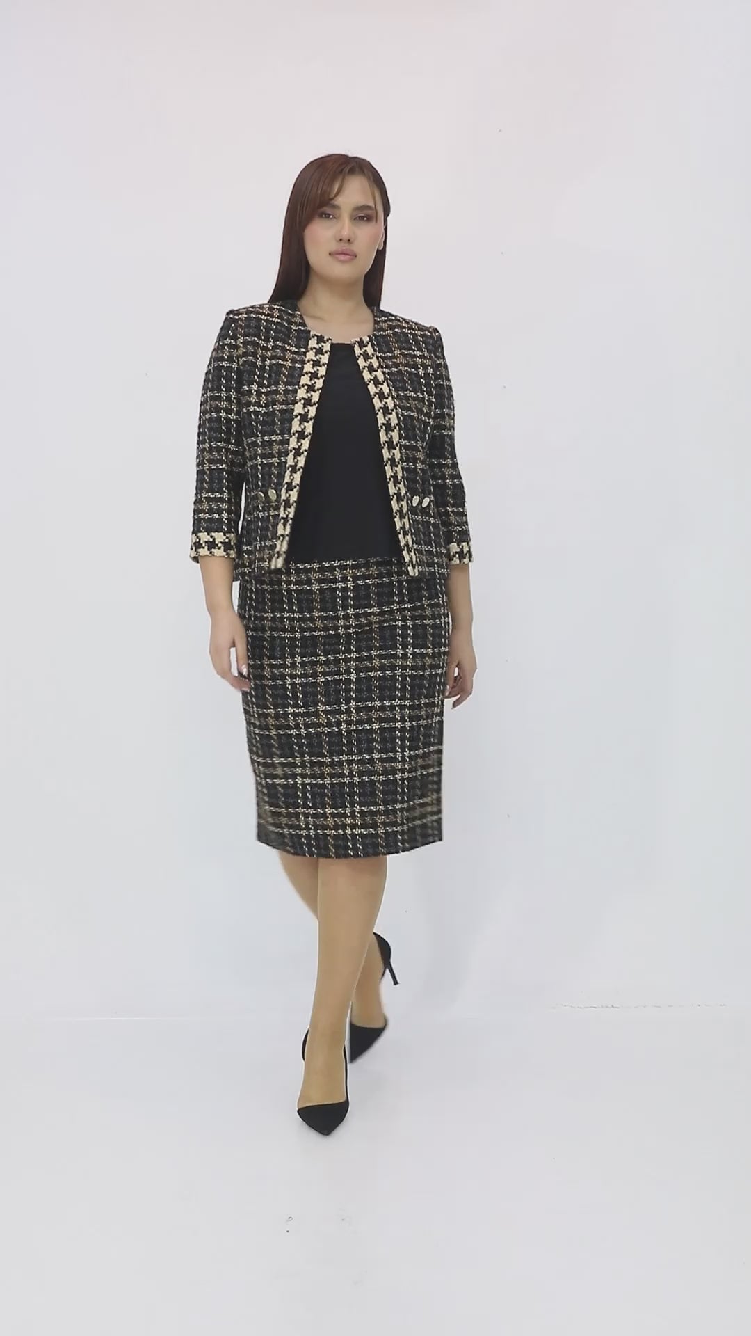 Zarafet ve profesyonelliği bir araya getiren bu ekose ceket bluz etek takım, her yaştan kadın müşteriler için gardırobun vazgeçilmezi olmaya aday.