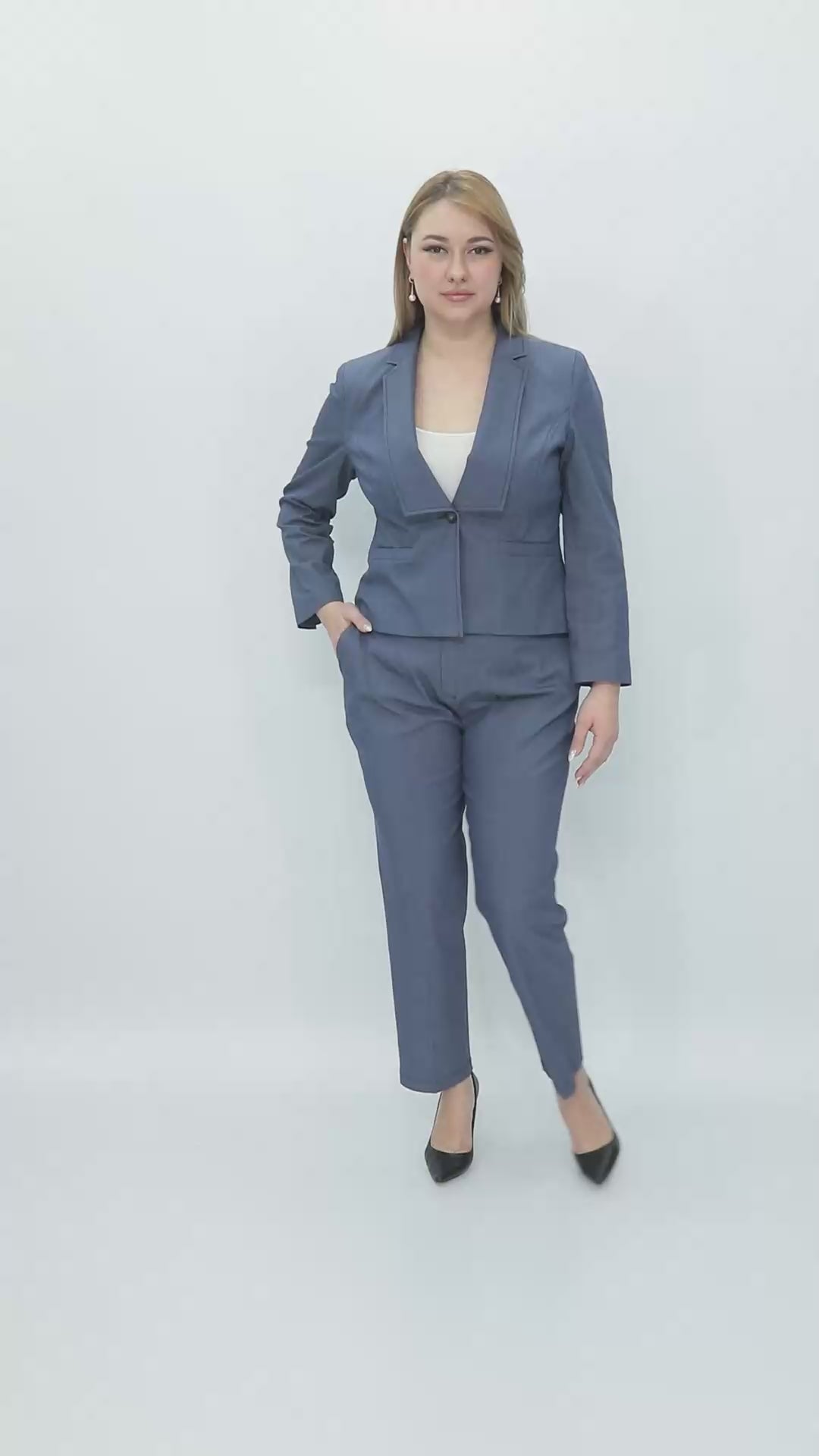 Modern şehirli kadının hem zarif hem güçlü duruşunu yansıtan bu kot kumaş ceket-pantolon takım, rahat kalıbı ve kaliteli dikiş detaylarıyla gün boyu konfor sağlar.