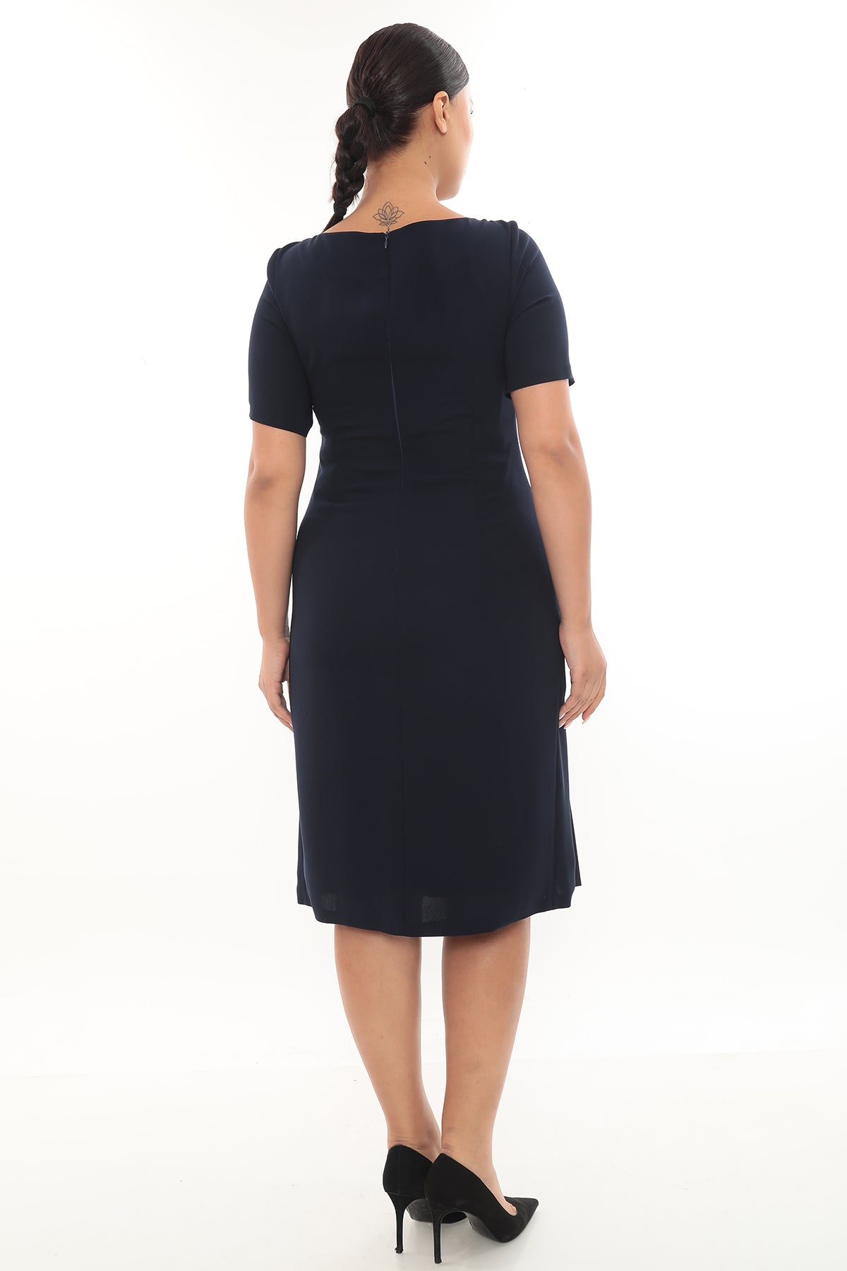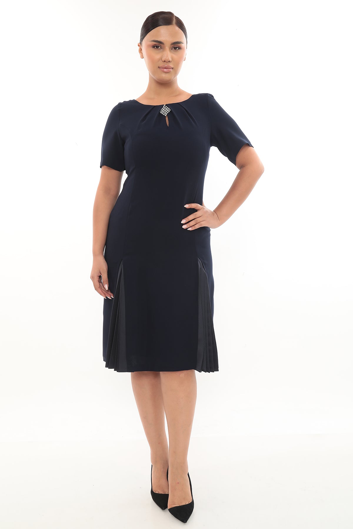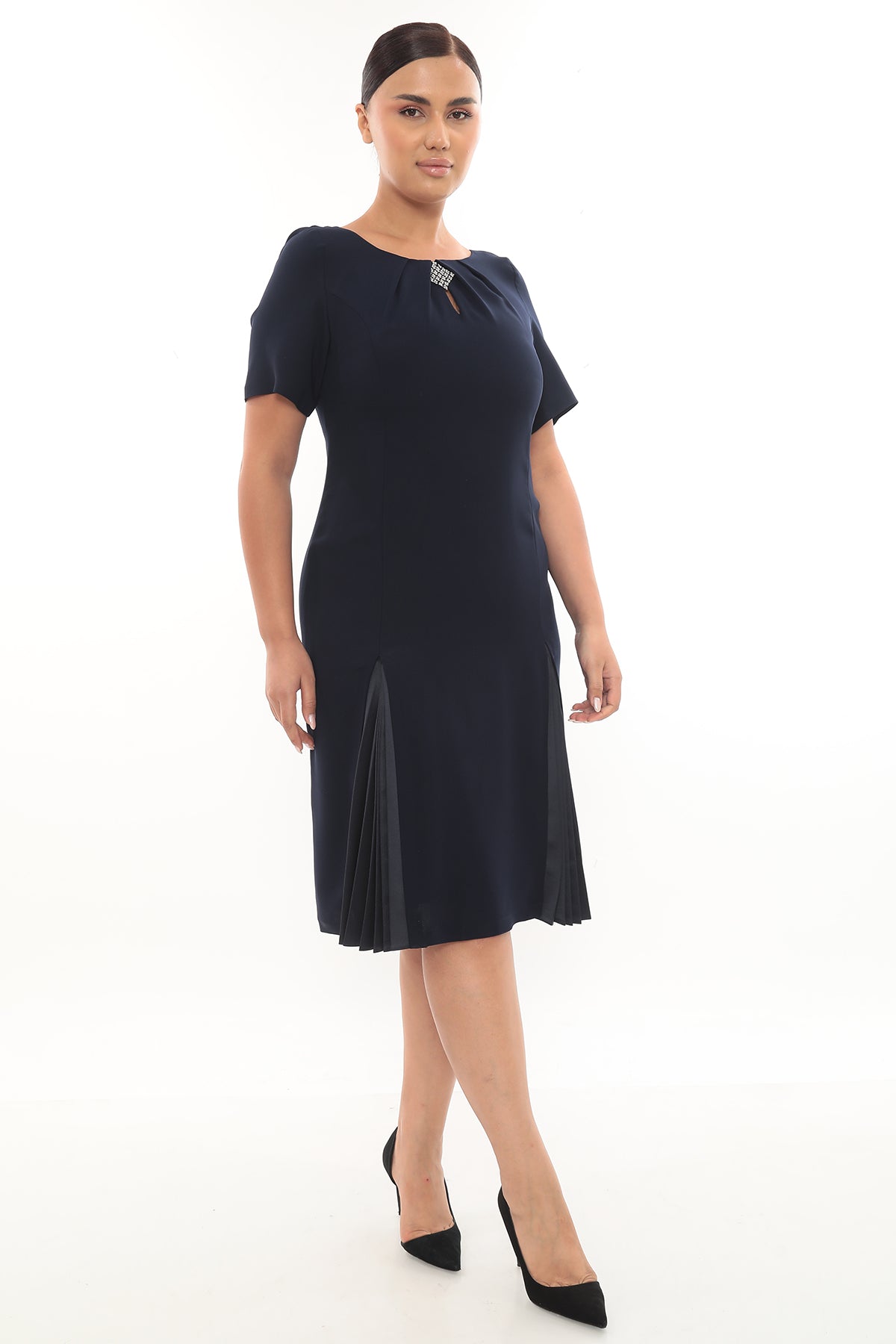 Zarif, sade ama fark yaratan bir elbise arıyorsanız bu model tam size göre! Kısa kollu, lacivert midi elbise; göğüs kısmındaki taş detaylı minik pencere ve etek ucundaki pile detayları ile hem klasik hem de modern bir stil sunuyor. Kumaş yapısı vücudu nazikçe sararak şıklığı konforla buluşturuyor. İş toplantılarından akşam yemeklerine kadar birçok ortamda rahatlıkla tercih edebilirsiniz.