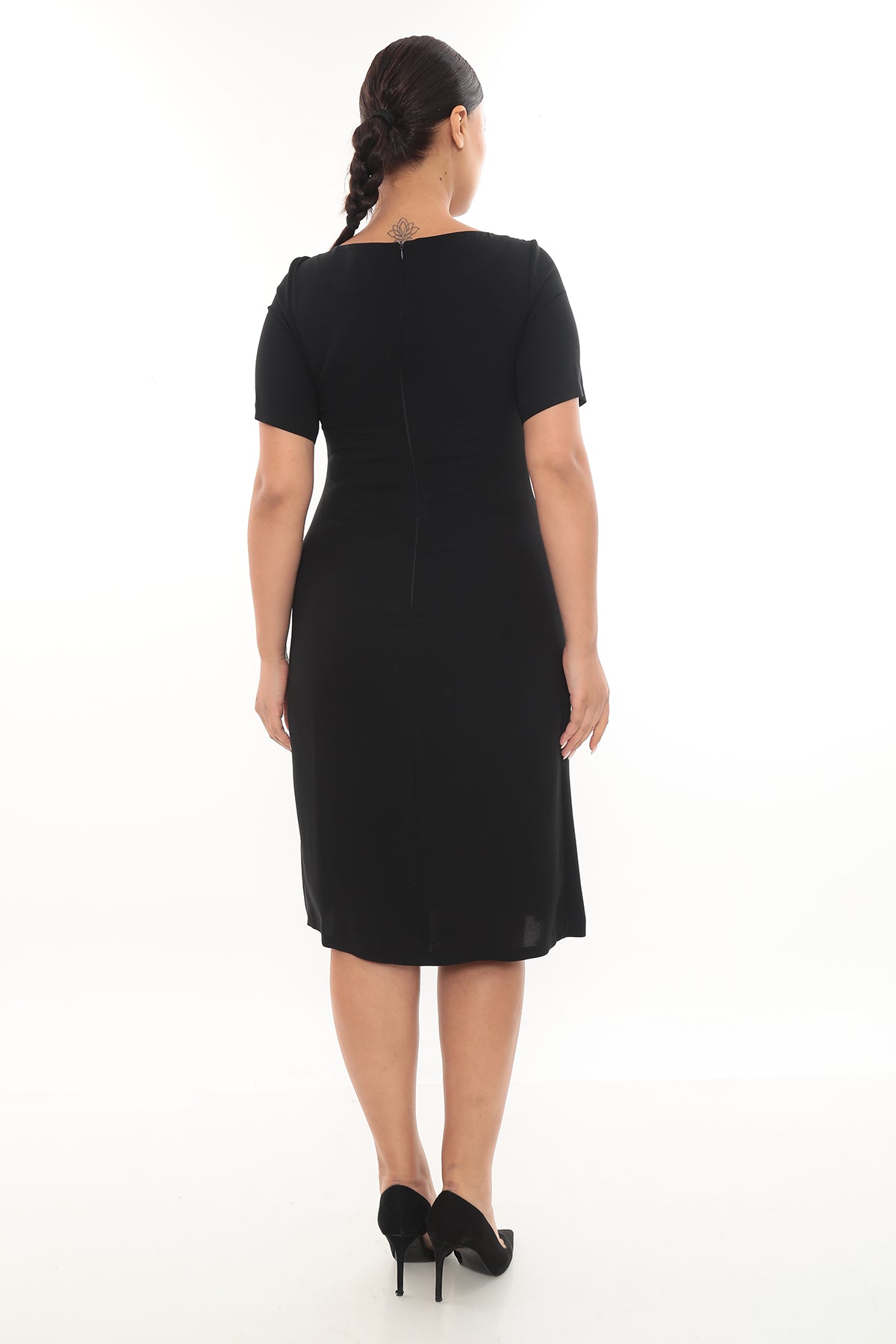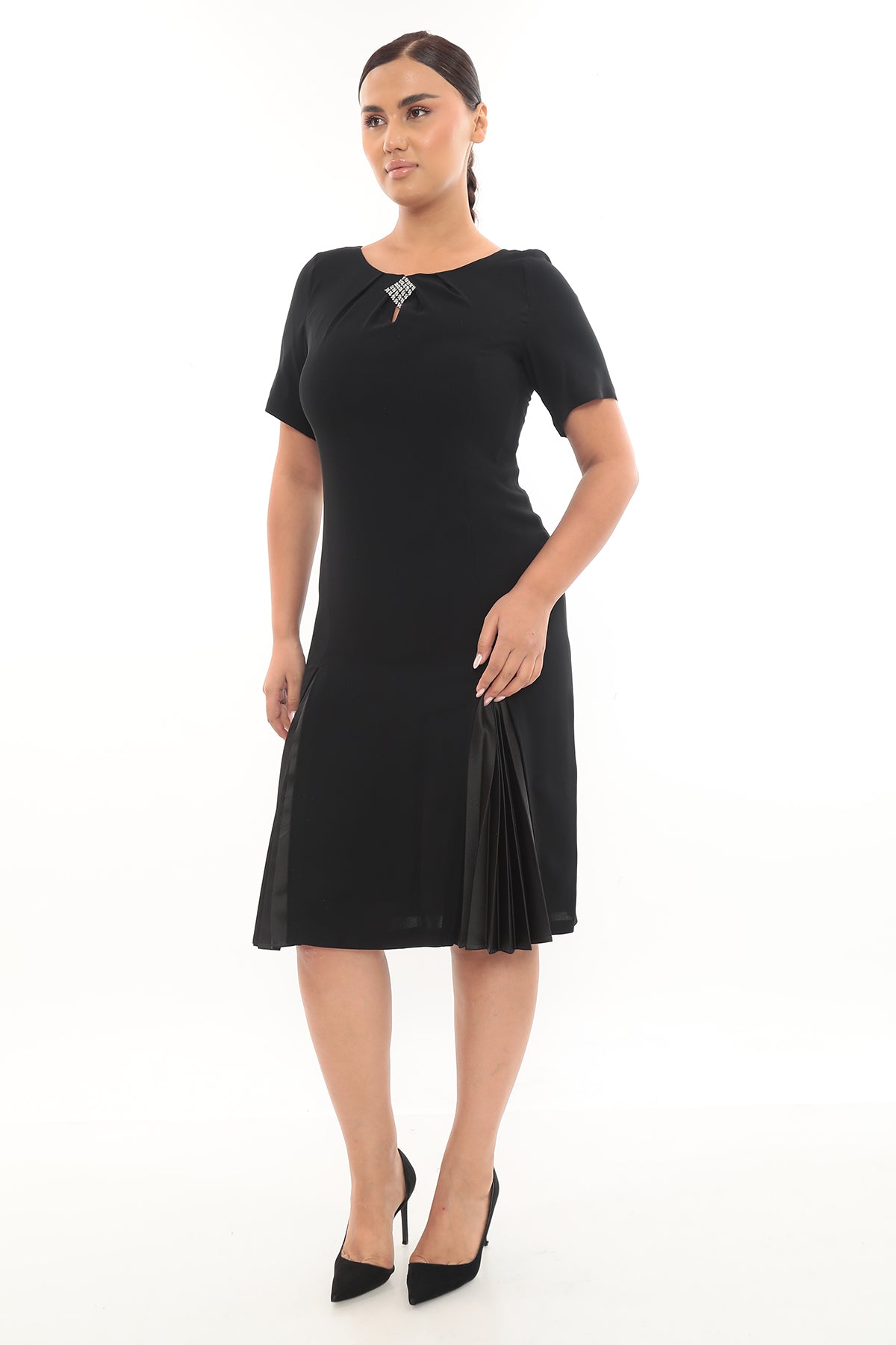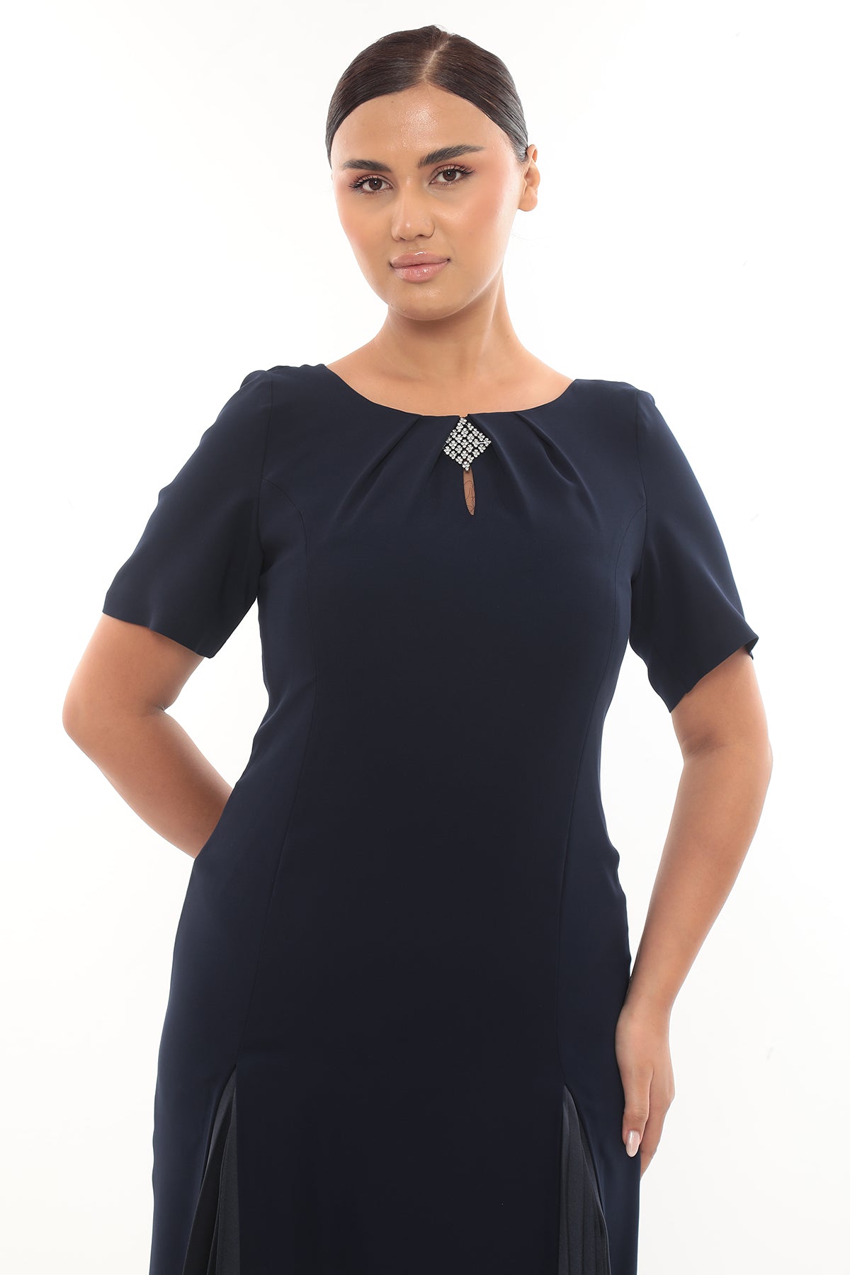 Zarif, sade ama fark yaratan bir elbise arıyorsanız bu model tam size göre! Kısa kollu, lacivert midi elbise; göğüs kısmındaki taş detaylı minik pencere ve etek ucundaki pile detayları ile hem klasik hem de modern bir stil sunuyor. Kumaş yapısı vücudu nazikçe sararak şıklığı konforla buluşturuyor. İş toplantılarından akşam yemeklerine kadar birçok ortamda rahatlıkla tercih edebilirsiniz.