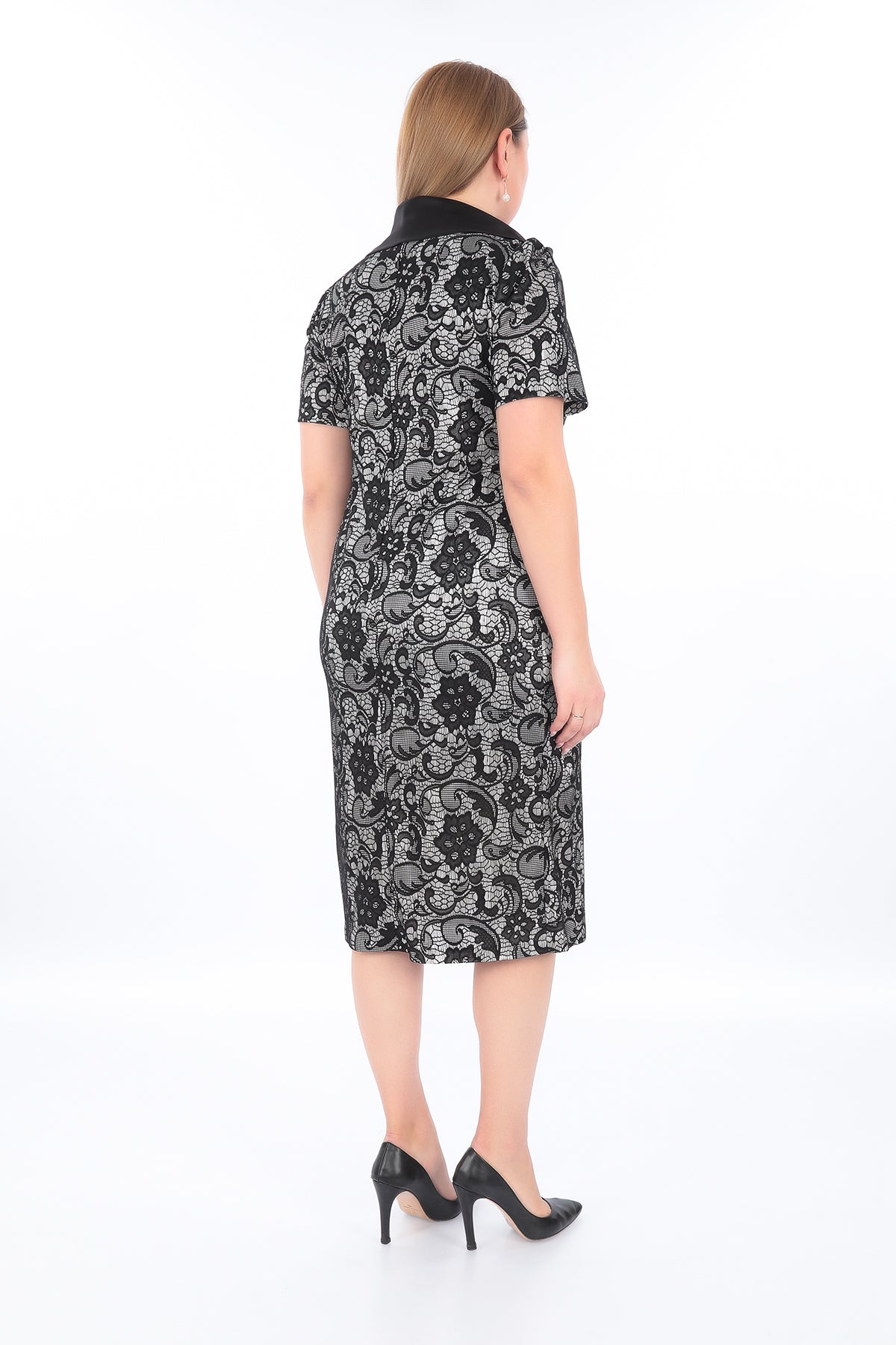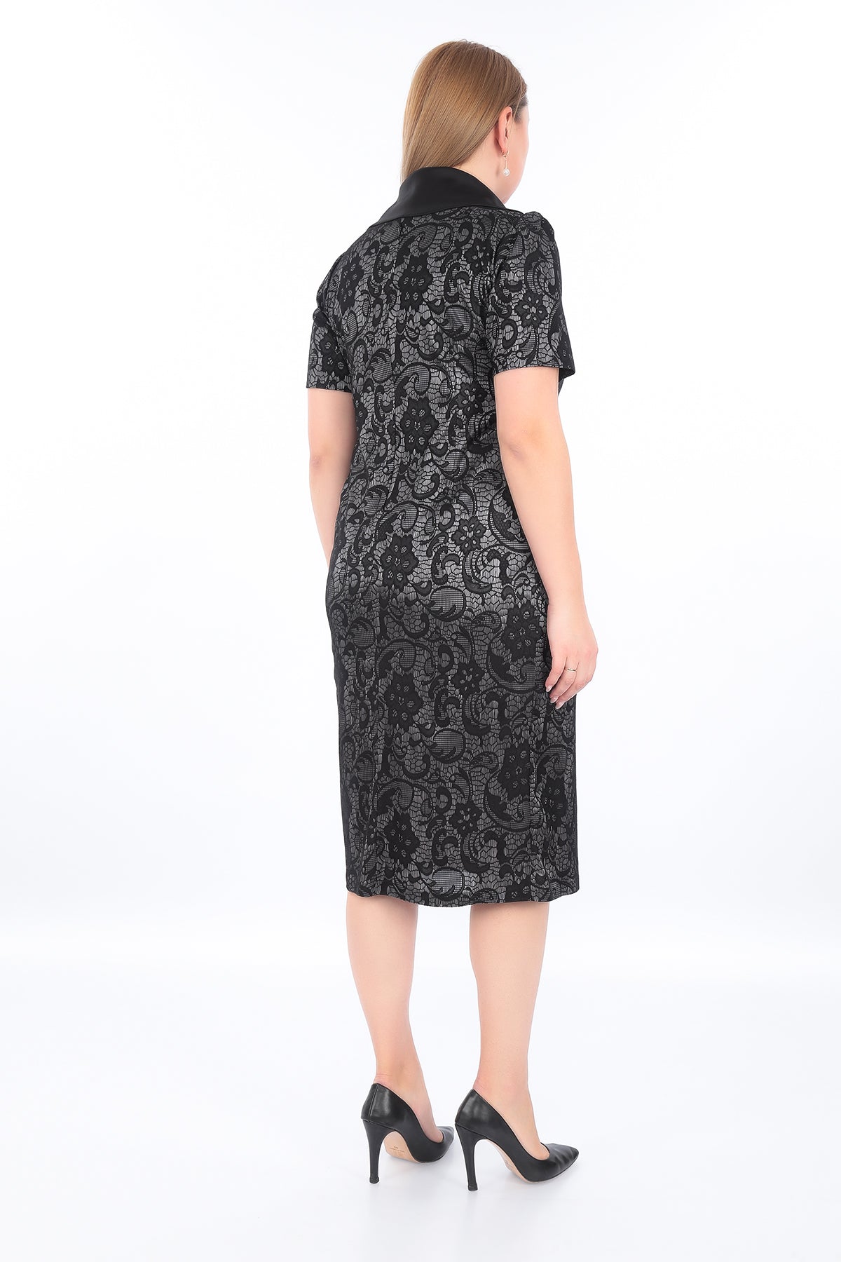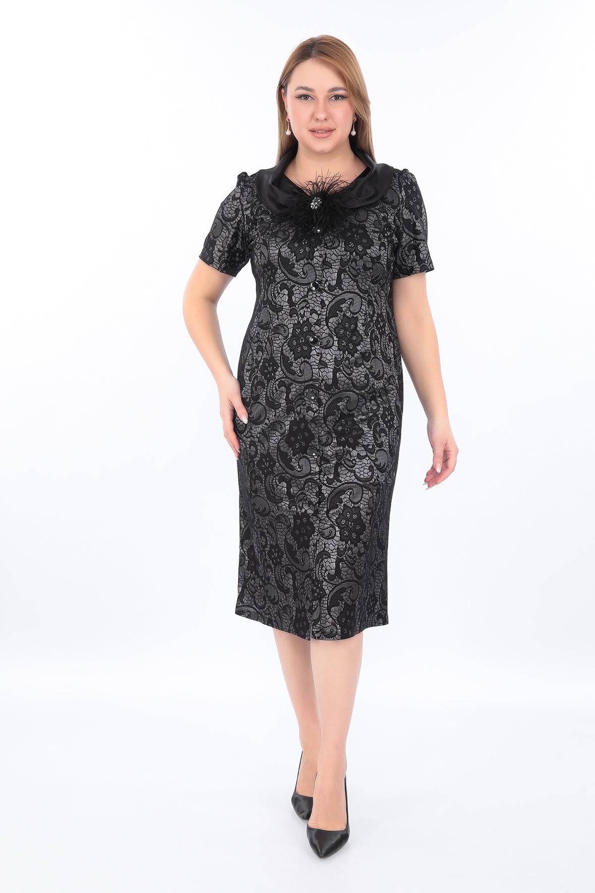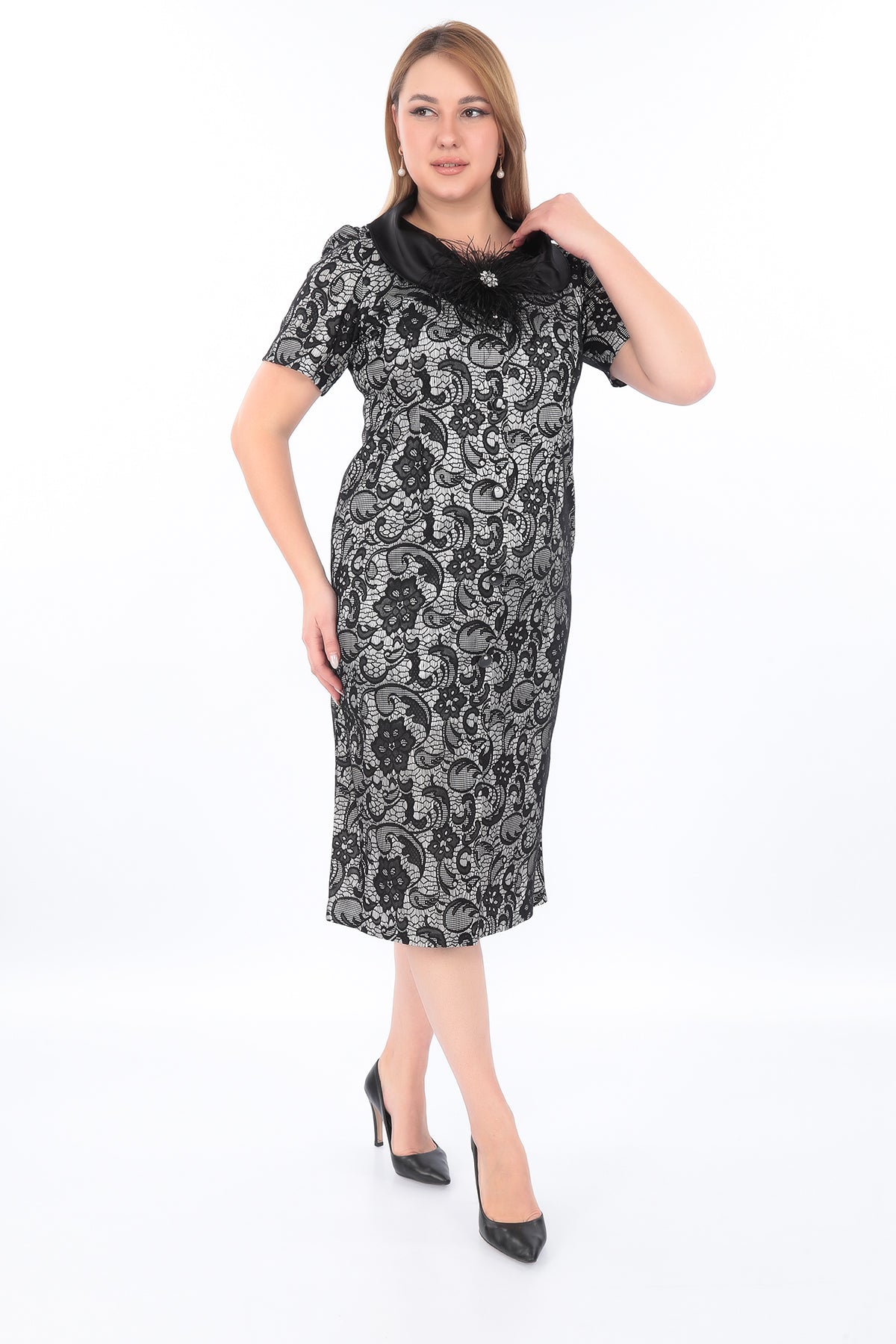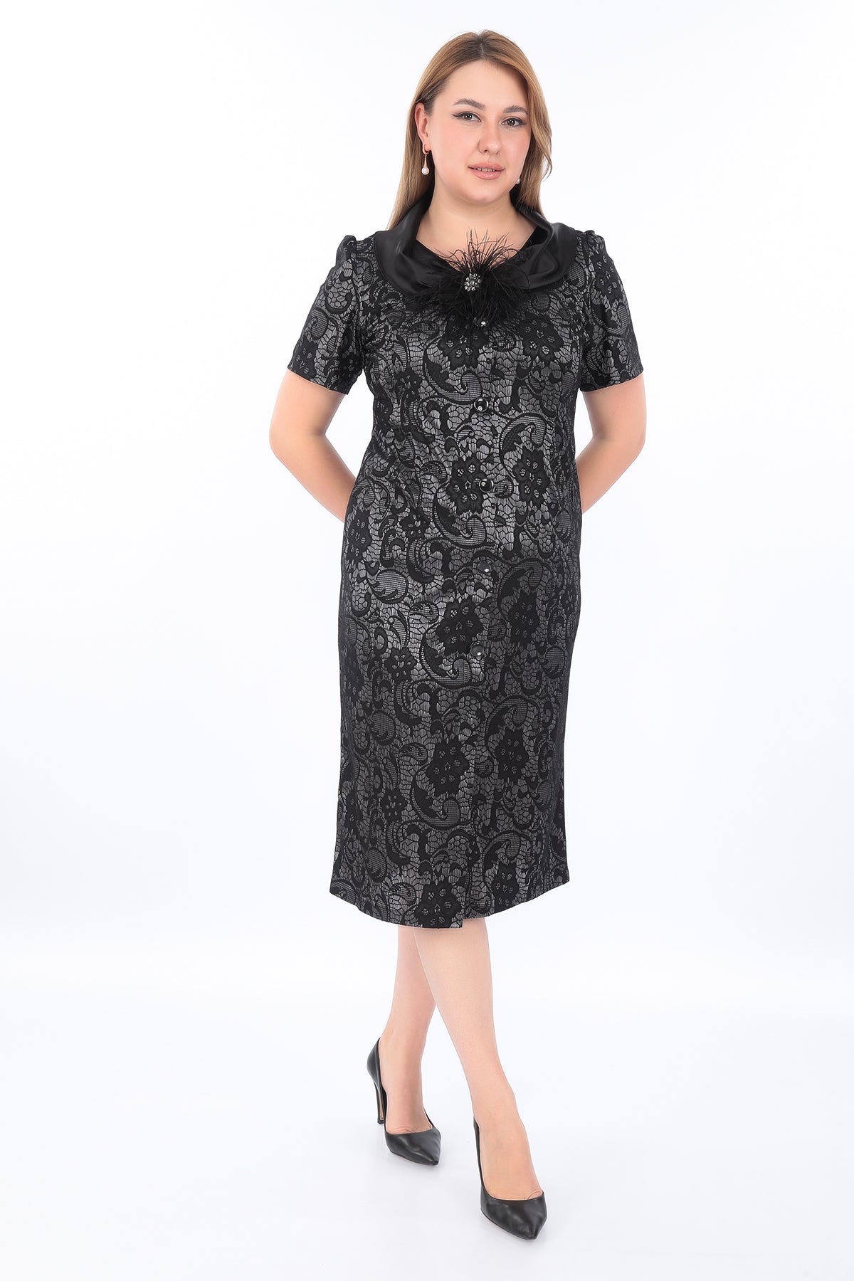 Gösterişli saten yakası, ortasında yer alan inci taşlı broş detayı ve modern dantel görünümlü deseni ile fark yaratır. Vücuda oturan kalıbı, diz altı boyu ve esnek kumaşı sayesinde hem şık hem de konforludur.