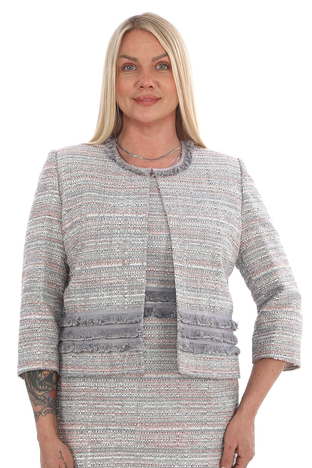 Klasik şıklığın temsilcisi olan bu gri takım, kısa ceket ve Elbise uyumuyla hem iş hayatında hem davetlerde zarif bir stil sunar.