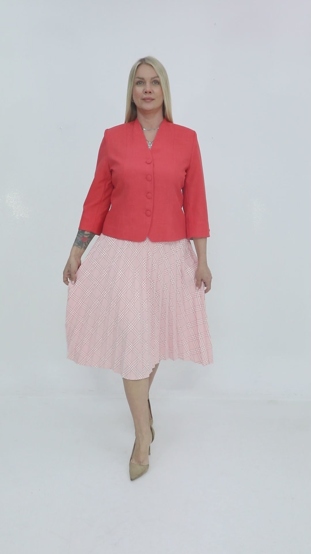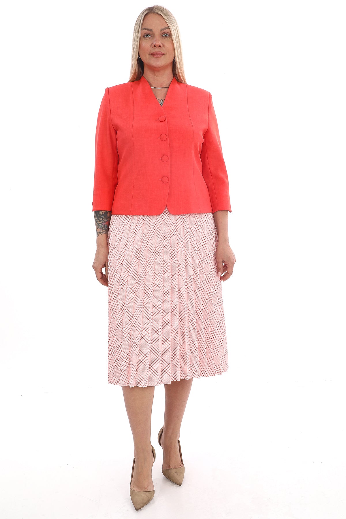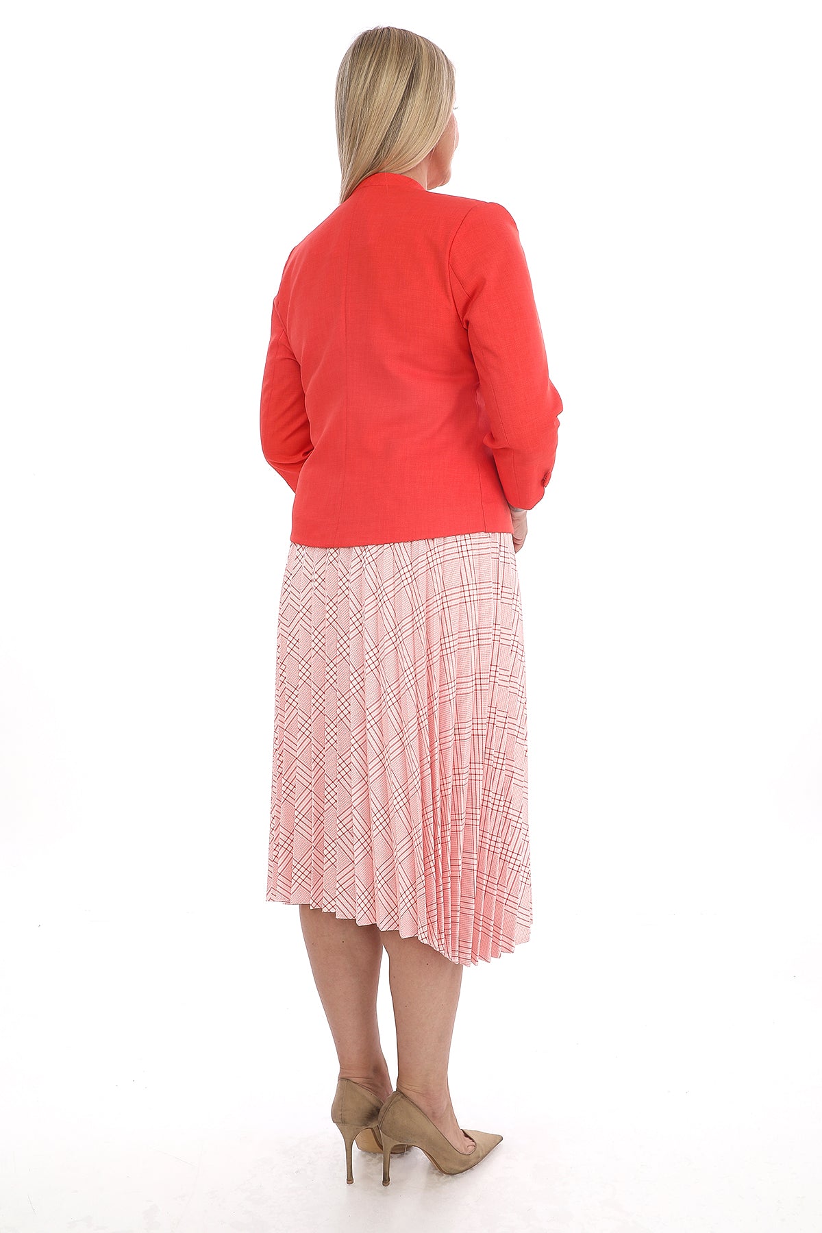 Mercan ceket ve desenli pileli etek kombininden oluşan bu takım, zarif ve sofistike bir görünüm sunar. Ofis şıklığı ve özel davetler için ideal tercihtir.