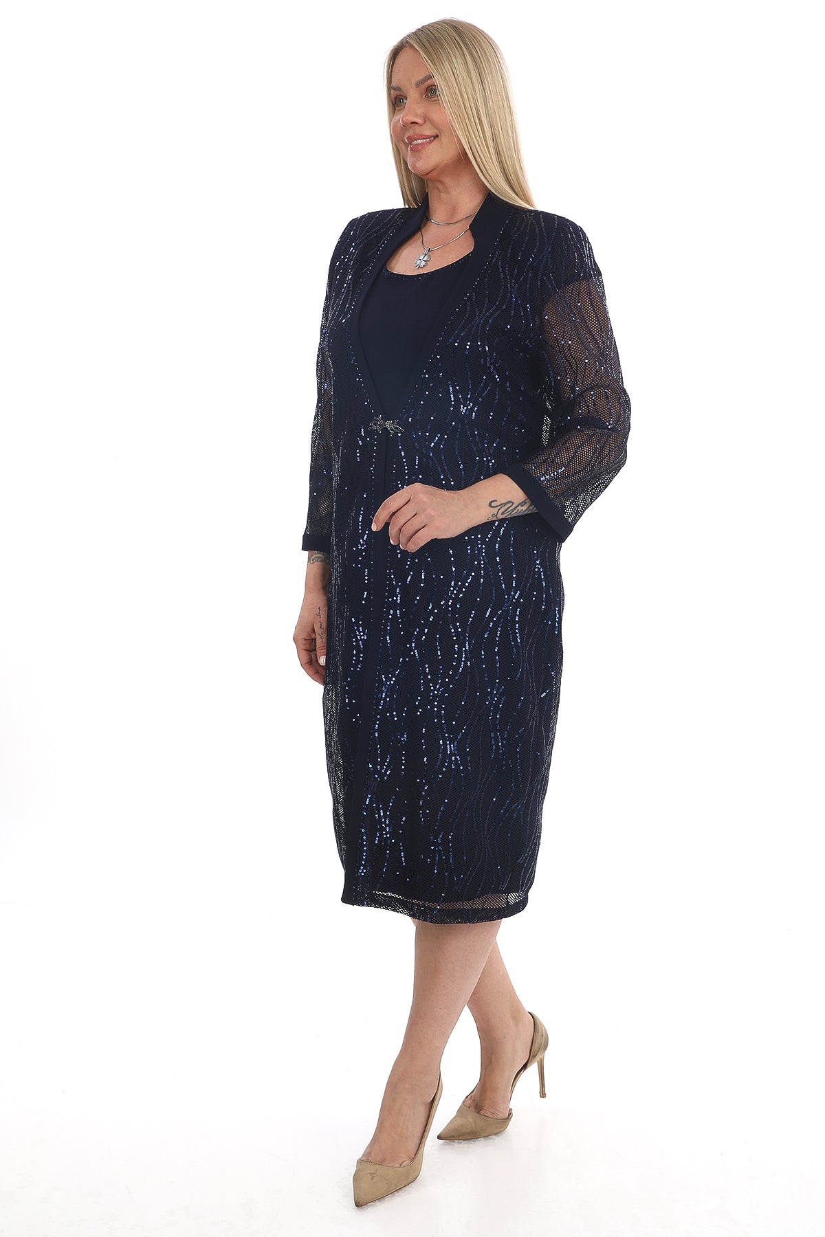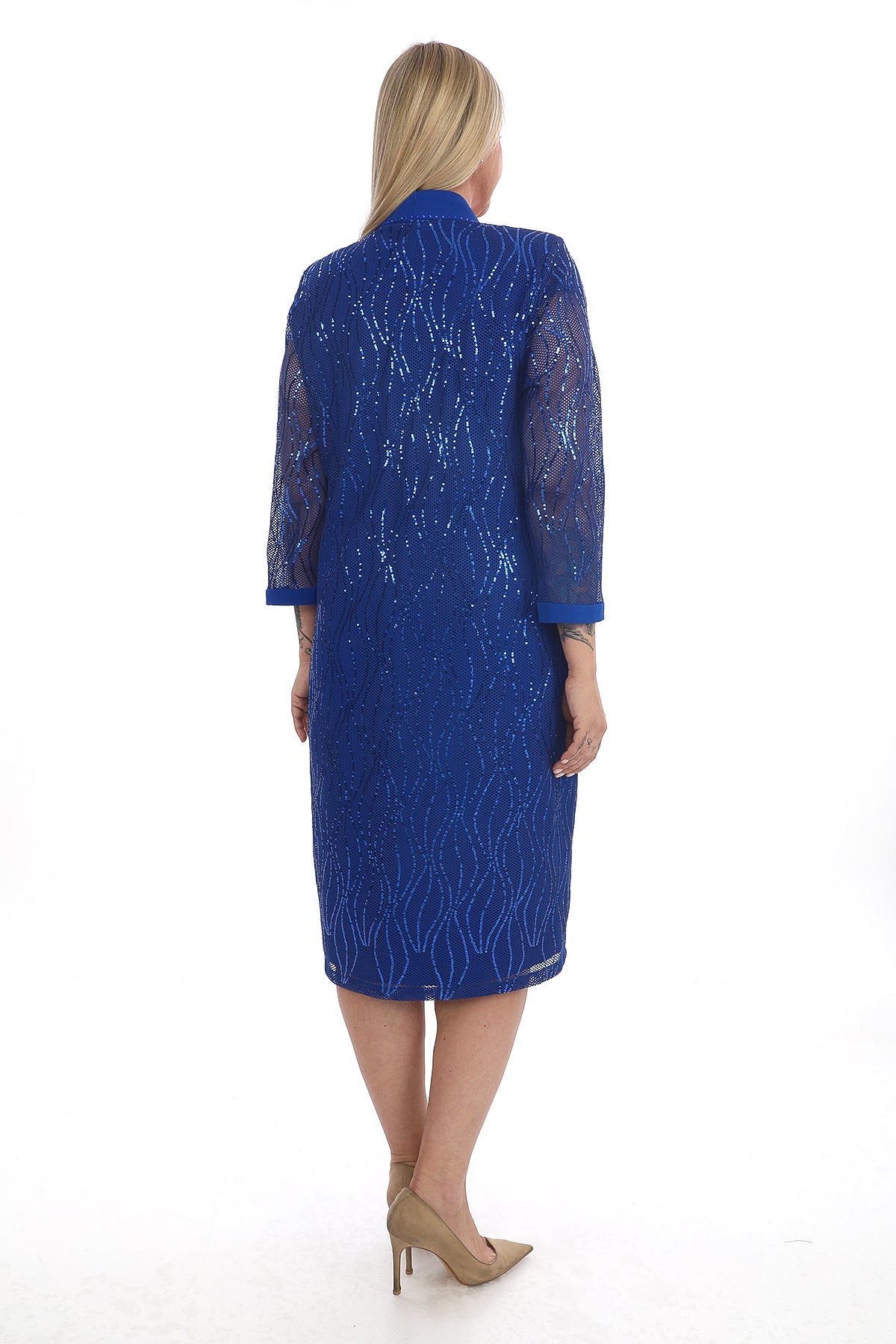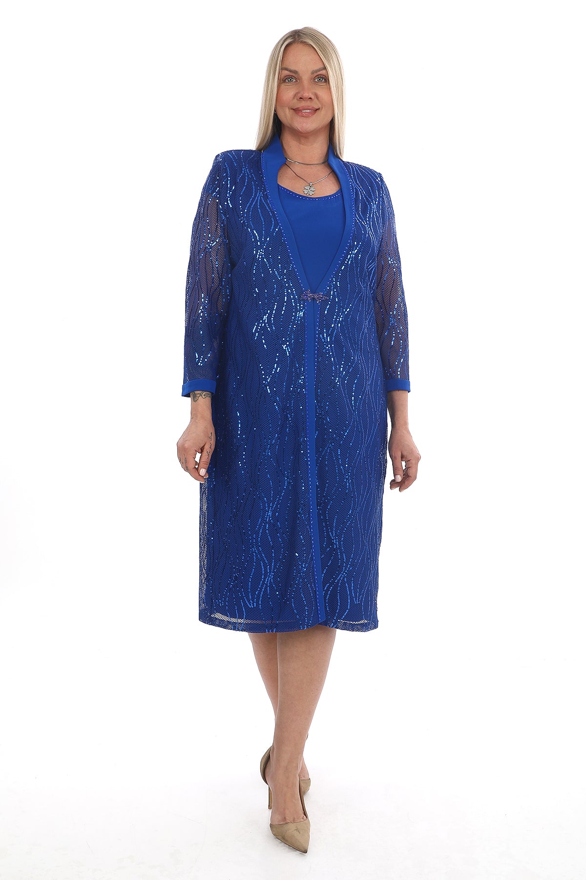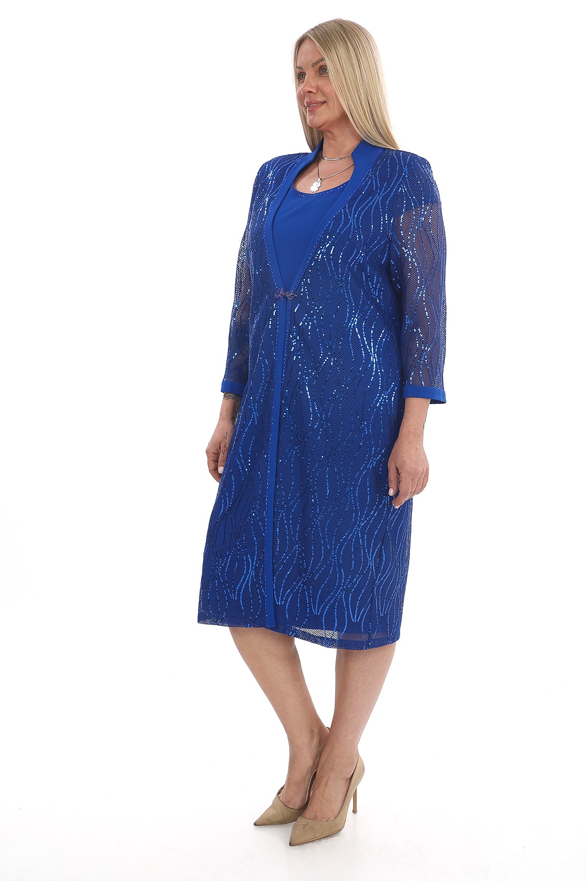 Göz alıcı şıklığı ve rahatlığı bir arada sunan saks mavisi ikili takım, sim işlemeli uzun ceketi ve düz elbisesiyle özel günler için mükemmel bir seçimdir. Modern çizgileri ve parıltılı detayları ile hem şık hem de konforlu bir kullanım sağlar.