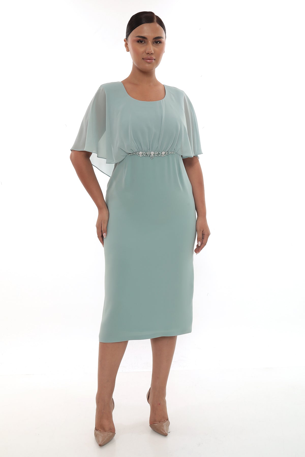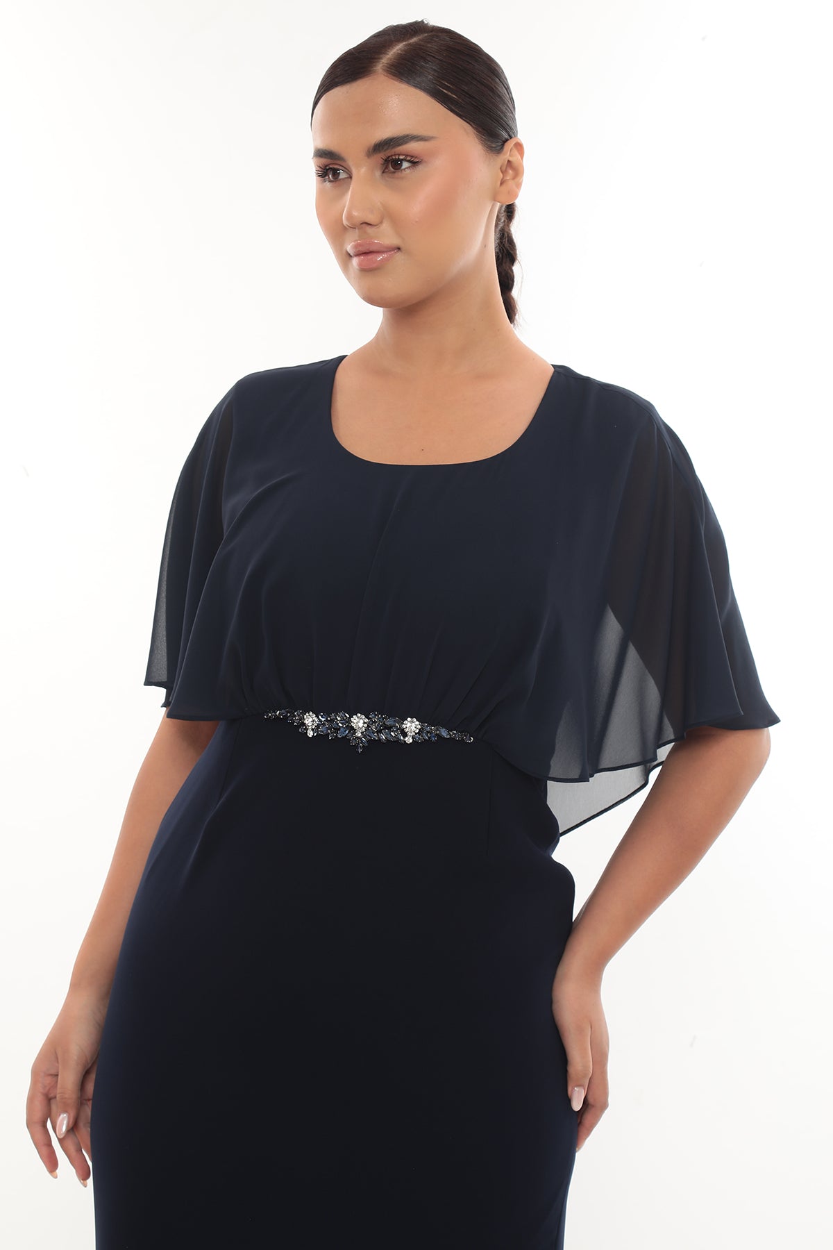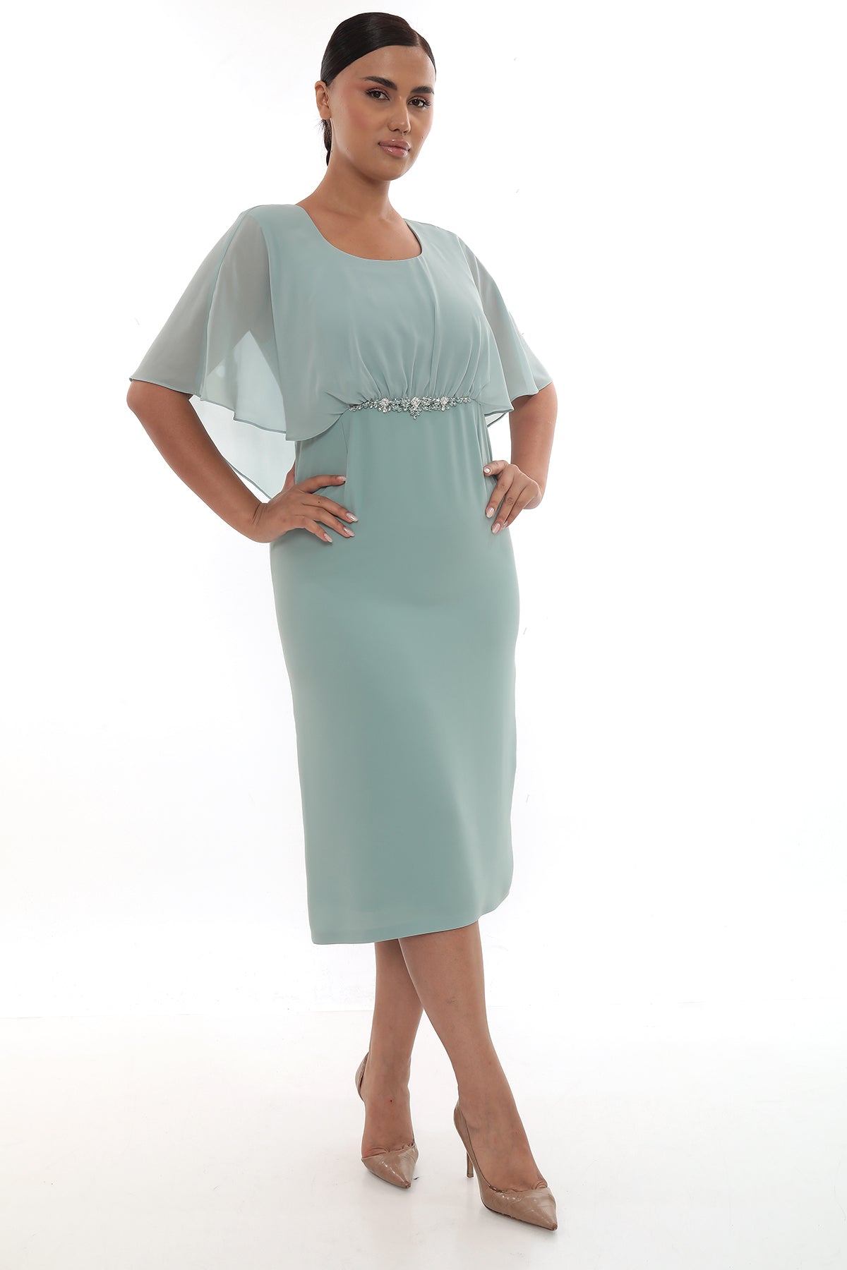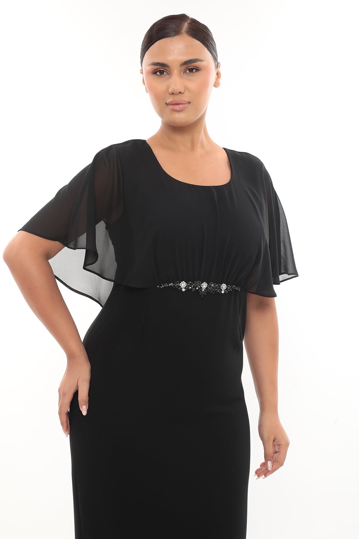Ürün Açıklaması: Zarif taş detayı ve şifon kollarıyla dikkat çeken elbise, nişan, söz ve özel davetler için şık bir seçimdir.