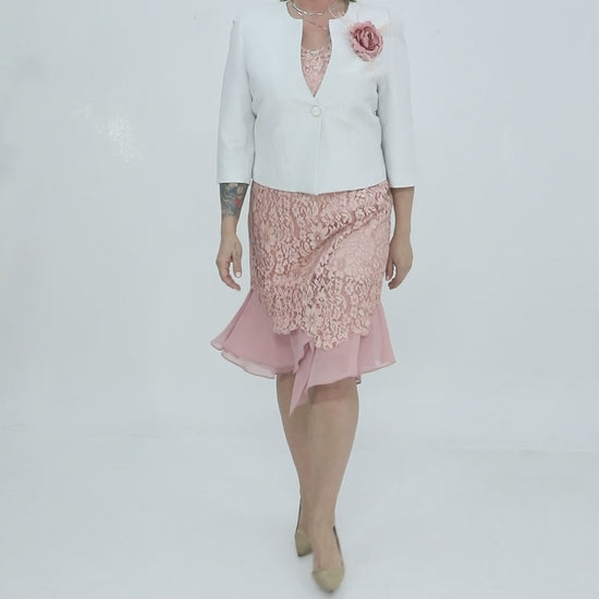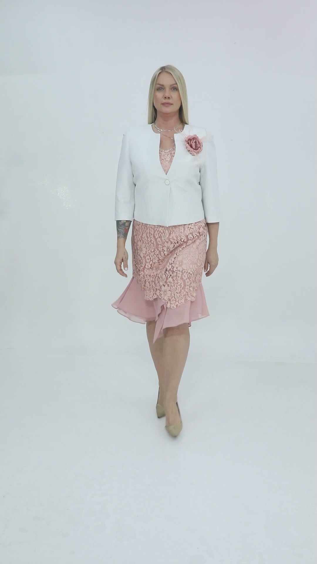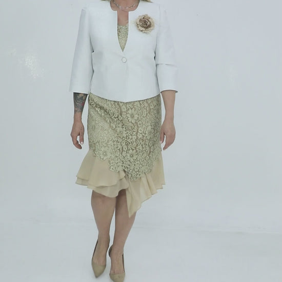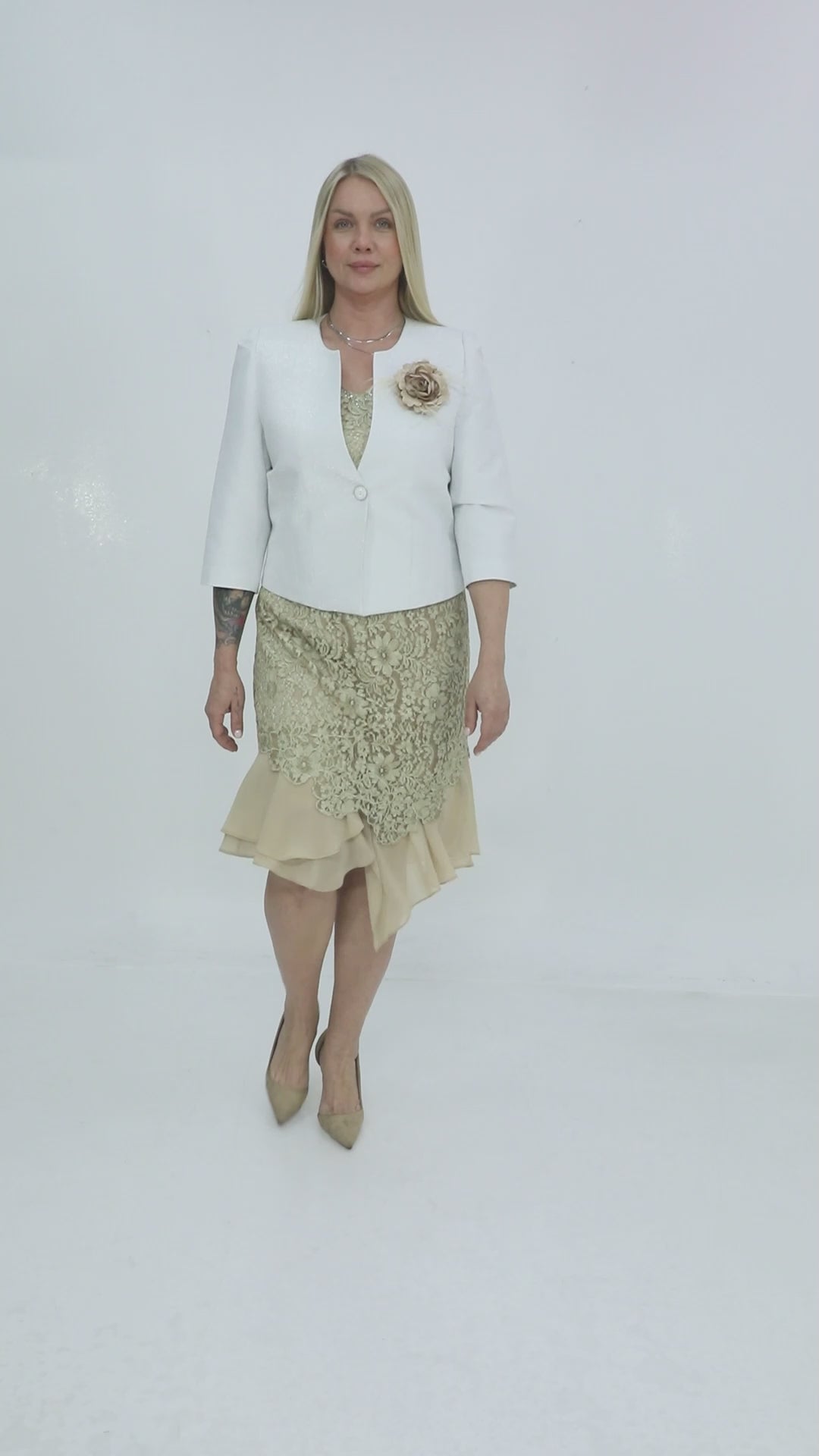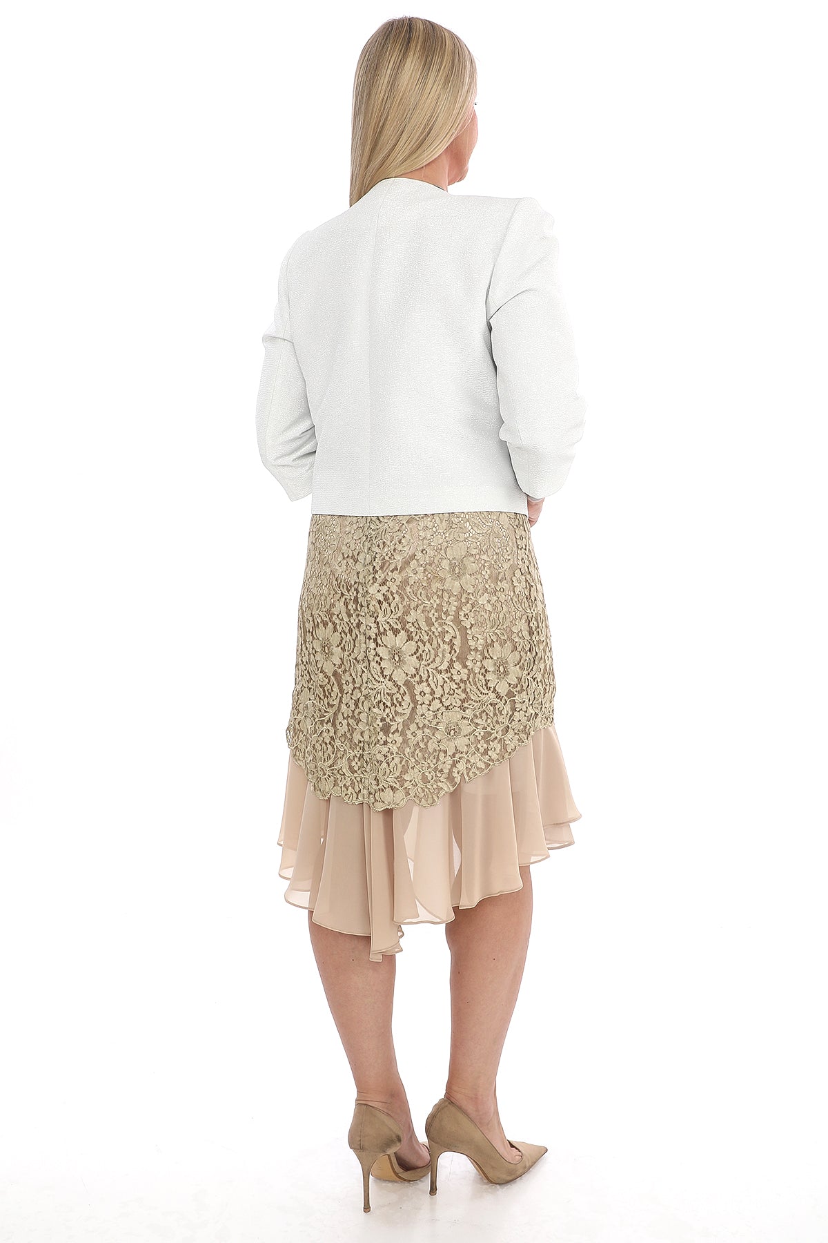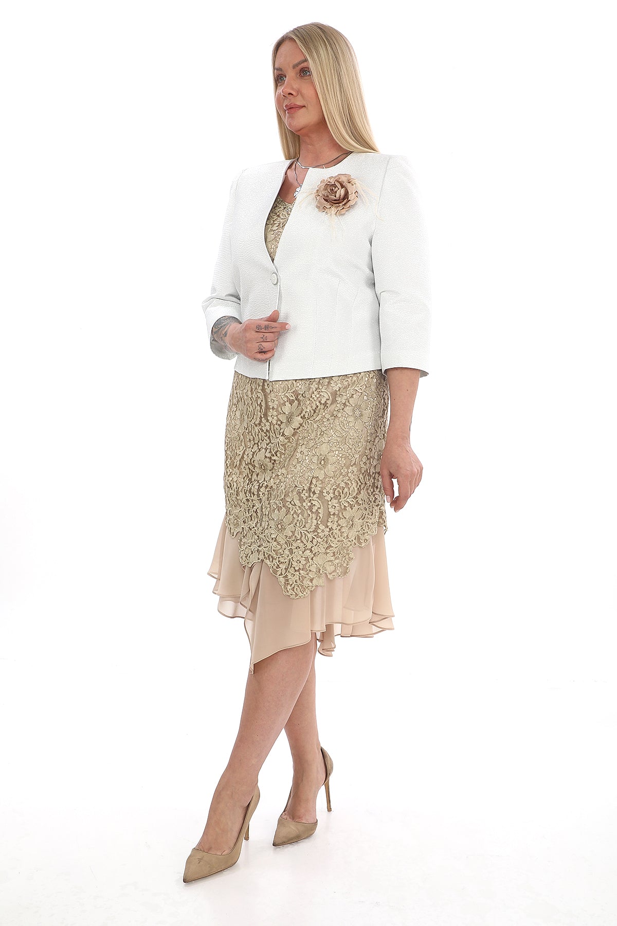 Renk: Kırık beyaz (ceket), altın-bej tonlarında dantel elbise