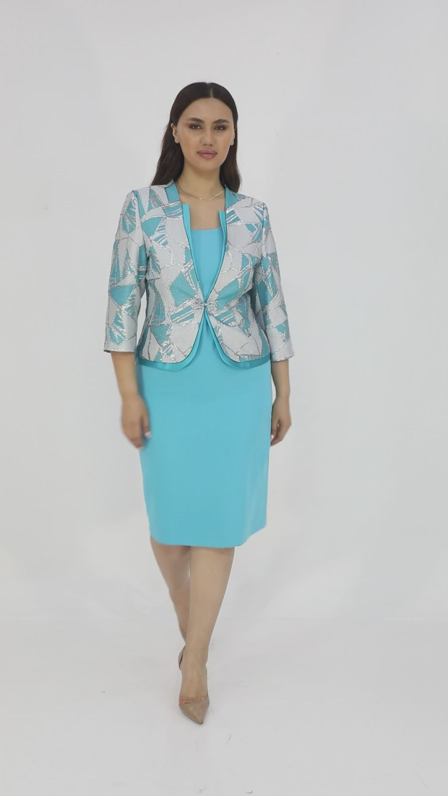 Canlı turkuaz tonlarıyla dikkat çeken bu ikili takım, enerjik ve şık görünümü bir arada sunar. Modern desenli ceket, sade elbiseyle mükemmel uyum sağlayarak göz alıcı bir kombin oluşturur. Yaz davetlerinde ve özel günlerde şıklığıyla öne çıkmak isteyenler için ideal bir seçenektir.