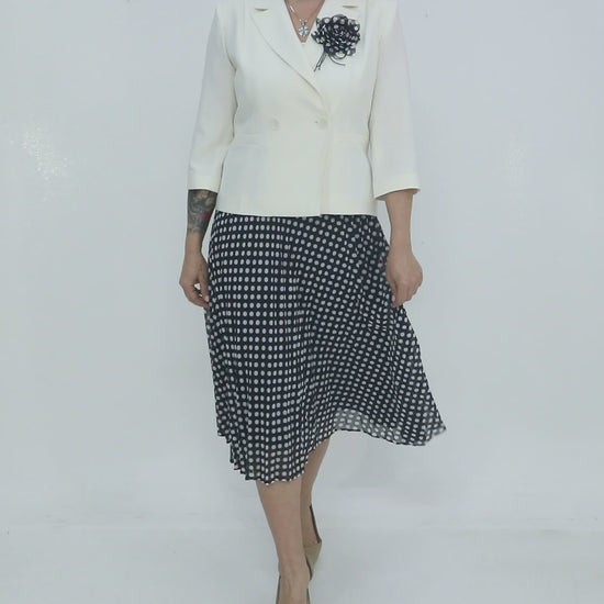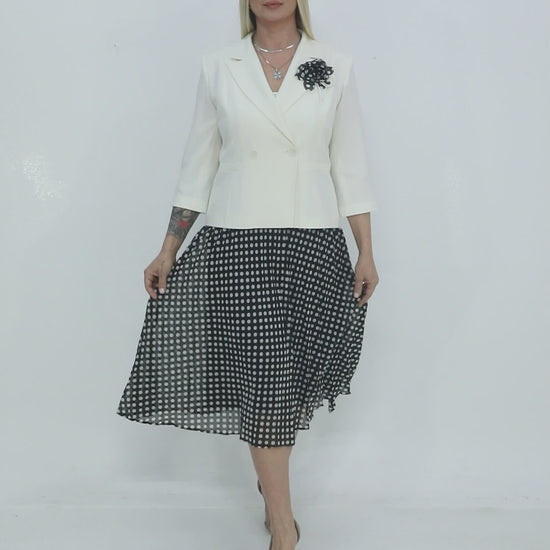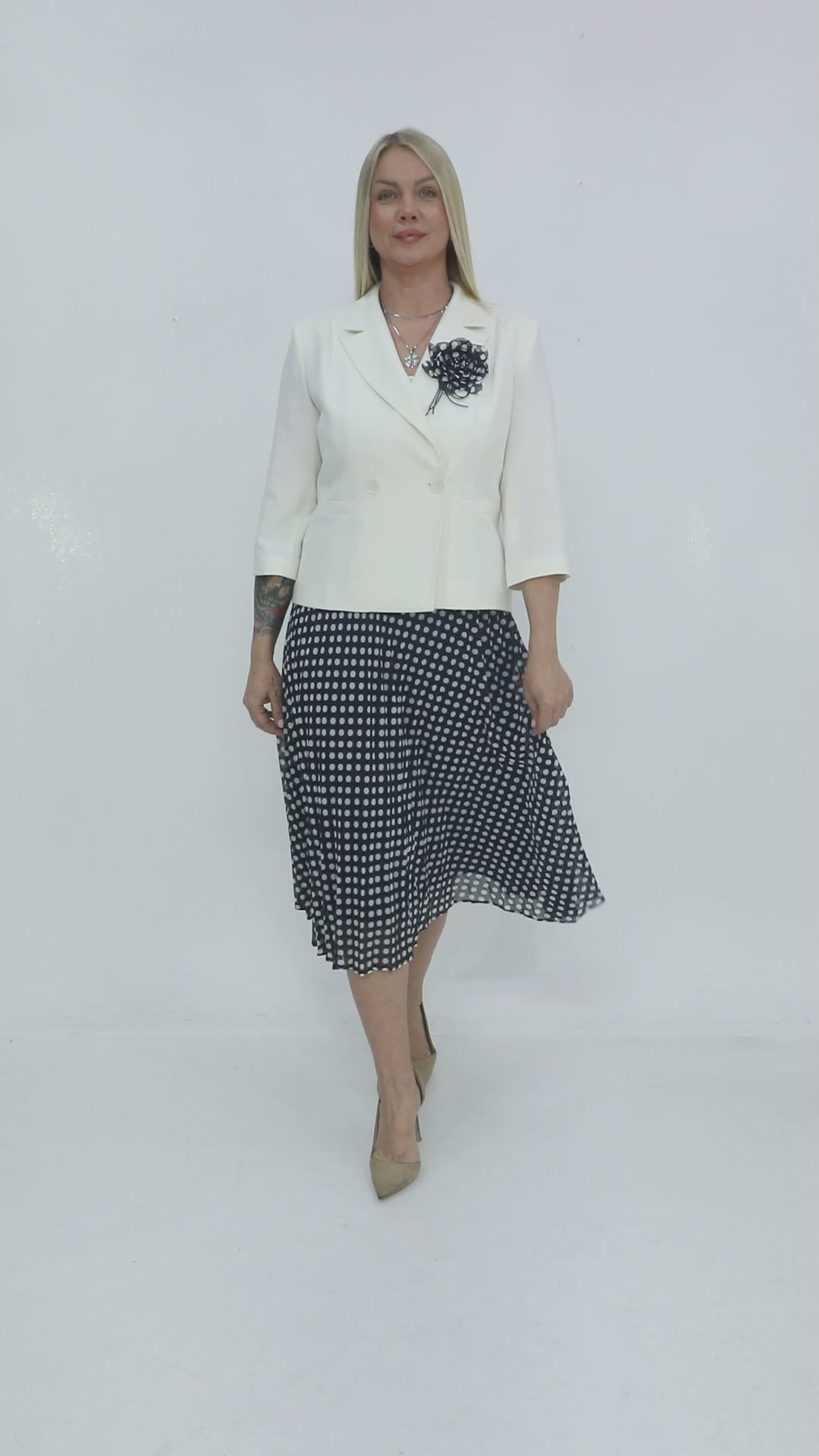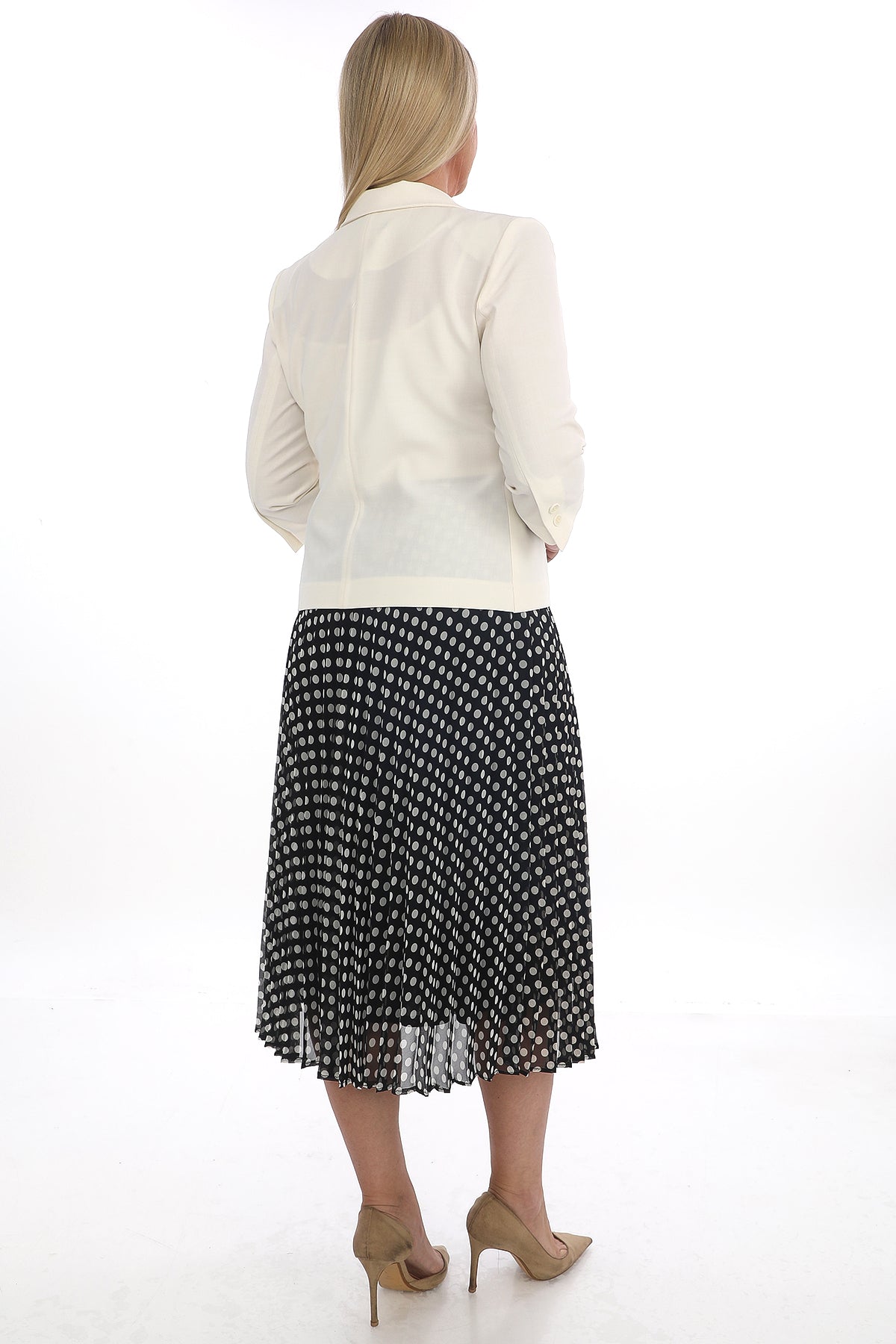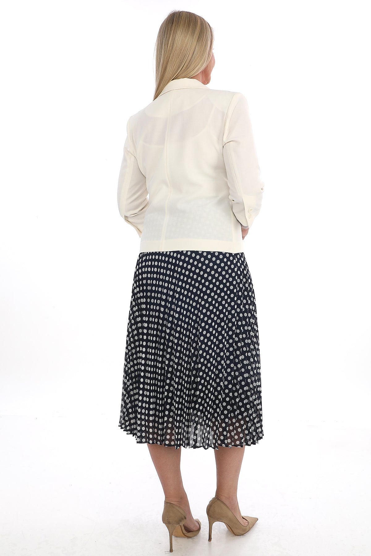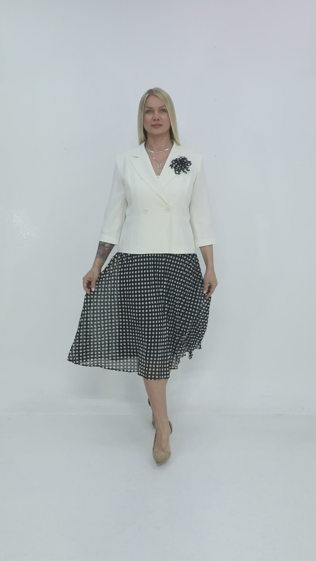 Klasik pileli şifon etek, dökümlü yapısıyla feminen bir siluet oluştururken; desenli kruvaze blazer ceket ise güçlü bir duruş kazandırır.