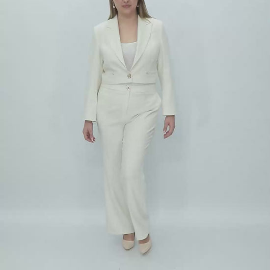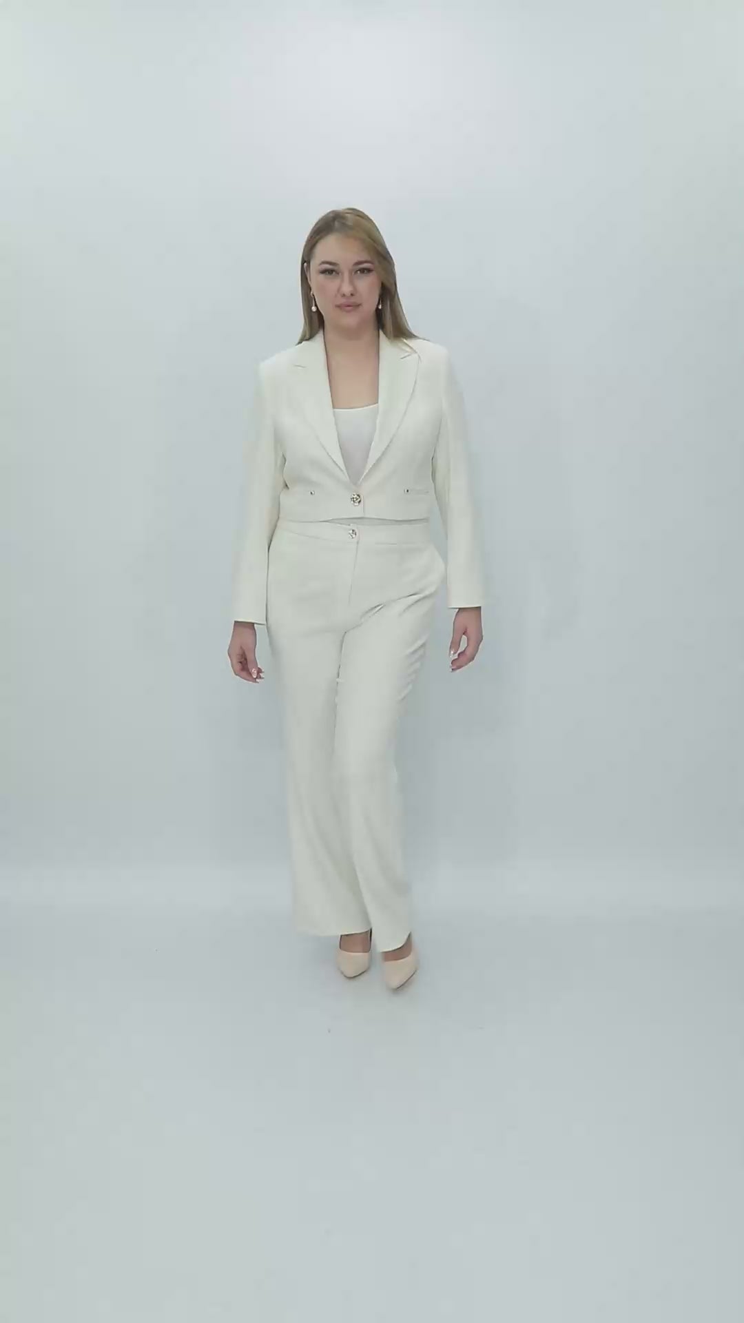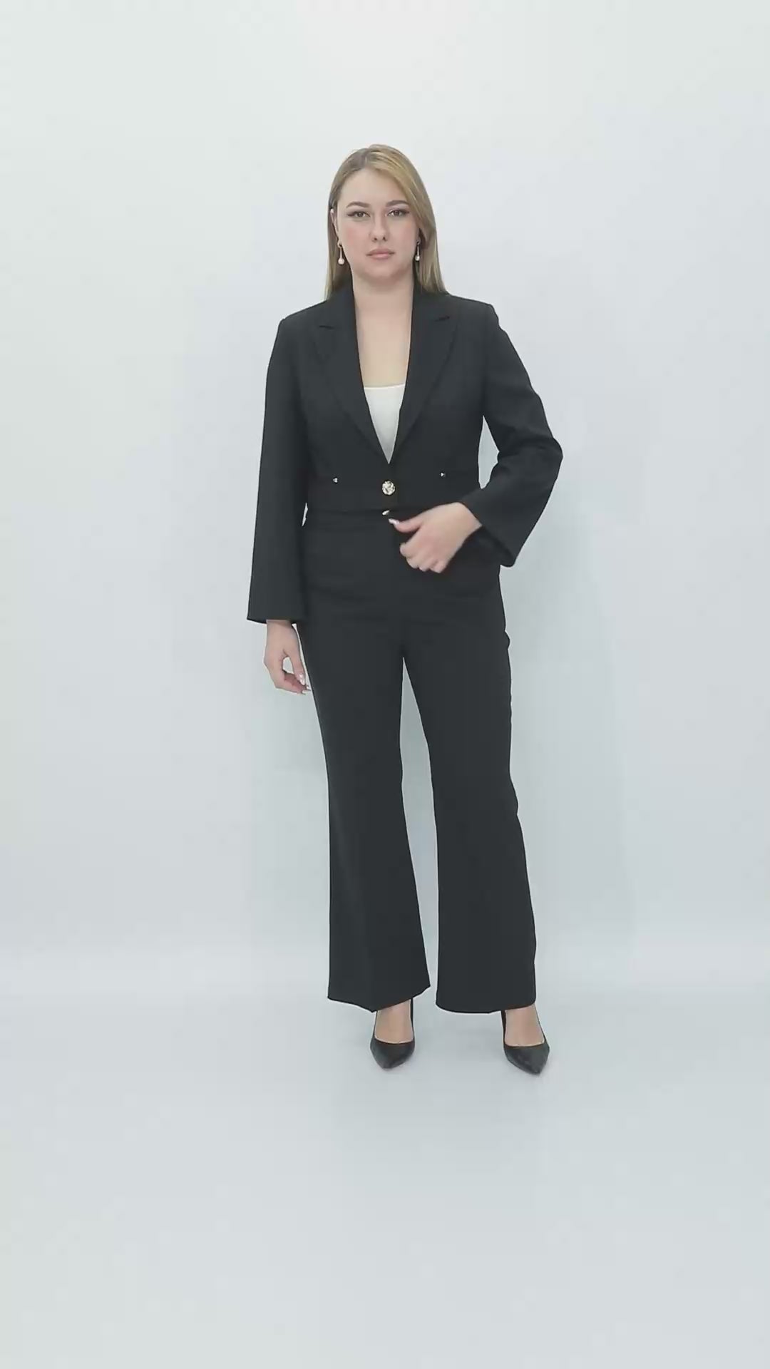 - Pantolon: Yüksek bel, düz kesim, fermuarlı ve düğmeli kapanış