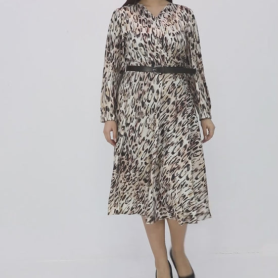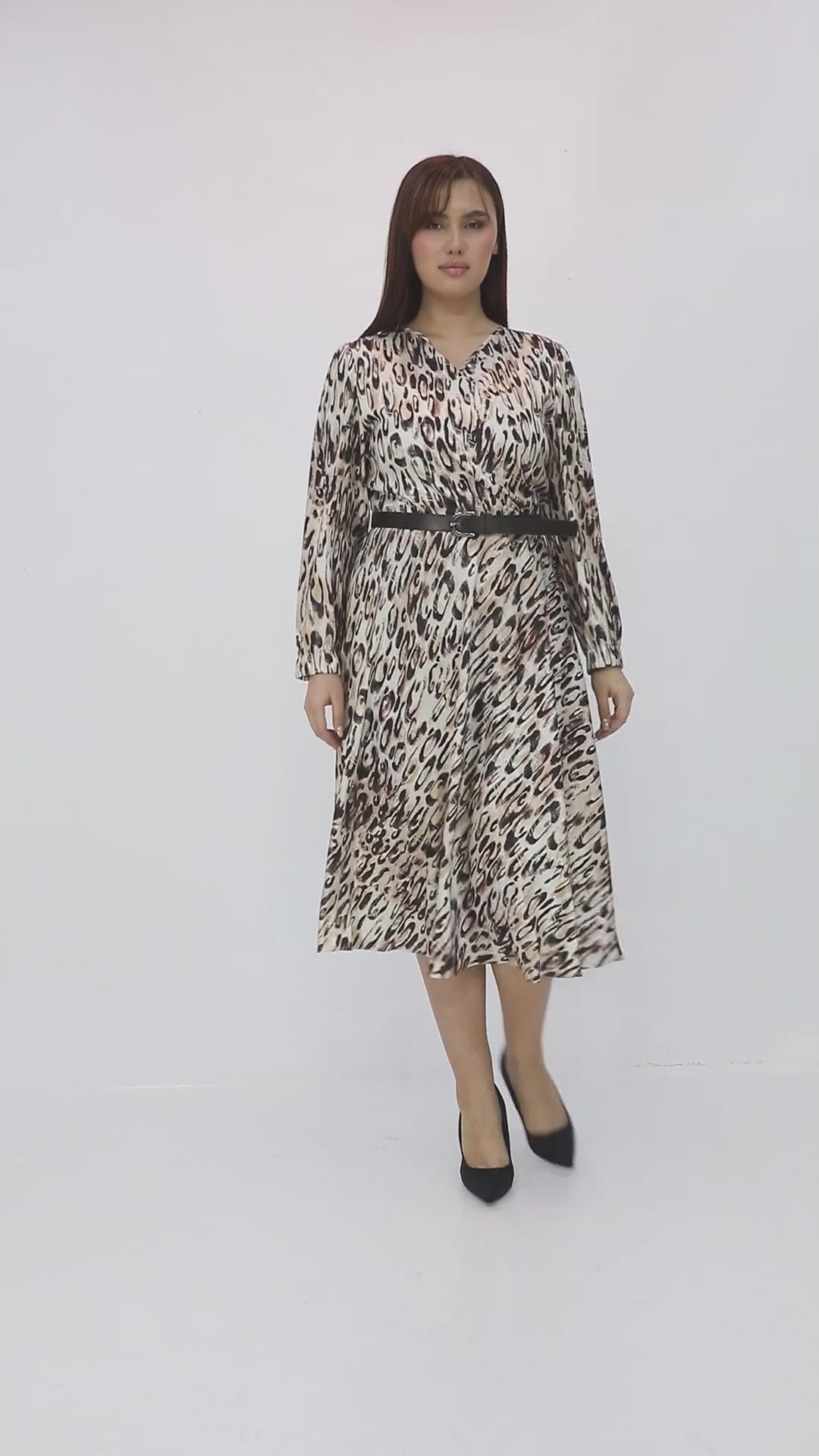 Leopar Desenli Kuşaklı V Yaka Midi Elbise
